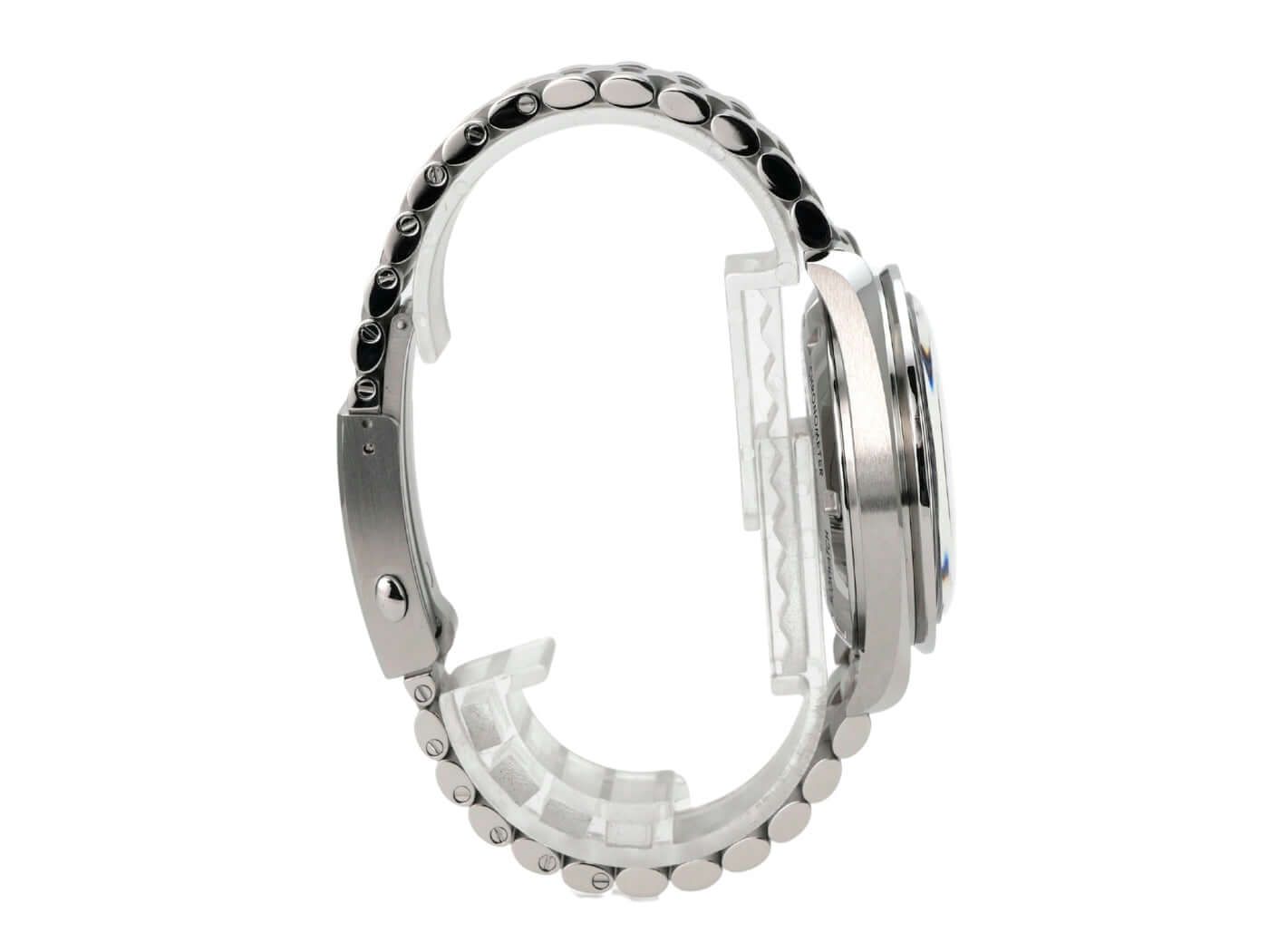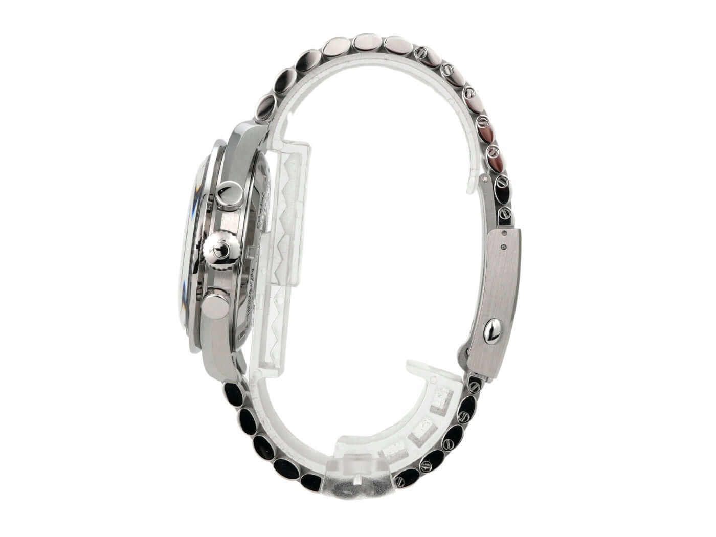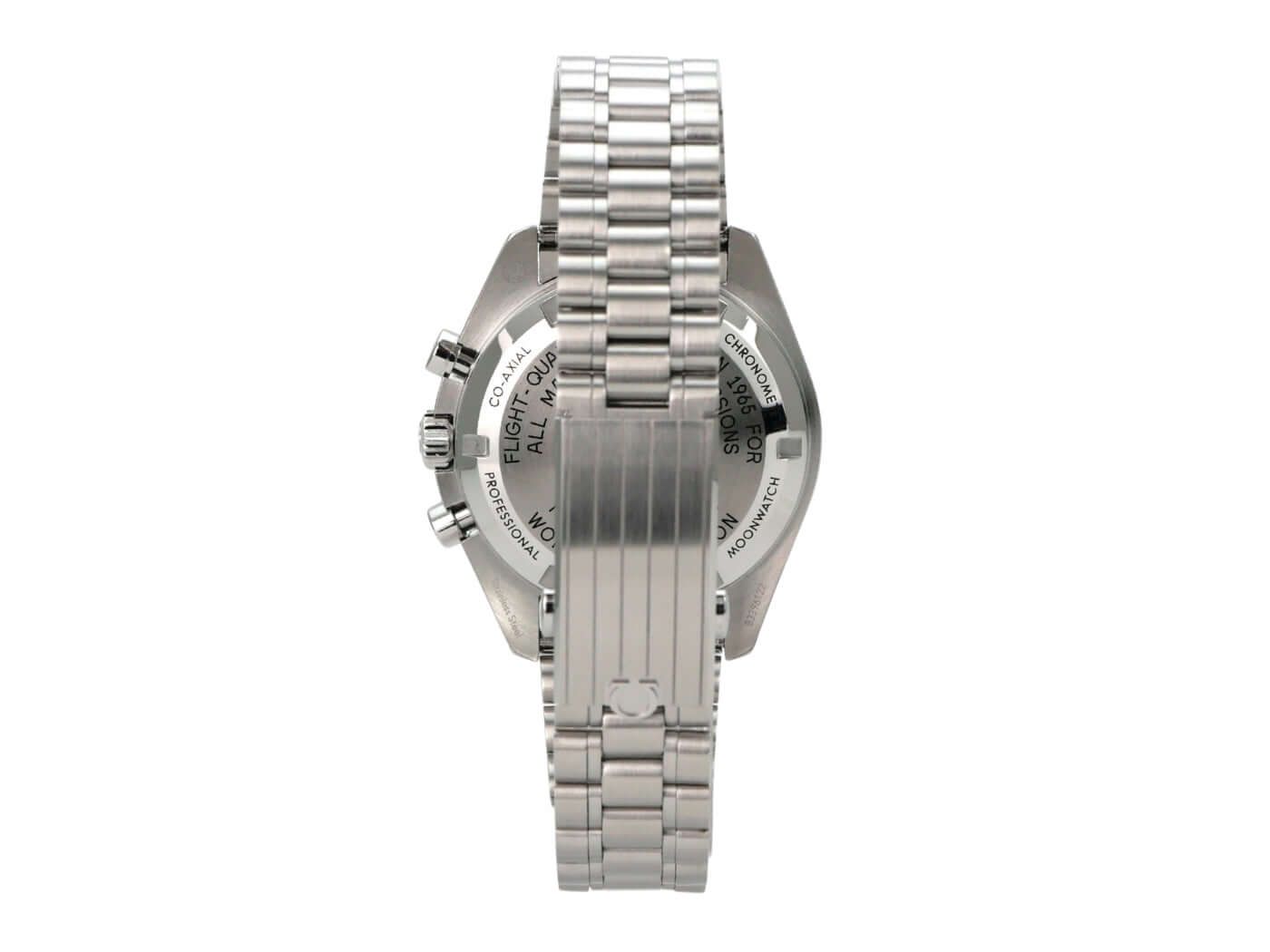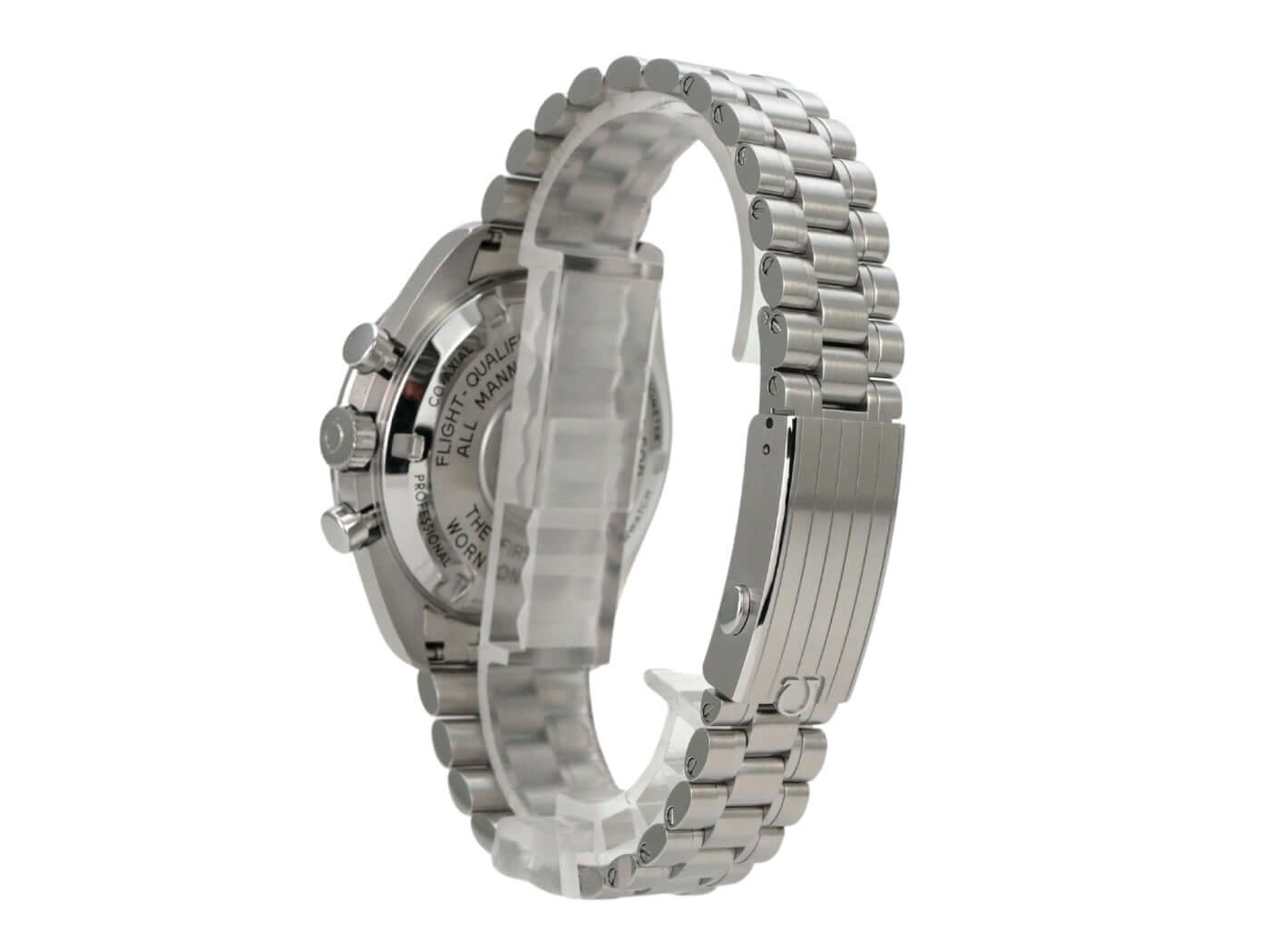 Caixa feita de aço inoxidável polido e acetinado, diâmetro da caixa de 42 mm, altura da caixa de 14,3 mm, bezel de aço inoxidável com inserto preto e escala taquimétrica, pulseira de aço inoxidável polida e acetinada com fecho de segurança dobrável, mostrador preto com índices luminosos aplicados, ponteiros luminosos, corda manual, calibre Omega 3861 com 26 rubis, 21.600 A/h, reserva de marcha de aproximadamente 50 horas, cronógrafo, Master Chronometer, cristal Hesalite, fundo da caixa de aço inoxidável rosqueado e gravado, resistente à água até 5 bar.
