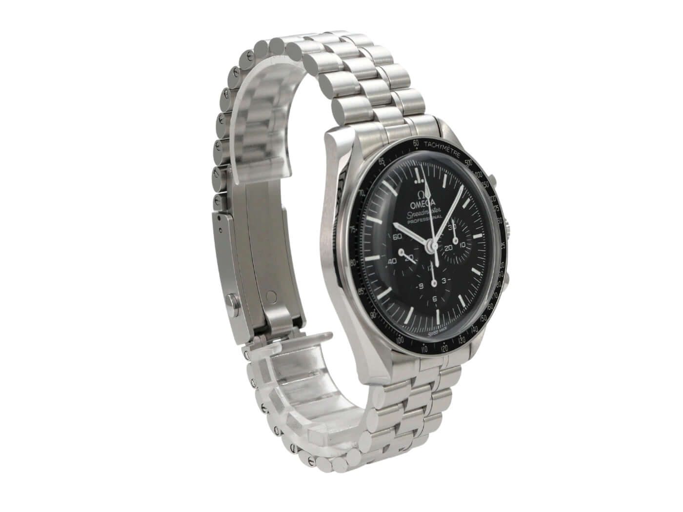 Omega Speedmaster Professional Moonwatch Ref. 310.30.42.50.01.001 from 2021Case made of polished and satin-finished stainless steel, case diameter 42 mm, case height 14.3 mm, stainless steel bezel with black insert and tachymeter scale, stainless steel bracelet polished and satin-finished with safety folding clasp, black dial with applied luminous indices, luminous hands, manual winding, Omega caliber 3861 with 26 jewels, 21,600 A/h, power reserve approx. 50 hours, chronograph, Master Chronometer, Hesalite crystal, screwed and engraved stainless steel case back, water-resistant up to 5 bar.