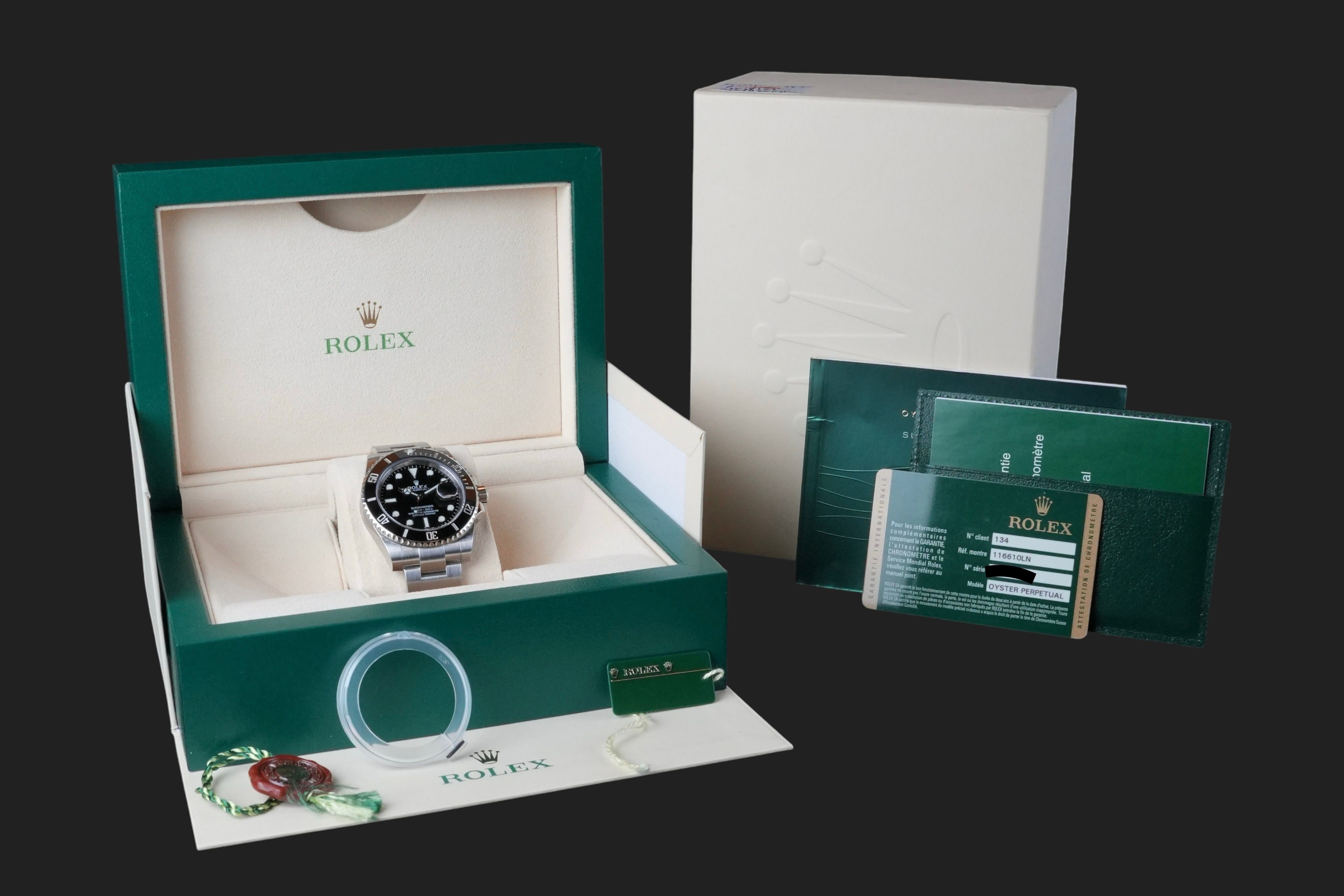 Dial colour is black.Originally sold by Rolex 10/2013, LC134 (Netherlands).