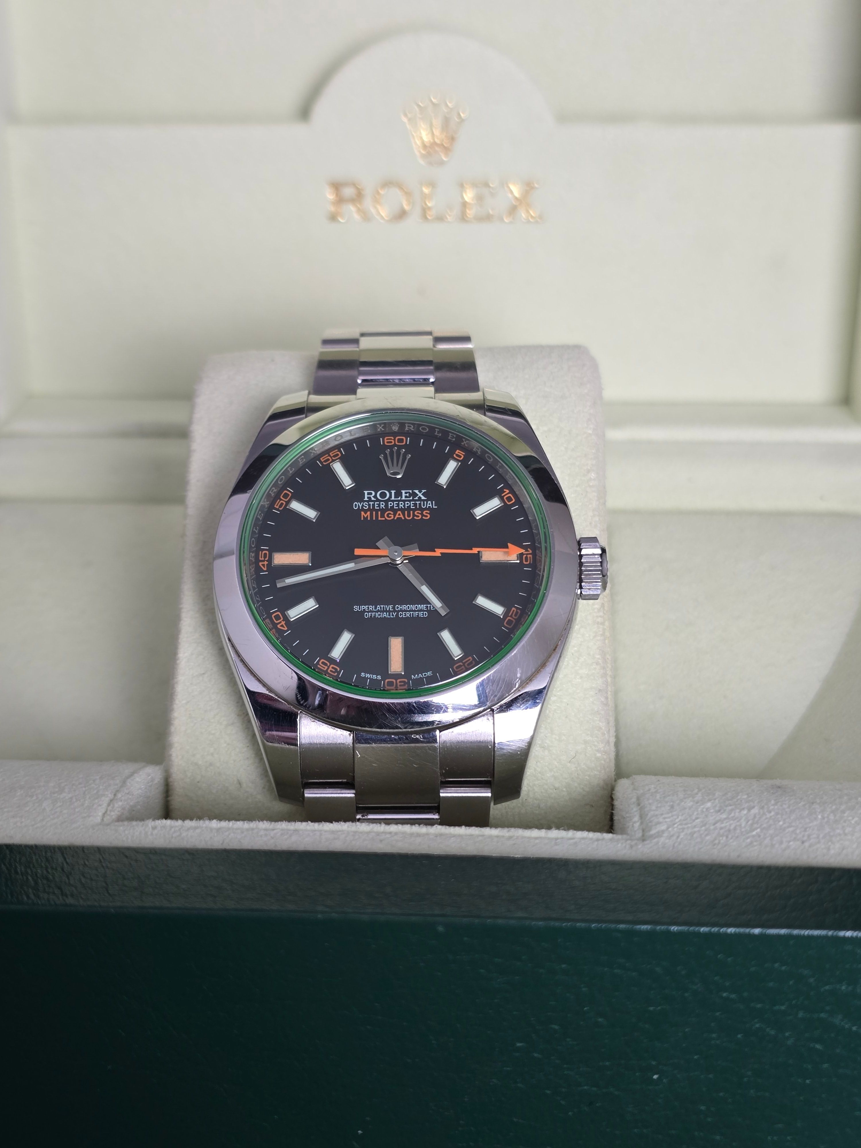 The Rolex Milgauss 116400GV is a unique and highly recognizable model in the Oyster Perpetual collection, originally designed for scientists and engineers. Its standout feature is the green-tinted sapphire crystal — exclusive to the Milgauss line — paired with a sleek 40mm stainless steel case and black dial accented by the signature orange lightning-bolt seconds hand.