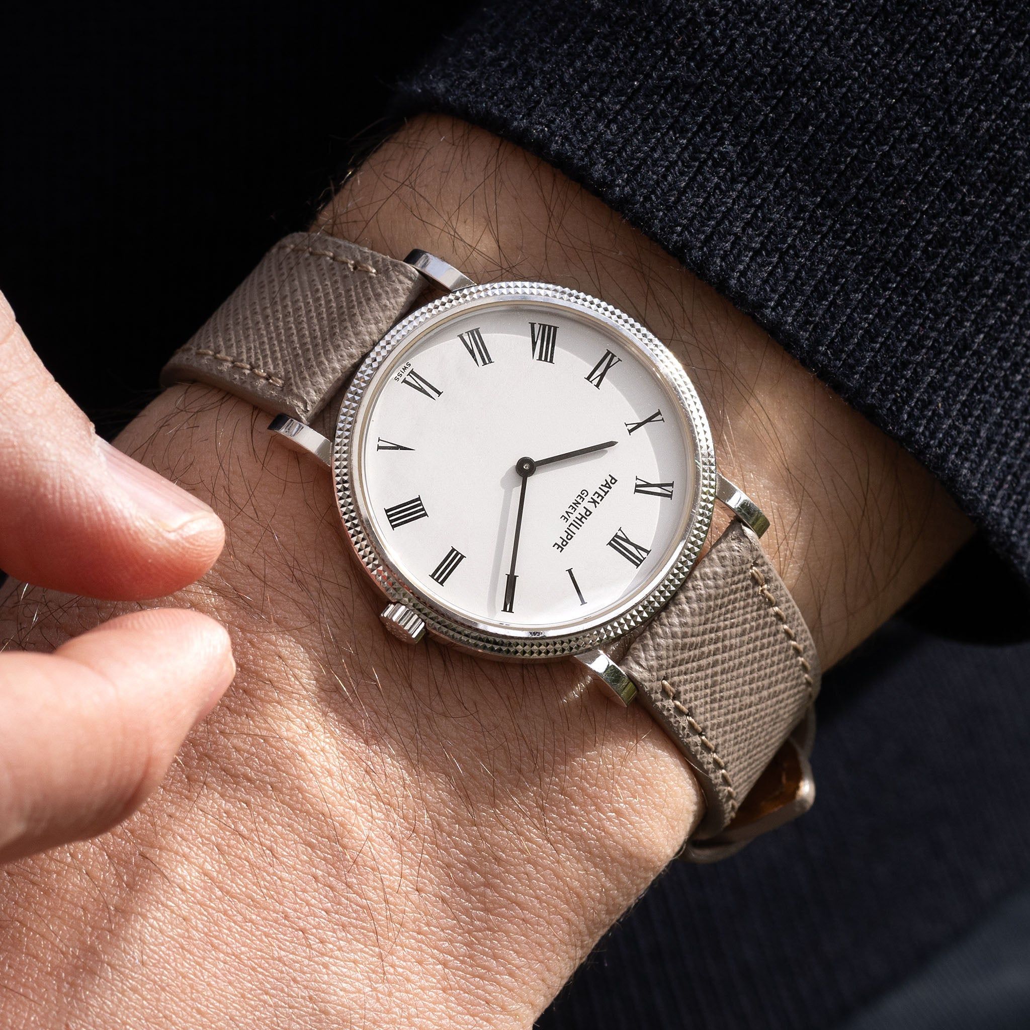 O Patek Philippe Calatrava, lançado em 1932 com a icônica Referência 96, é uma coleção lendária que simboliza a elegância atemporal e minimalista. Ele surgiu após a aquisição da Patek Philippe pelos irmãos Stern durante a Grande Depressão—um momento crucial que direcionou a marca para um design discreto e de alta qualidade. Nomeado após o emblema cruzado da marca—originalmente ligado a uma ordem de cavalaria medieval espanhola—o Calatrava estabeleceu o padrão para o moderno relógio de vestir com suas linhas limpas, caixa redonda e estética inspirada no Bauhaus de “a forma segue a função”. A Referência 5120 é um sucessor espiritual dos amados modelos Calatrava com “clous de Paris”, como o Ref. 3919 de corda manual, traduzindo essa linguagem de design clássica em um formato automático elegante. Esta caixa ultra-fina em ouro branco de 18k, medindo 35 mm, está em excelente estado, com sua dupla fileira de pirâmides de hobnail ao redor da luneta ainda nítida e bem definida. Apresenta garras suavemente curvadas e um fundo de caixa de safira que oferece uma visão clara do micro-rotor em ouro de 22k e do belamente acabado Calibre 240—um ícone por si só. O mostrador apresenta uma tela branca limpa com números romanos pintados, sem ponteiro de segundos para uma sensação adicional de tranquilidade, e ponteiros simples em preto. É acompanhado por uma refinada pulseira de couro Bulang & Sons e equipado com um fivela de pino Patek Philippe em ouro branco de 18k. Este Calatrava minimalista foi totalmente revisado pelo nosso relojoeiro e está pronto para ser desfrutado por muitos anos. O 5120 representa talvez a última geração de verdadeiros Calatavas automáticos de duas mãos (hora + minuto) da Patek — minimalismo em seu melhor. Dê à sua coleção o toque clous de Paris que ela merece—leve este refinado Calatrava para casa!