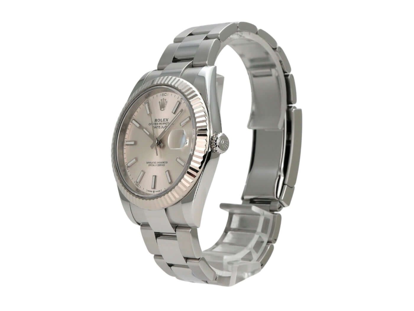 Rolex Datejust 41 Ref. 126334 Stainless Steel / White Gold Silver from 2021Case made of polished and satin-finished stainless steel, case diameter 41 mm, fluted 18 kt white gold bezel, Oyster bracelet made of polished and satin-finished stainless steel with folding clasp, silver-colored dial with 18 kt white gold luminous indices, luminous hands, automatic movement, Rolex manufacture caliber 3235, 70 hours power reserve, date display, chronometer, scratch-resistant sapphire crystal, screw-down crown, screwed stainless steel case back, water-resistant up to 10 bar.