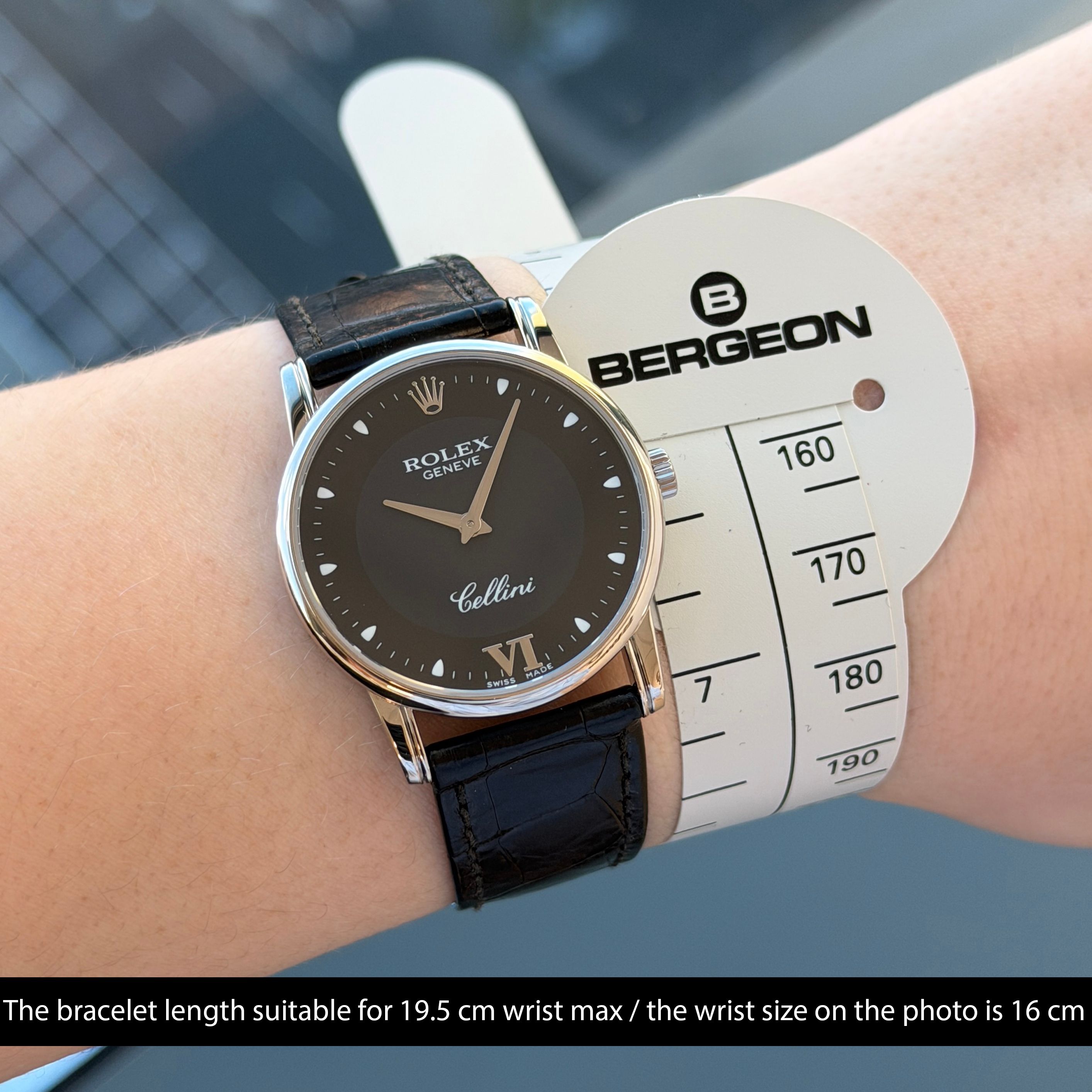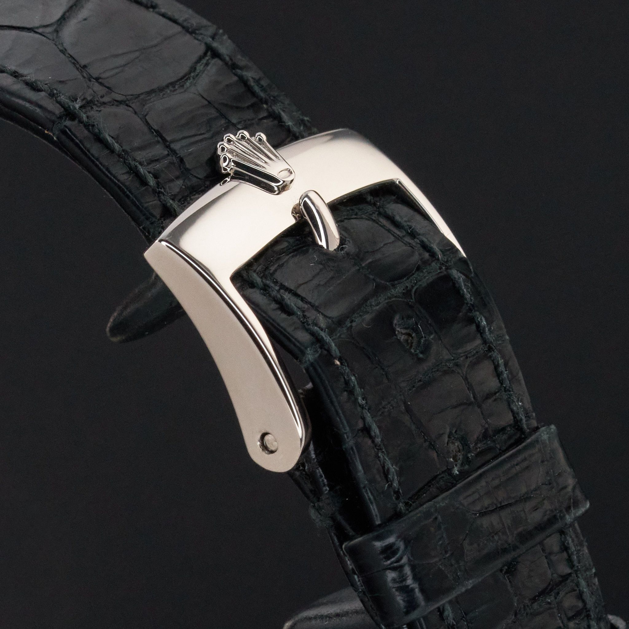 Este Rolex Cellini 5116/9 apresenta um mostrador romano preto e é feito de ouro branco 18K, com ano de produção de 2008.