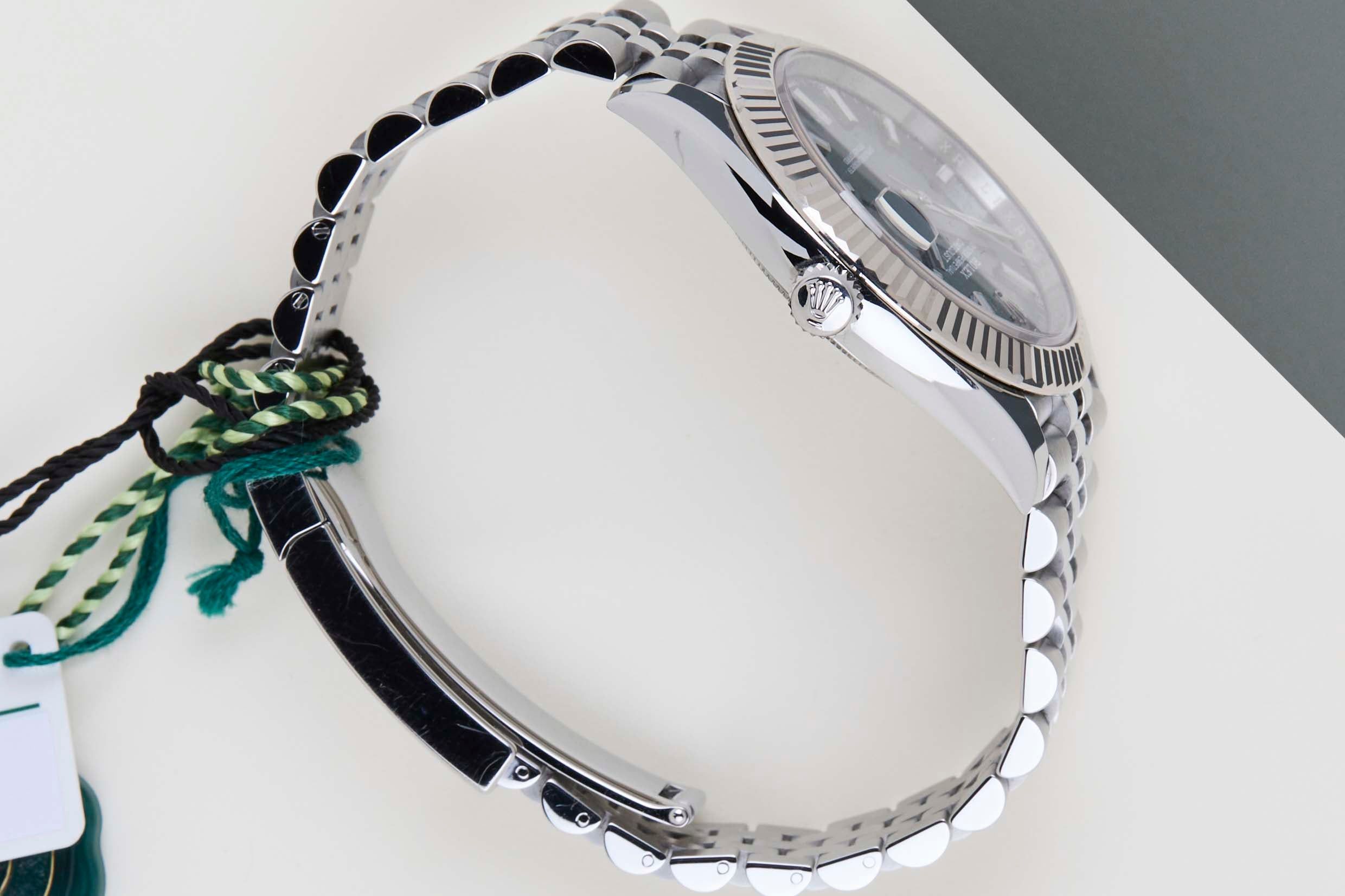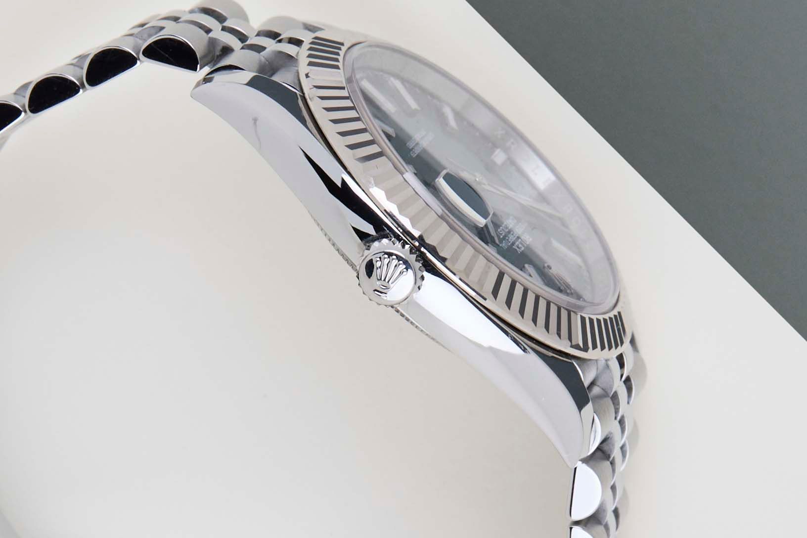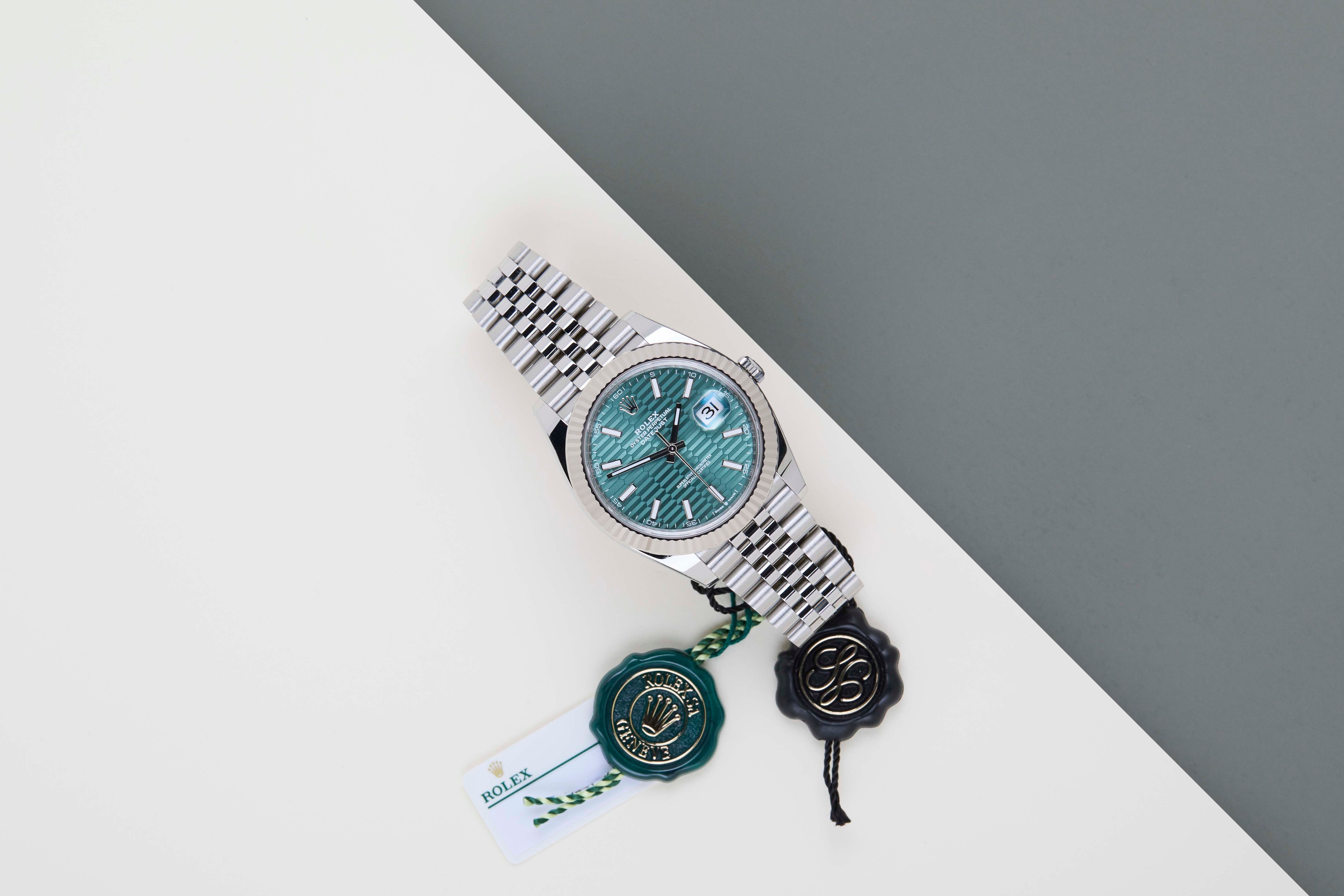 Full Set | International Rolex Warranty until October 2027 Rolex introduced the original Datejust in 1945 to celebrate the company's 40th anniversary. Due to the various case sizes and materials, the Datejust has been ingrained in Rolex's history and remains incredibly popular for 75 years.This Rolex Datejust 41 'Mint Green Fluted Motif Dial - Jubilee' was sold for the first time in October 2022.This Datejust is made of a combination of 18k White Gold and stainless steel and is fitted with a Jubilee bracelet, which is equipped with the Easylink. This extension, allows the wearer to either extend or shorten the bracelet by 5 millimeters, improving the wearability and usability of the watch.This Rolex Datejust 41 is mint and comes with the original Rolex Warranty Card and box. Furthermore, the watch still has Worldwide Rolex Warranty until October 2027.