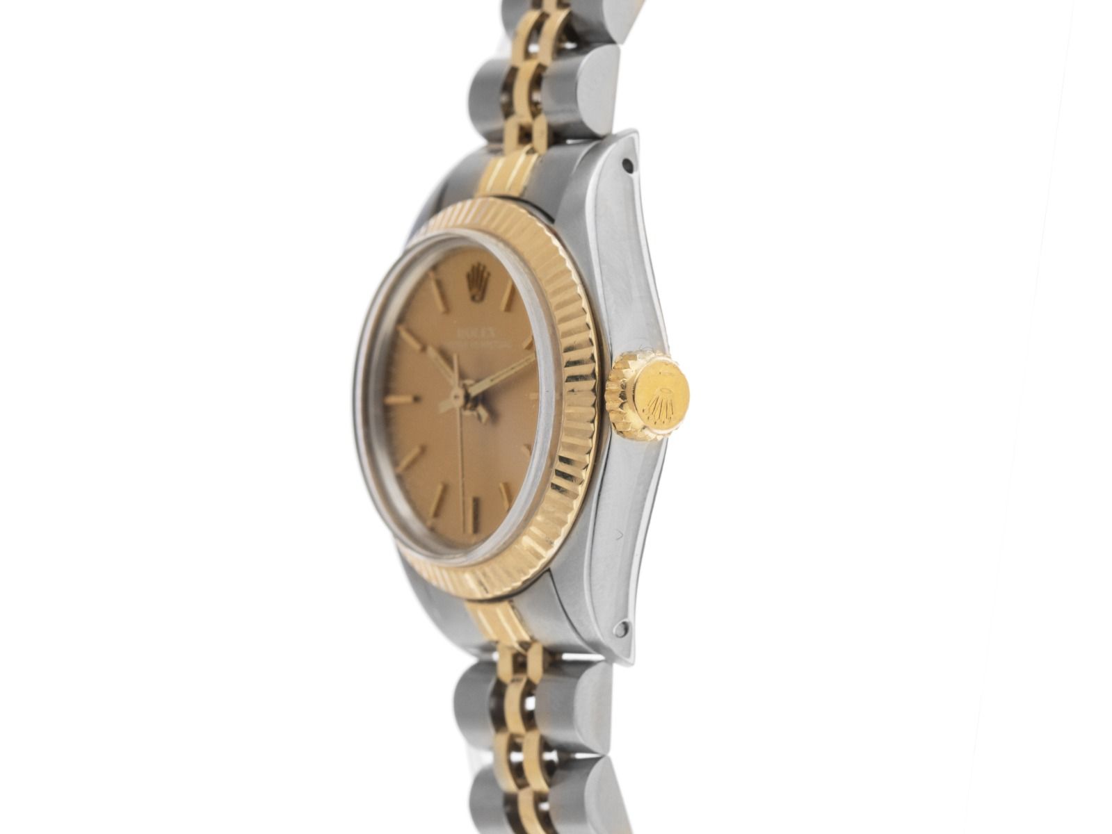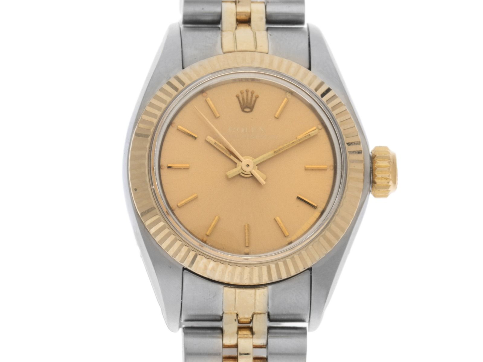 Caixa em aço polido e acetinado, diâmetro da caixa sem coroa 24mm, altura da caixa 11,4mm. Bezel em ouro amarelo 18kt, estriado e polido. Pulseira Jubilé em aço/ ouro amarelo 18kt polido e acetinado, fecho dobrável em aço com logotipo do fabricante. Mostrador em tom champanhe com índices em ouro amarelo aplicados e ponteiros em ouro amarelo. Movimento automático, calibre de manufatura Rolex 3135 com 31 pedras preciosas. Exibição de horas, minutos e segundos através de ponteiros centrais com parada de segundos para ajuste preciso da hora. Vidro de safira resistente a riscos. Coroa rosqueada com logotipo do fabricante. Fundo em aço rosqueado. Peso do relógio incluindo a pulseira 48g, comprimento da pulseira incluindo a caixa 165mm. Número de referência: 6719, ano de fabricação: 1981, número da caixa: 6618XXX, ID: P215550161225H-6200, número do artigo: 10000084069. Com controle de precisão e completa restauração externa de dezembro de 2025. Caixa original da Rolex com embalagem e descrição, manual de tradução, estojo de couro, selo de cronômetro Rolex e extrato do Watch Register de dezembro de 2025, Certificado do Watch Register / sem registro (Banco de dados internacional para relógios perdidos ou roubados). Investimento com potencial de valorização, peça de coleção muito rara. Excelente estado. Prazo de entrega imediato.