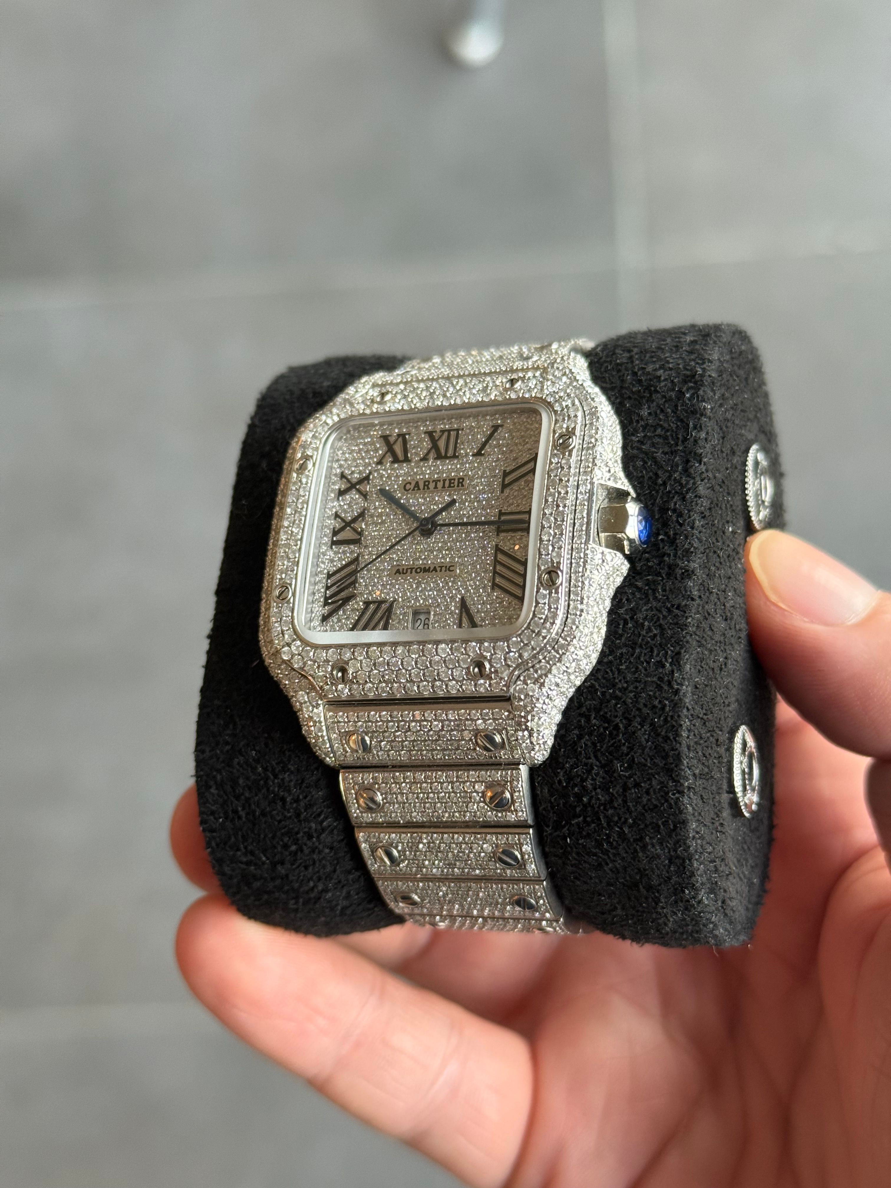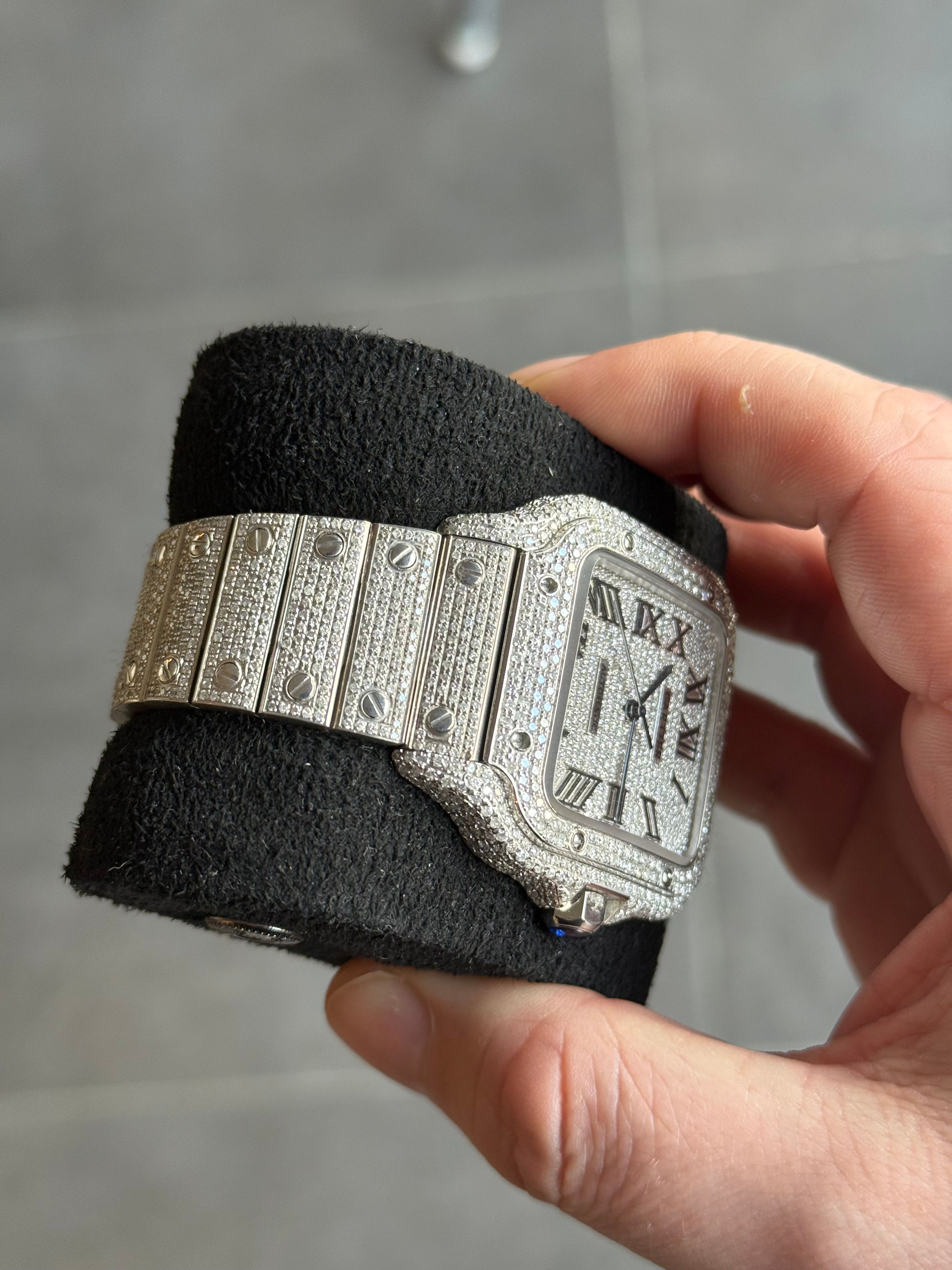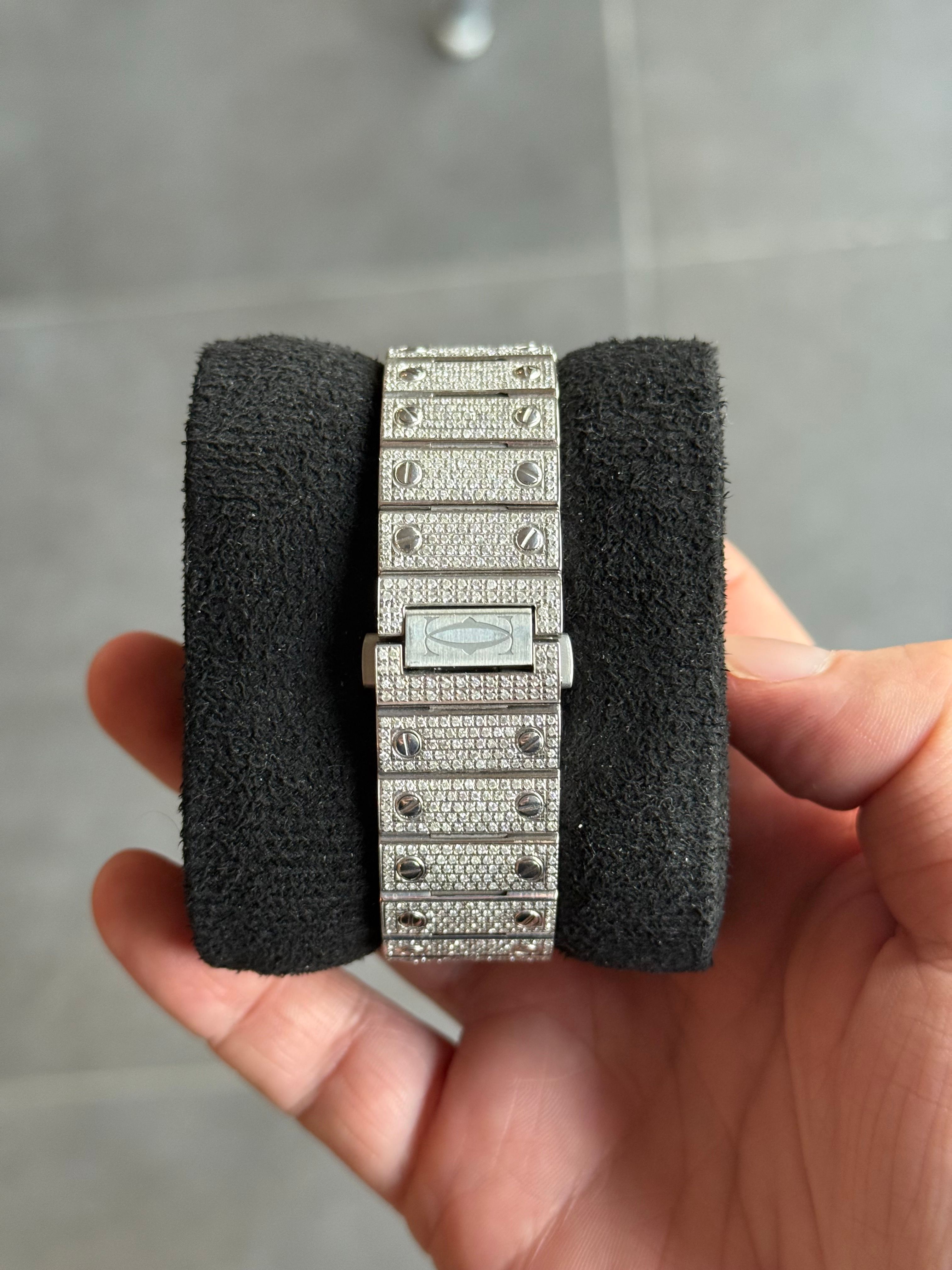À venda: um lindo Cartier Santos de 2023, adornado com diamantes originais da Cartier. O relógio está em estado novo e vem com o cartão original (apenas cartão).