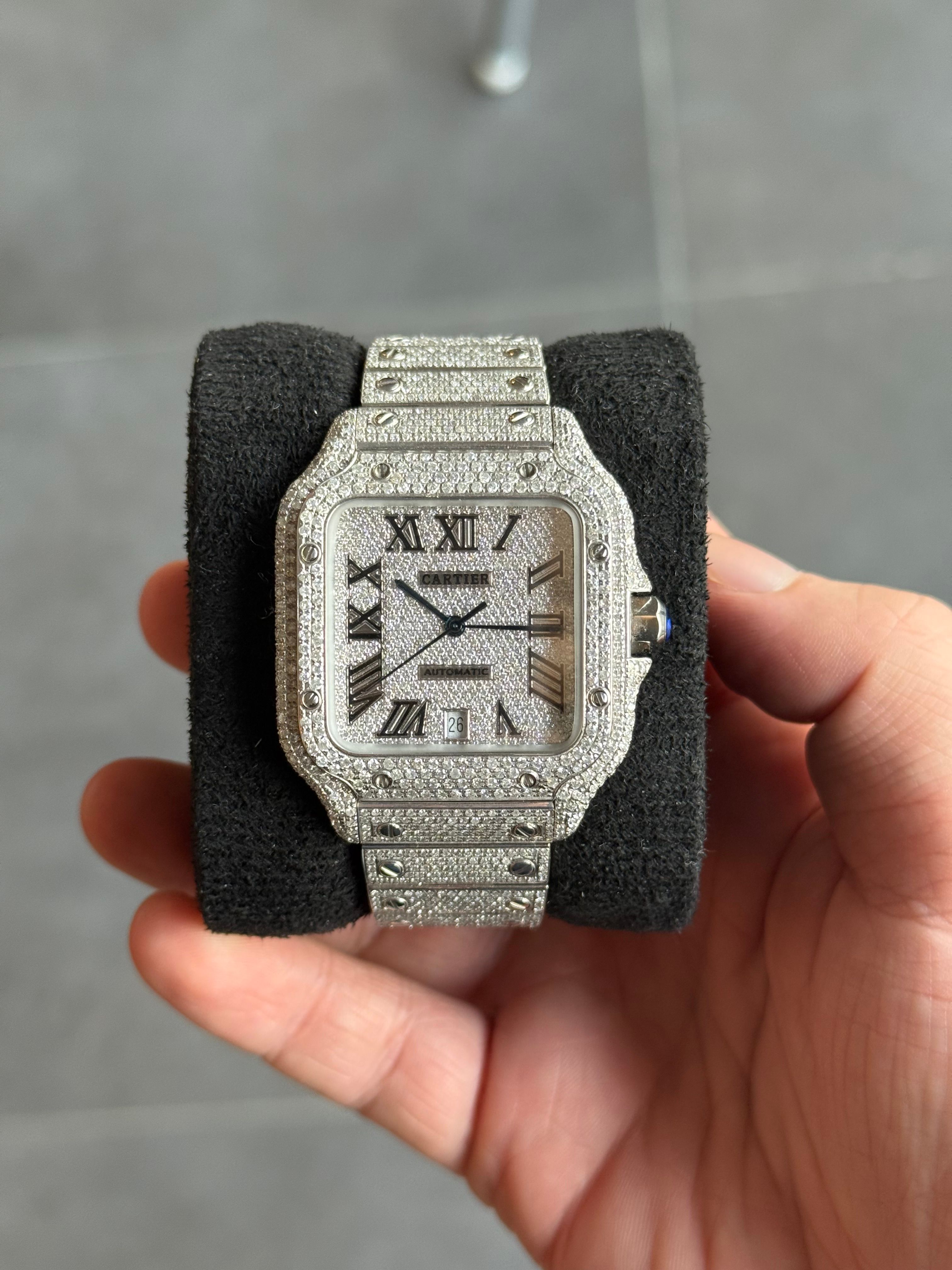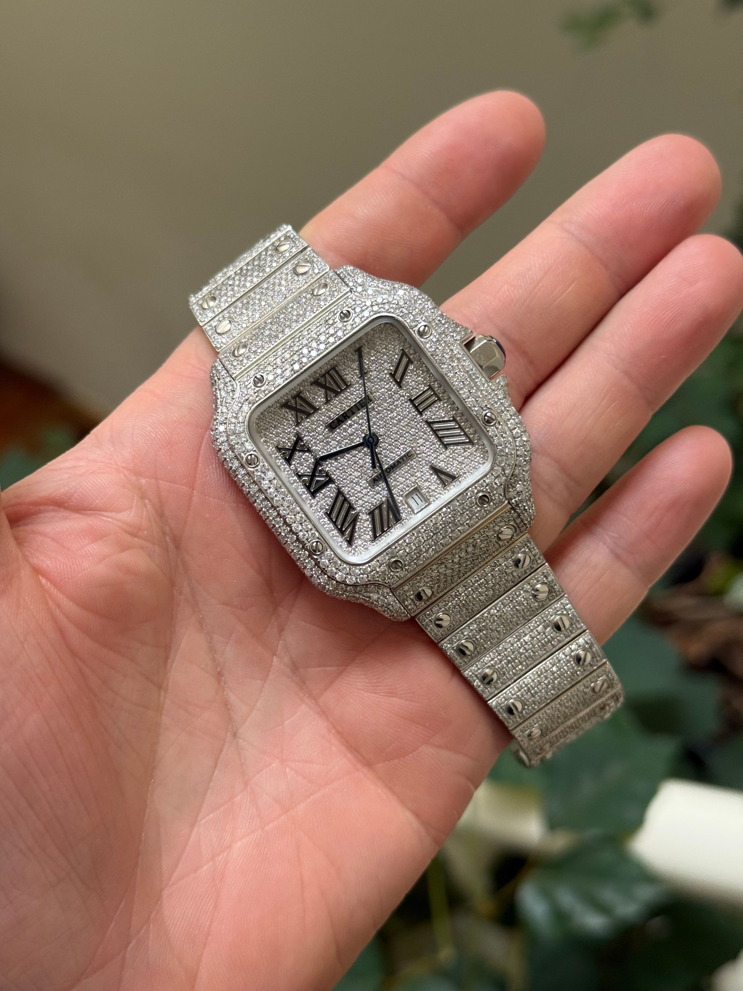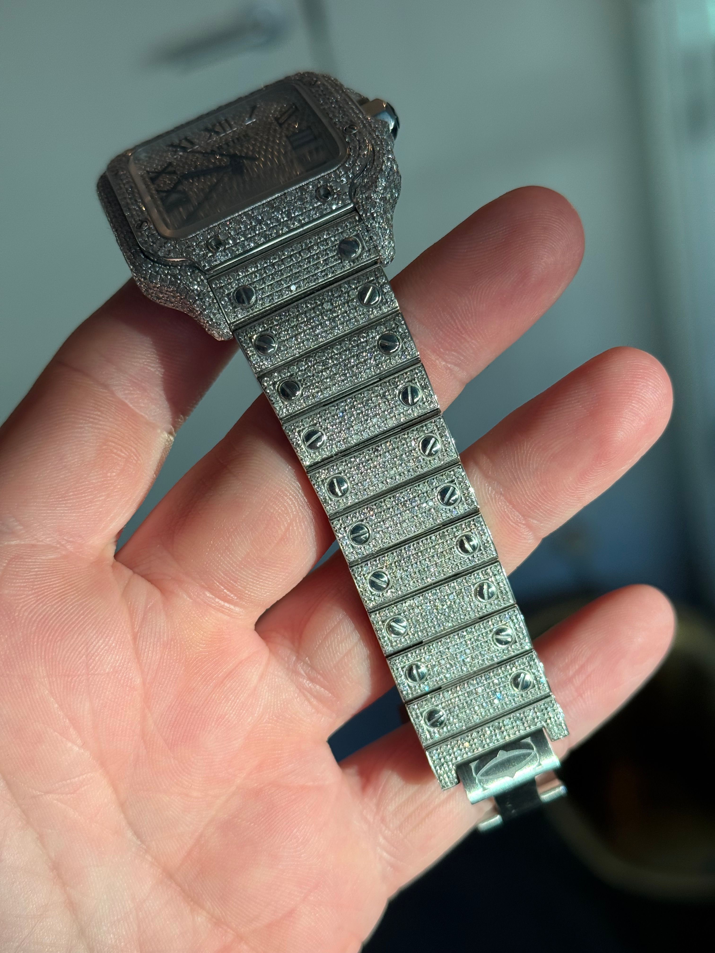 À venda: um lindo Cartier Santos de 2023, adornado com diamantes originais da Cartier. O relógio está em estado novo e vem com o cartão original (apenas cartão).
