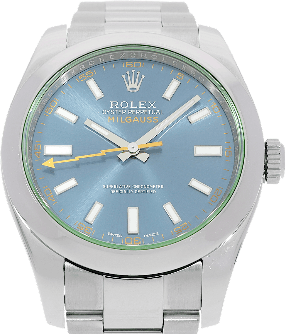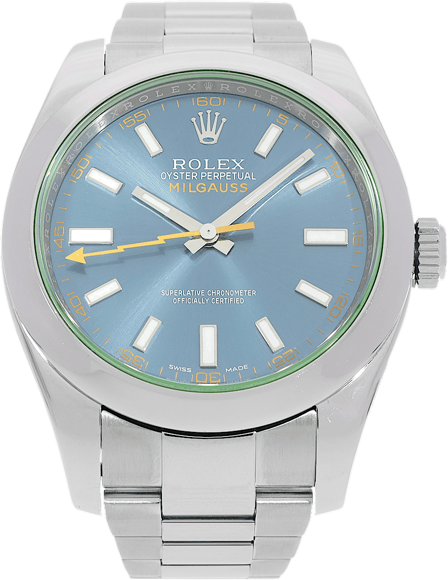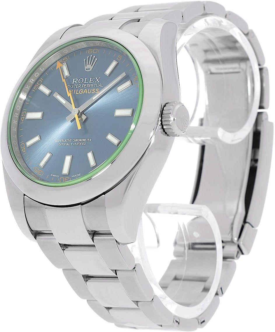 Rolex Milgauss, Reference: 116400GV-0002, Gender: Male, Size: 41mm, Dial color: Blue, Strap material: Stainless Steel, Movement: Automatic, Condition: Pre-owned watch in original condition. Has been inspected, regulated and authenticated by certified CHRONEXT watchmakers., Documents: Original papers, Certificate