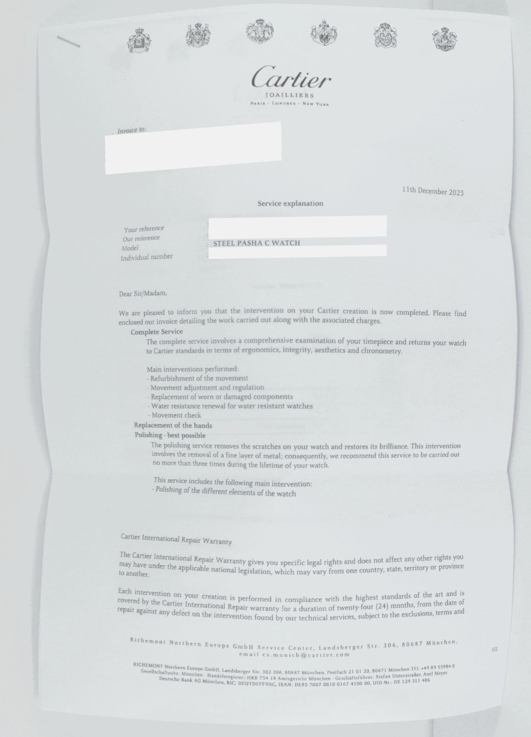 O relógio passou por um serviço completo na Cartier em 11-12-2025