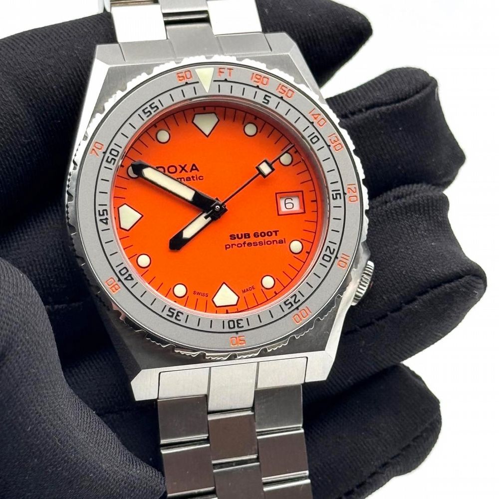 Founded in 1889 in Le Locle, Switzerland, Doxa has earned its place as an iconic dive watch brand by pioneering timepieces designed for serious underwater explorations. Known for its bright-colored dials, professional-grade depth ratings, and enduring technical integrity, Doxa has become a legend among divers and collectors alike.The Doxa Sub 600T Professional, reference 862.10.351.21, features a robust 40 mm stainless steel cushion case with a bold orange dial exuding vintage diver charm. Powered by the Swiss automatic caliber Sellita SW200-1 (decorated by Doxa), it delivers hours, minutes, seconds, and date functions with approximately 38 hours of power reserve and a frequency of 28,800 vph.