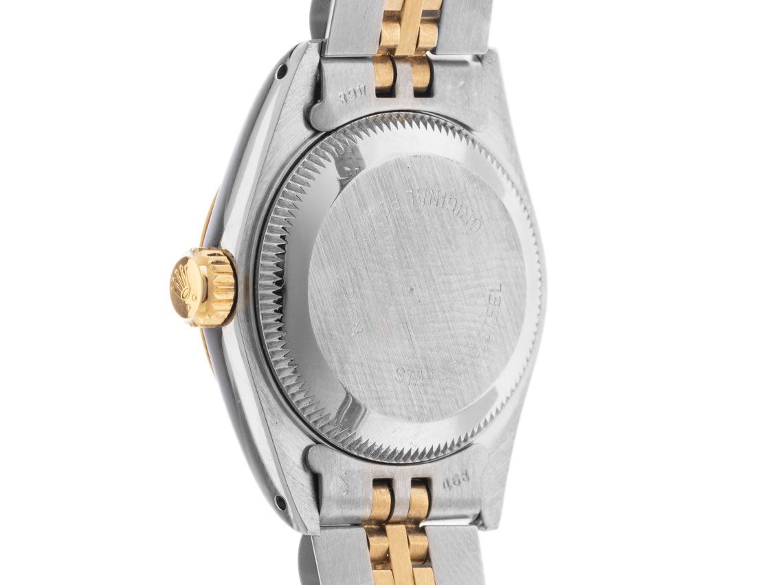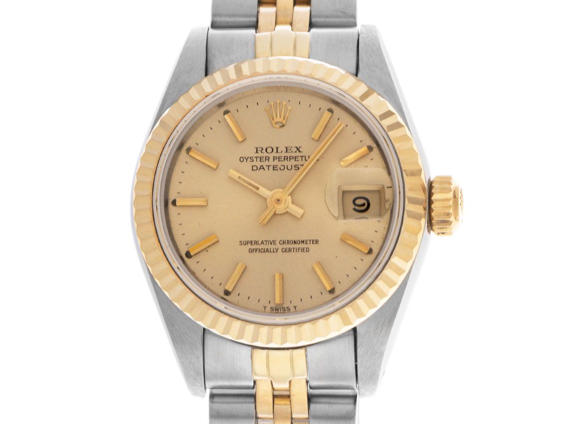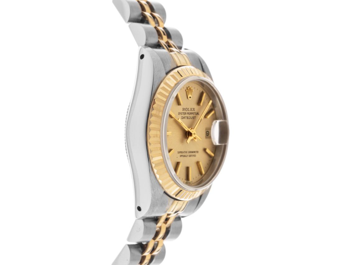 Caixa em aço polido e acetinado, diâmetro da caixa sem coroa 26mm, altura da caixa 10,6mm. Luneta em ouro amarelo 18kt, estriada e polida. Pulseira Jubilé em aço / ouro amarelo 18kt polido e acetinado, fecho dobrável em aço com logotipo do fabricante. Mostrador em cor champanhe com índices em ouro amarelo aplicados e ponteiros em ouro amarelo, inscrição "T SWISS MADE T" às 6 horas. Movimento automático, cronômetro com certificado, calibre de manufatura Rolex 2135 com 29 pedras preciosas. Exibição de horas, minutos e segundos através de ponteiros centrais com parada de segundos para ajuste preciso da hora, exibição da data sob lente de aumento às 3 horas, open 6/9 (seis e nove abertas na exibição da data). Vidro de safira. Coroa rosqueada com logotipo do fabricante. Fundo em aço rosqueado. Peso do relógio incluindo a pulseira 51g, comprimento da pulseira incluindo a caixa 140mm. Número de referência: 69173, número da caixa: 9180XXX, ID: P911570000324H-7500, número do artigo: 10000073987. Com controle de marcha e completa restauração externa de março de 2024, incluindo 1000 dias de garantia. Caixa original da Rolex e documentos de garantia de 12/1985, além de descrição, estojo de couro, manual de tradução, selo de cronômetro Rolex e etiqueta, LC 010 / Suíça, Full Set. Super oferta, investimento com potencial de valorização, de primeira mão. Como Novo. Prazo de entrega imediato.