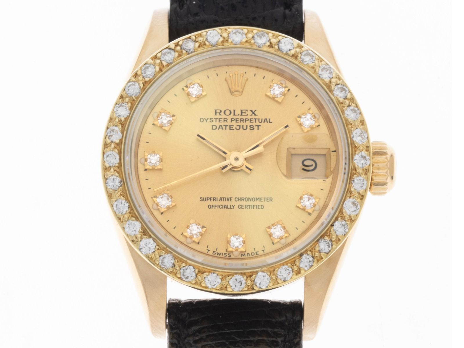 Caixa em ouro amarelo 18kt polido e acetinado, diâmetro da caixa sem coroa 26mm, altura da caixa 10,7mm. Luneta em ouro amarelo 18kt cravejada com diamantes. Pulseira de couro, largura da asa 13mm, fecho de pino em ouro amarelo 18kt com logotipo do fabricante. Mostrador em tom champanhe com índices de diamante emoldurados em ouro amarelo e ponteiros em ouro amarelo. Movimento automático, calibre de manufatura Rolex 2135 com 29 pedras preciosas. Exibição de horas, minutos e segundos através de ponteiros centrais com parada de segundos para ajuste preciso da hora, exibição da data sob lupa às 3 horas, open 6/9 (seis e nove abertas na exibição da data), vidro de safira resistente a riscos. Coroa rosqueada com logotipo do fabricante. Fundo em ouro amarelo 18kt rosqueado e gravado. Peso do relógio incluindo a pulseira 38g. Número de referência: 69178, número da caixa: X190XXX, ano de fabricação: 1991, ID: P139594000825H-8500, número do artigo: 10000081986. Com controle de marcha e completa revisão estética de agosto de 2025. Caixa original da Rolex e descrição, estojo de couro, manual de tradução, selo de cronômetro Rolex, dia, e extrato do Watch Register de agosto de 2025, Certificado do Watch Register / sem registro (Banco de dados internacional para relógios perdidos ou roubados). Super oferta, investimento com potencial de valorização. Muito bom estado. Prazo de entrega imediato.
