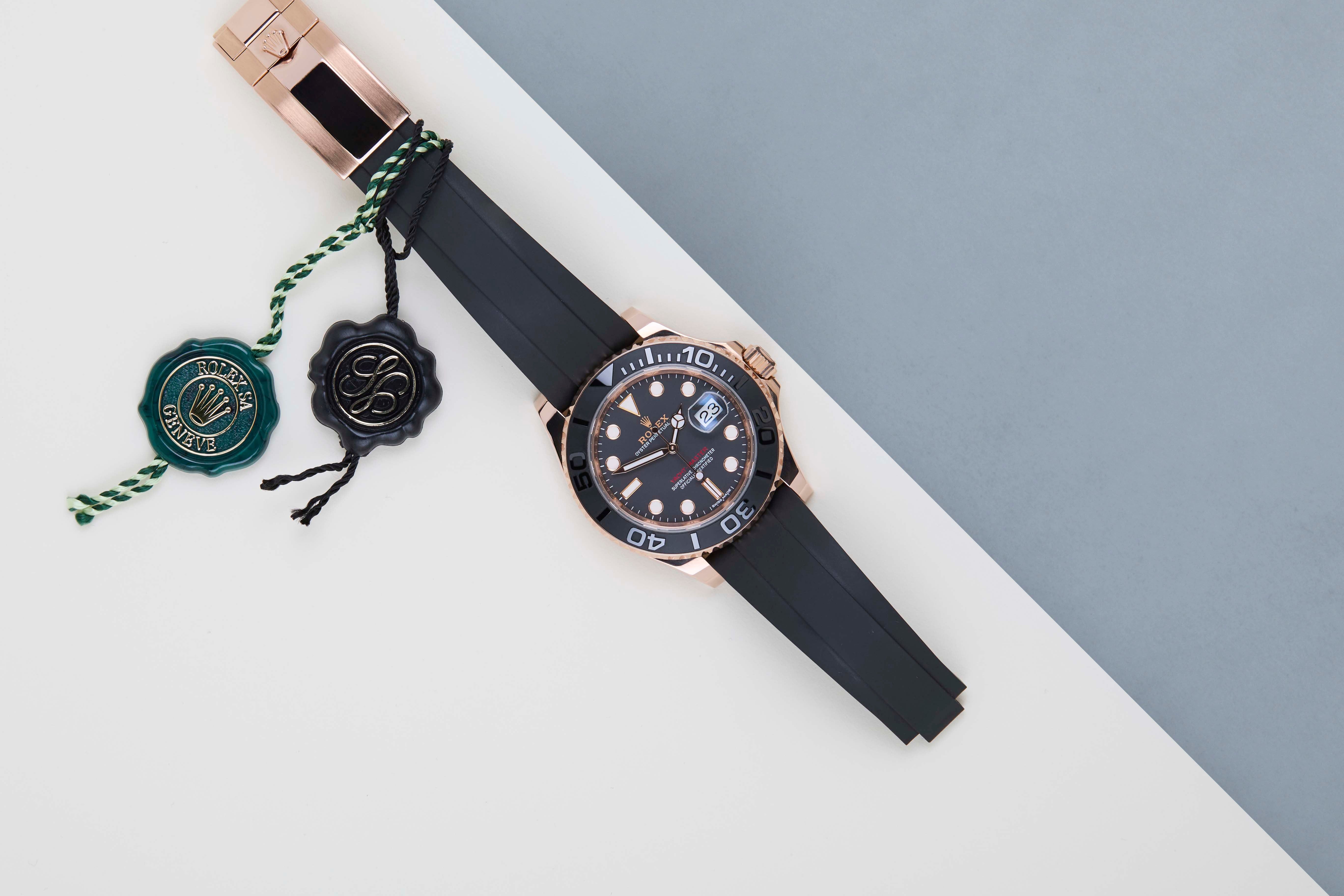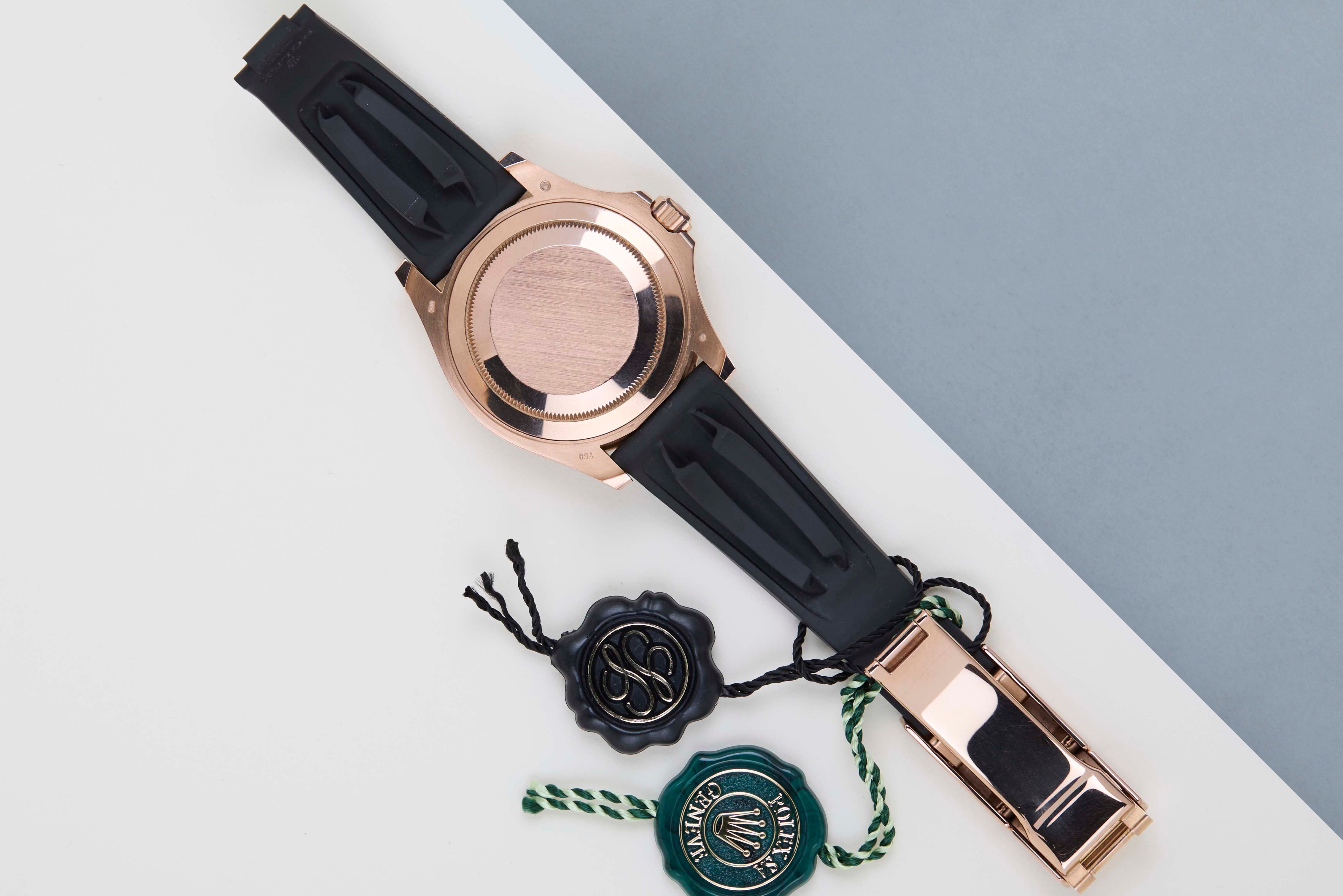 Este cobiçado Rolex Yacht-Master 40 em Ouro Rosa com um mostrador preto e pulseira Oysterflex foi entregue pela primeira vez em outubro de 2018. A referência 116655 é feita de ouro rosa 18k, uma liga exclusiva desenvolvida pela Rolex, conhecida por seu tom quente e excepcional durabilidade.