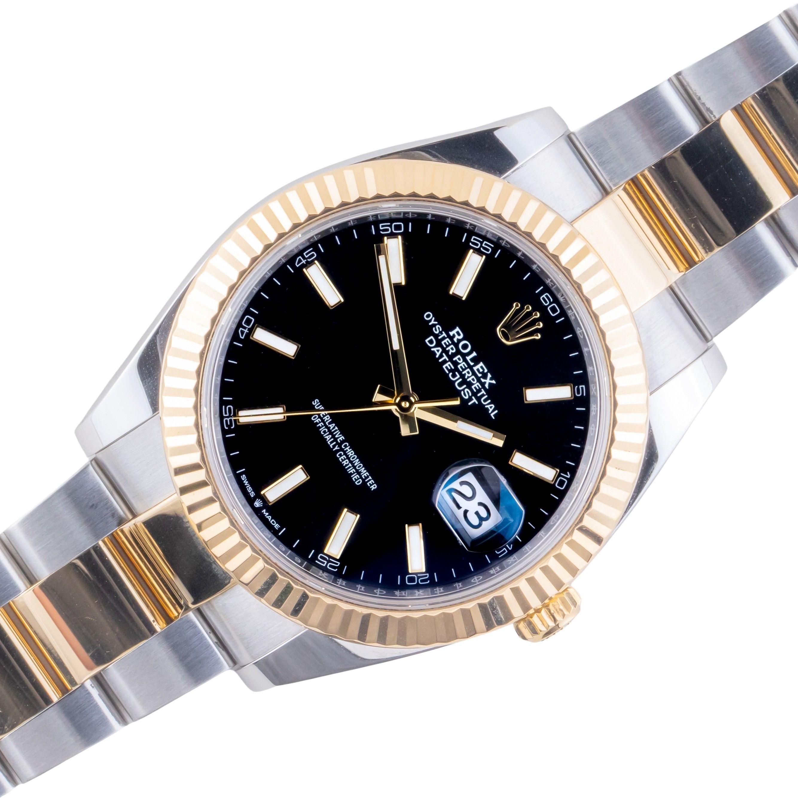 Rolex Oyster Perpetual Datejust referência 126333 de 2023, incluindo conjunto completo. O Datejust 126333 possui uma caixa de 41mm em ouro e aço inoxidável, uma pulseira Jubilee bicolor com fecho de coroa e um bezel estriado em ouro 18k. Este Datejust 126333 conta com um movimento automático calibre 3235 com função de data rápida, um cristal de safira resistente a arranhões e um mostrador preto.