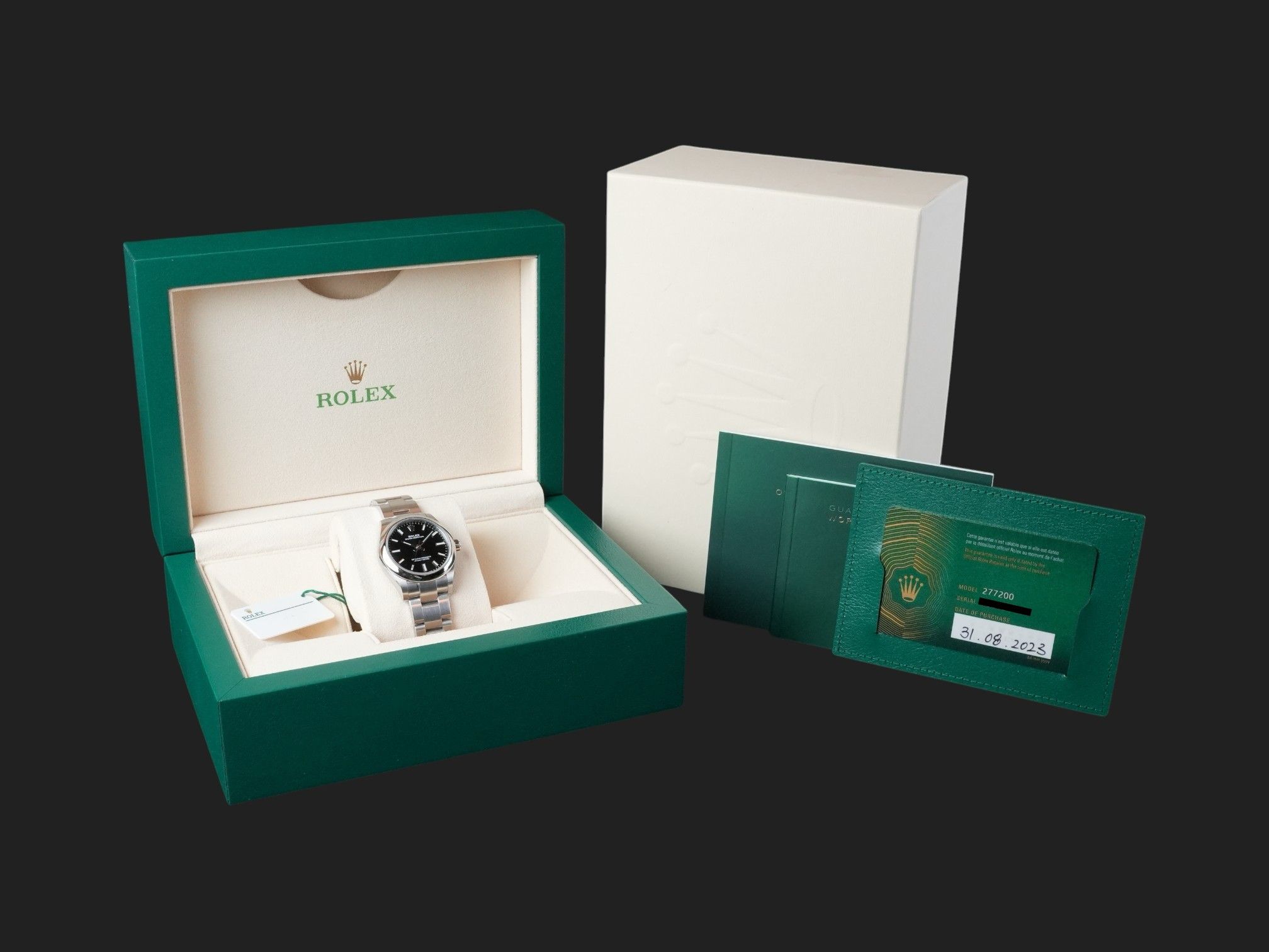 Dial colour is black.Originally sold by Rolex 08/2023.