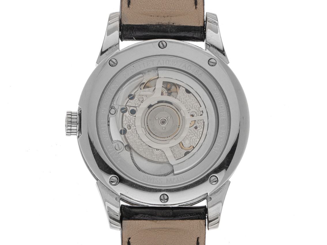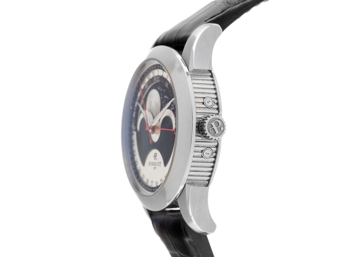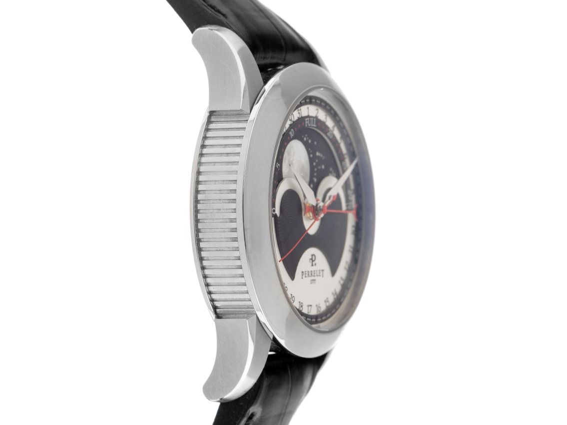 Caixa em aço inoxidável polido, diâmetro da caixa sem coroa 40mm, altura da caixa 12,6mm. Bezel em aço inoxidável liso e polido. Pulseira Perrelet em couro preto com costura decorativa, largura da alça 20mm, fecho de segurança dobrável em aço inoxidável com logotipo do fabricante. Mostrador prateado / preto com números árabes e ponteiros em aço inoxidável. Movimento automático, calibre Perrelet com 29 pedras preciosas. Exibição de horas, minutos e segundos através de ponteiros centrais com parada de segundos para ajuste preciso da hora, exibição de data com ajuste rápido através de ponteiro vermelho central, indicação de fases da lua às 12 horas. Vidro de safira resistente a riscos. Coroa com logotipo do fabricante. Fundo em aço inoxidável com 6 parafusos e gravado com janela de vidro de safira. Peso do relógio incluindo a pulseira 107g. Número de referência: A1039/2, número da caixa: A0XXX, ID: P217134000126H-5200, número do artigo: 10000084126. Com controle de precisão e completa revisão estética de janeiro de 2026. Caixa original Perrelet com embalagem e documentos de garantia de dezembro de 2020, além de extrato do Watchregister de janeiro de 2026, Certificado do Watch Register / sem registro (Banco de dados internacional para relógios perdidos ou roubados), Full Set. Super oferta, peça de colecionador muito rara, quase não usada. Como nova. Prazo de entrega imediato.