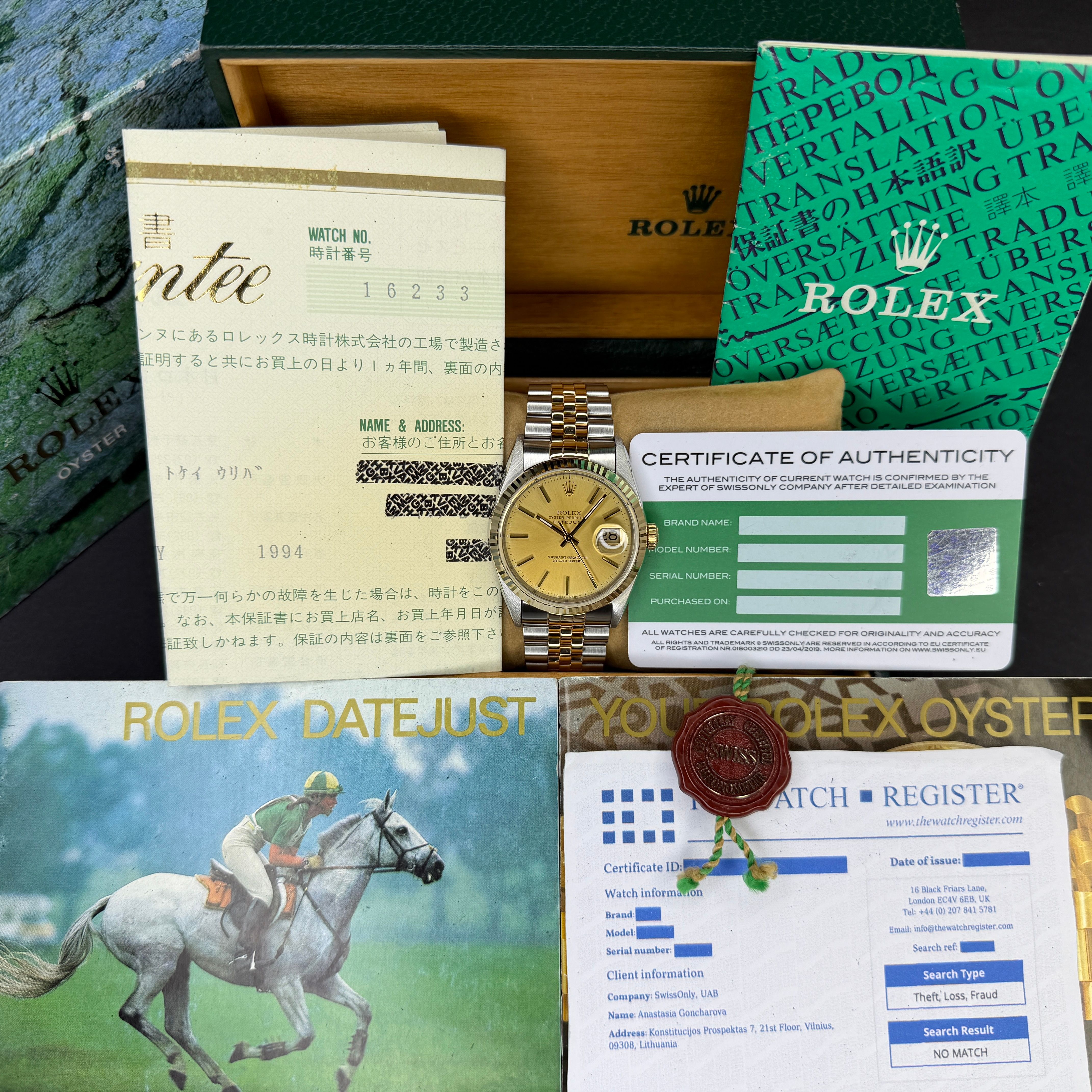 Rolex Datejust, 16233, 36mm, 1993, Two-Tone, Champagne dial, Fullset, 1y warranty