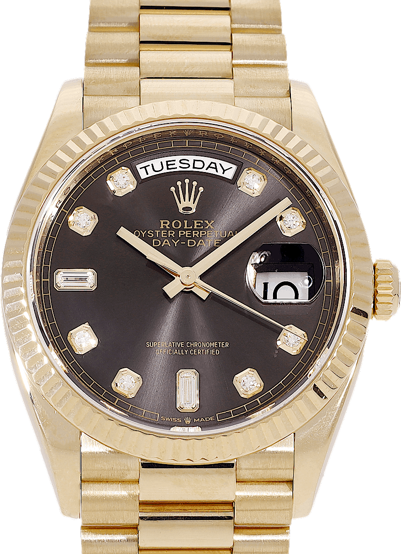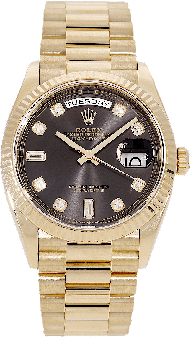 Rolex Day-Date 36, Reference: 128238, Gender: Unisex, Size: 36mm, Dial color: Brown, Strap material: Yellow Gold, Movement: Automatic, Condition: Pre-owned watch in original condition. Has been inspected, regulated and authenticated by certified CHRONEXT watchmakers., Documents: Original papers, Certificate