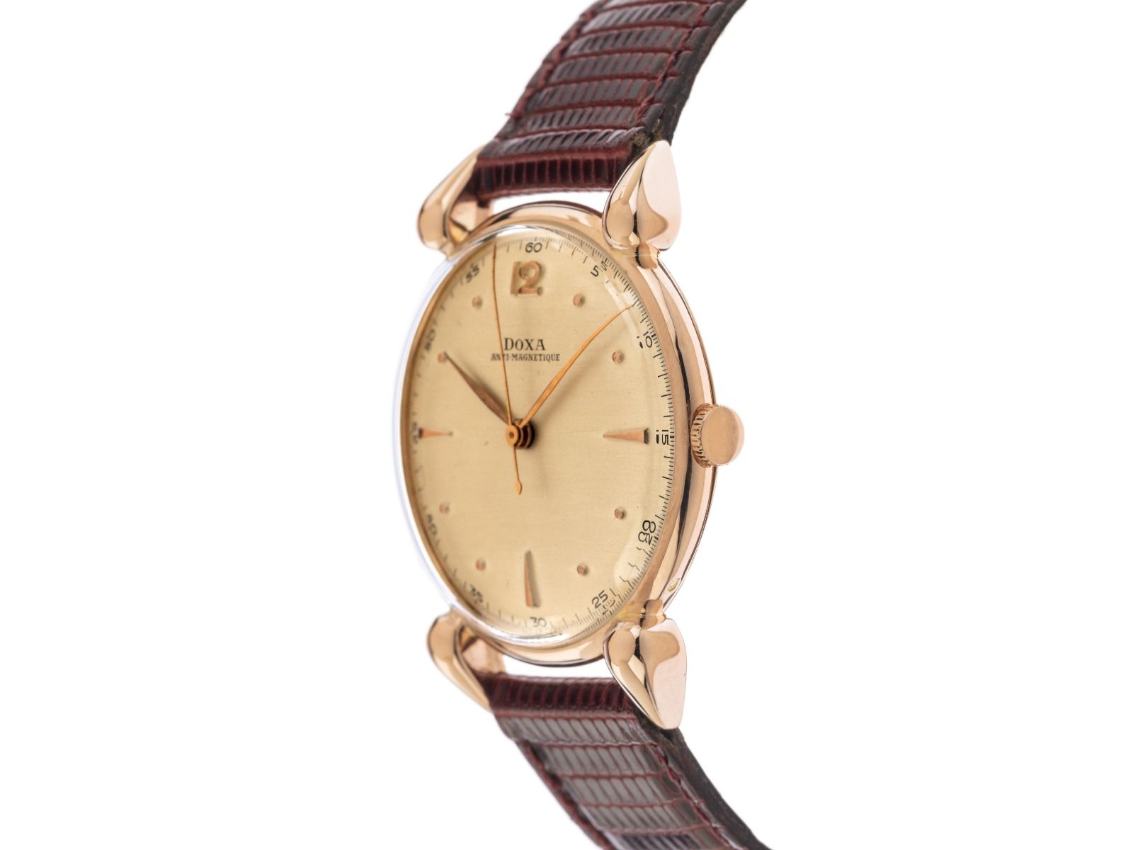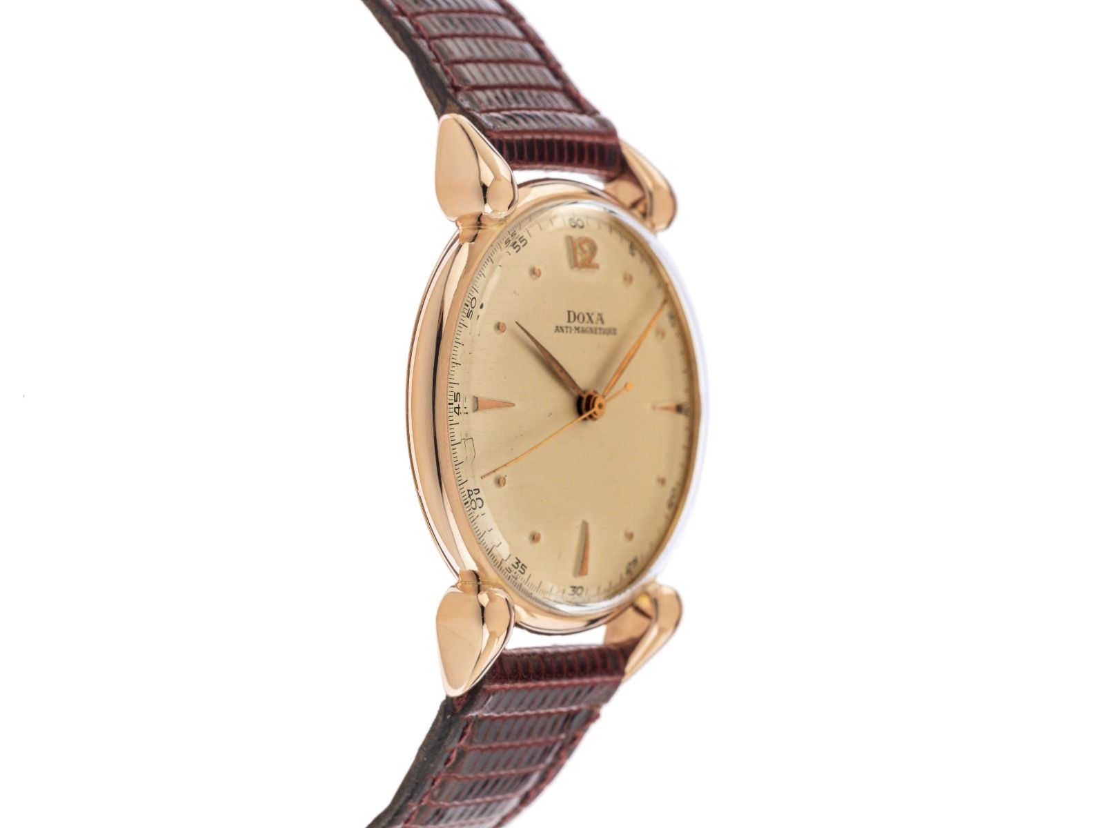 Doxa Antimagnetique 14kt Roségold Handaufzug Armband LederGehäuse 14kt Roségold poliert, Gehäusedurchmesser ohne Krone 35mm, Gehäusehöhe 8,8mm. Armband Leder braun mit Ziernaht, Anstoßbreite 18mm, Stiftschließe Roségold vergoldet. Zifferblatt champagnerfarben mit aufgesetzten roségoldenen Indexen sowie Ziffer 12 und roségoldenen Zeigern. Uhrwerk Handaufzug, Kaliber Doxa 1147. Anzeige von Stunde, Minute und Sekunde über Zeiger aus der Mitte. Plexiglas gewölbt. Krone geriffelt. Boden 14kt Roségold graviert. Gewicht der Uhr inklusive Armband 31g. Gehäusenummer: 859XXX, Baujahr: 1936, ID: P225326740126H-4500, Artikelnummer: 10000084243. Mit neuer Gangkontrolle und kompletter äußerlicher Aufarbeitung von Januar 2026. Superschnäppchen, Kapitalanlage mit Wertsteigerungspotential, extrem seltenes Sammlerstück. Sehr guter Zustand. Lieferzeit sofort.