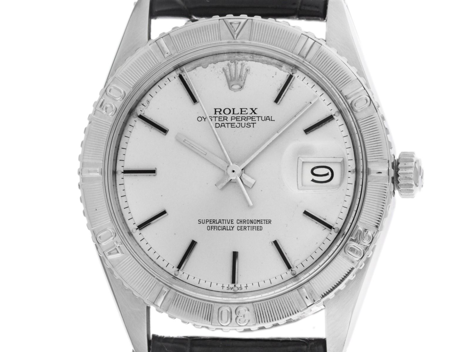 Rolex Datejust Turn-O-Graph Stahl Automatik Armband KrokolederGehäuse Edelstahl poliert und satiniert, Gehäusedurchmesser ohne Krone 36mm, Gehäusehöhe 11,5mm, Lünette Edelstahl poliert und geriffelt mit 60-Minuten Skala, beidseitig drehbar. Armband Krokoleder schwarz, Anstoßbreite 20mm, Stiftschließe Edelstahl mit Hersteller-Logo. Zifferblatt silberfarben leicht patiniert mit aufgesetzten weißgoldenen Indexen und weißgoldenen Zeigern. Uhrwerk Automatik, Chronometer, Rolex Manufakturkaliber 1570 mit 26 Edelsteinen. Anzeige von Stunde, Minute und Sekunde über Zeiger aus der Mitte mit Sekundenstopp zur sekundengenauen Einstellung der Uhrzeit, Datumsanzeige unter Glaslupe bei 3 Uhr, open 6/9 (offene 6 und 9 in der Datumsanzeige), Saphirglas kratzfest. Krone verschraubbar mit Hersteller-Logo. Boden Edelstahl verschraubt. Gewicht der Uhr inklusive Armband 56g. Referenznummer: 1625, Gehäusenummer: 2690XXX, Baujahr: 1970, ID: P223491000126H-7600, Artikelnummer: 10000084215. Mit Gangkontrolle und kompletter äußerlicher Aufarbeitung von Januar 2026. Original Rolex Box mit Umkarton und Beschreibung sowie Ledermäppchen, Übersetzungsheft, Rolex Chronometer-Siegel und Watchregister Auszug von Januar 2026, The Watch Register Zertifikat / ohne Eintrag (Internationale Datenbank für verlorene oder gestohlene Uhren). Superschnäppchen, Kapitalanlage mit Wertsteigerungspotential, extrem seltenes Sammlerstück. Sehr guter Zustand. Lieferzeit sofort.