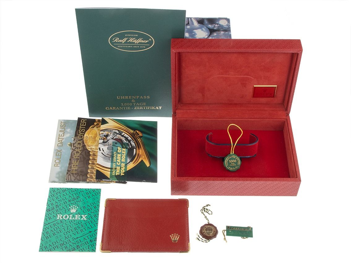 Rolex Datejust Medium 18kt Gelbgold Diamanten Automatik Armband PräsidentGehäuse 18kt Gelbgold poliert und satiniert, Gehäusedurchmesser ohne Krone 31mm, Gehäusehöhe 11,3mm. Lünette 18kt Gelbgold geriffelt und poliert. Armband Präsident 18kt Gelbgold, verdeckte Rolex Faltschließe 18kt Gelbgold mit Hersteller-Logo, Bandanstöße 18kt Gelbgold mit Diamanten besetzt. Zifferblatt champagnerfarben mit aufgesetzten in Gelbgold gefassten Diamantindexen und gelbgoldenen Zeigern. Uhrwerk Automatik, Chronometer, Rolex Manufakturkaliber 2135 mit 29 Edelsteinen. Anzeige von Stunde, Minute und Sekunde über Zeiger aus der Mitte mit Sekundenstopp zur sekundengenauen Einstellung der Uhrzeit, Datumsanzeige mit Schnellverstellung unter Glaslupe bei 3 Uhr, open 6/9 (offene 6 und 9 in der Datumsanzeige). Saphirglas kratzfest. Krone verschraubbar mit Hersteller-Logo. Boden 18kt Gelbgold verschraubt. Gewicht der Uhr inklusive Armband 97g, Länge des Armbandes inklusive Gehäuse 155mm. Referenznummer: 68238, Gehäusenummer: W010XXX, Baujahr: 1995, ID: P1950160001125H-16500, Artikelnummer: 10000083323. Mit Gangkontrolle und kompletter äußerlicher Aufarbeitung von Januar 2026. Original Rolex Box mit Umkarton und Beschreibung, Ledermäppchen, Übersetzungsheft, Tag und Rolex Chronometer-Siegel. Superschnäppchen, Kapitalanlage mit Wertsteigerungspotential, extrem seltenes Sammlerstück. Sehr guter Zustand. Lieferzeit sofort.