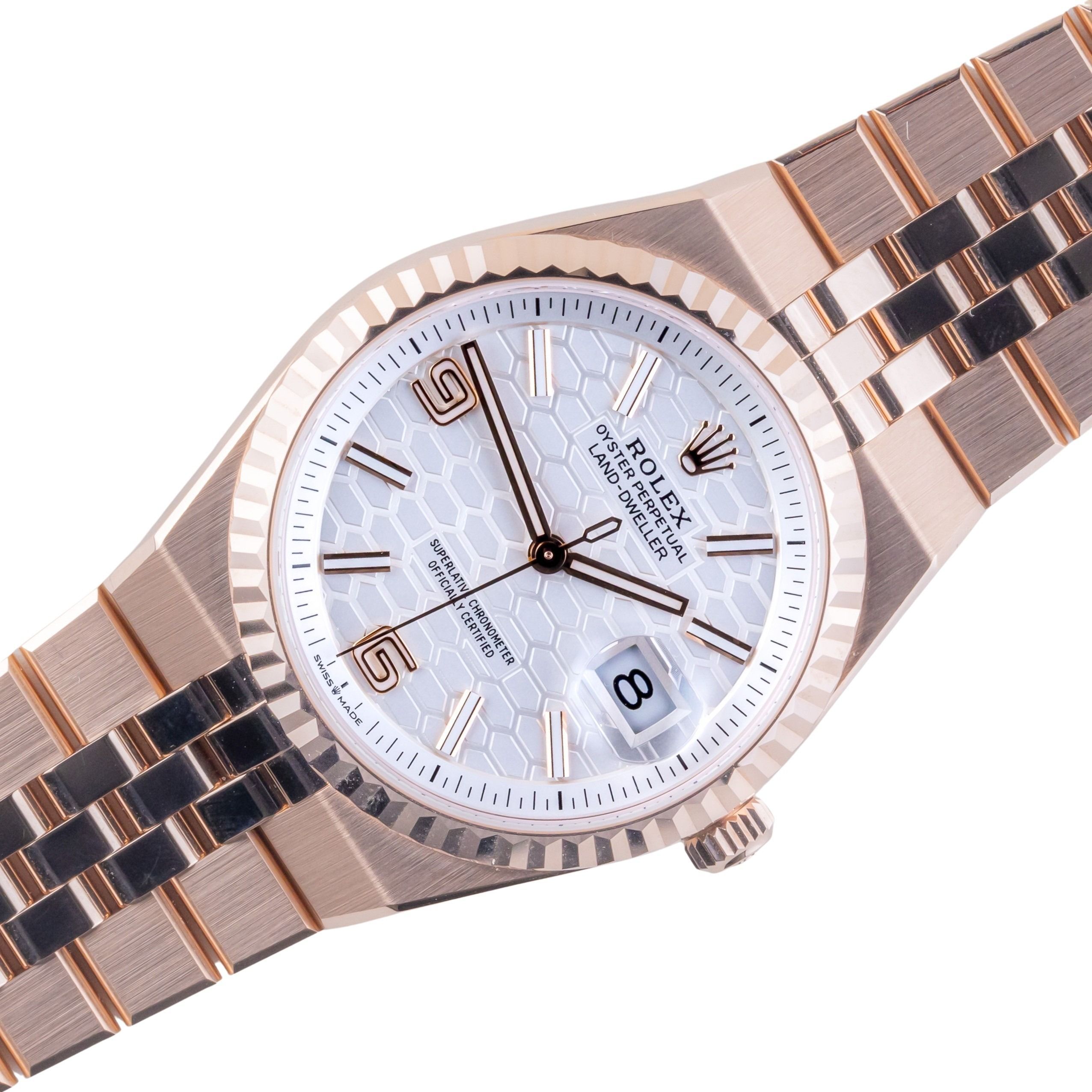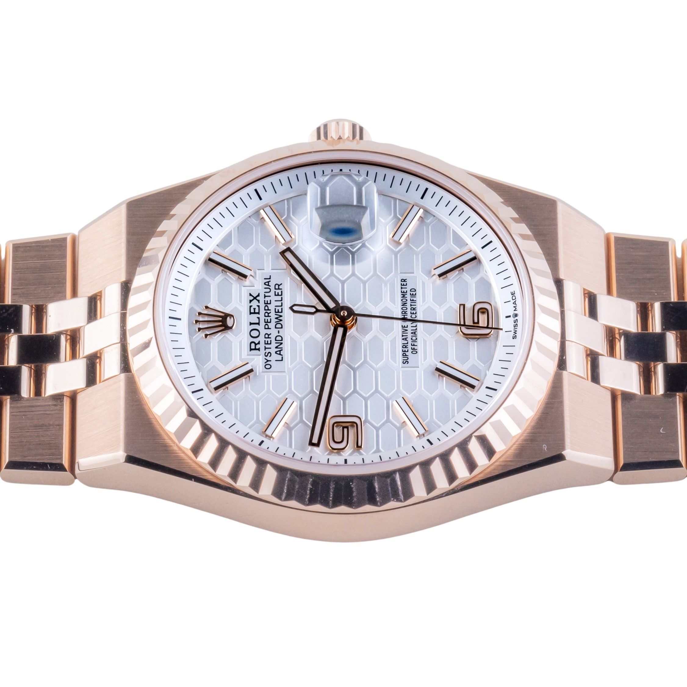 The Rolex Land-Dweller 127235 combines cutting-edge technology with timeless style. Featuring a 36mm 18K Rose gold case, this watch is powered by the self-winding Rolex Caliber 7135 movement, offering a 66-hour power reserve. The striking silver honeycomb dial with chromalight display ensures readability, while the Cyclops lens magnifies the date for clarity. It’s paired with a 18K rose gold jubilee bracelet for comfort and durability. An ideal luxury timepiece for any occasion, the Rolex Land-Dweller 127235 combines style and functionality, embodying Rolex’s renowned craftsmanship.Every watch sold by Langedyk Vintage Watches is included with a LVW watch box, Authenticity report and free worldwide (insured) shipment. In addition, every pre-owned watch is offered with our 12-month warranty from the date of purchase.