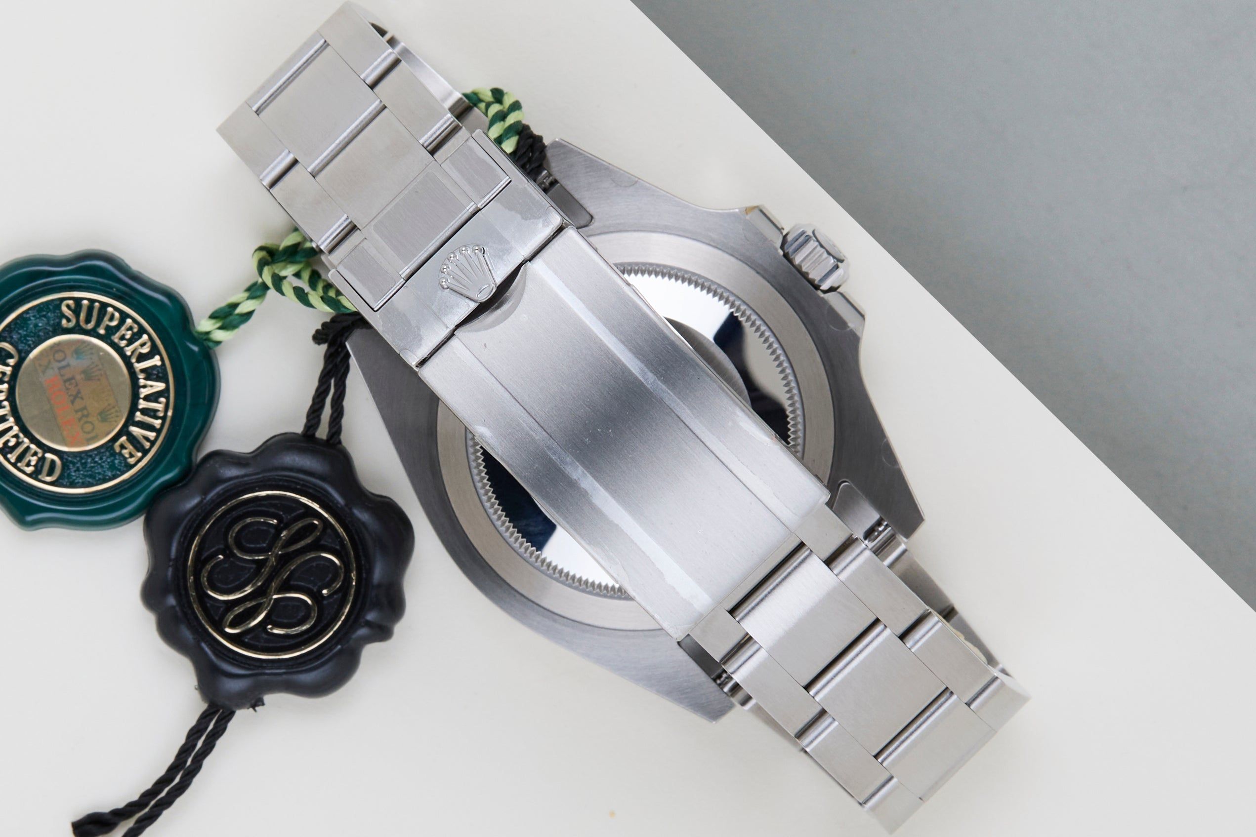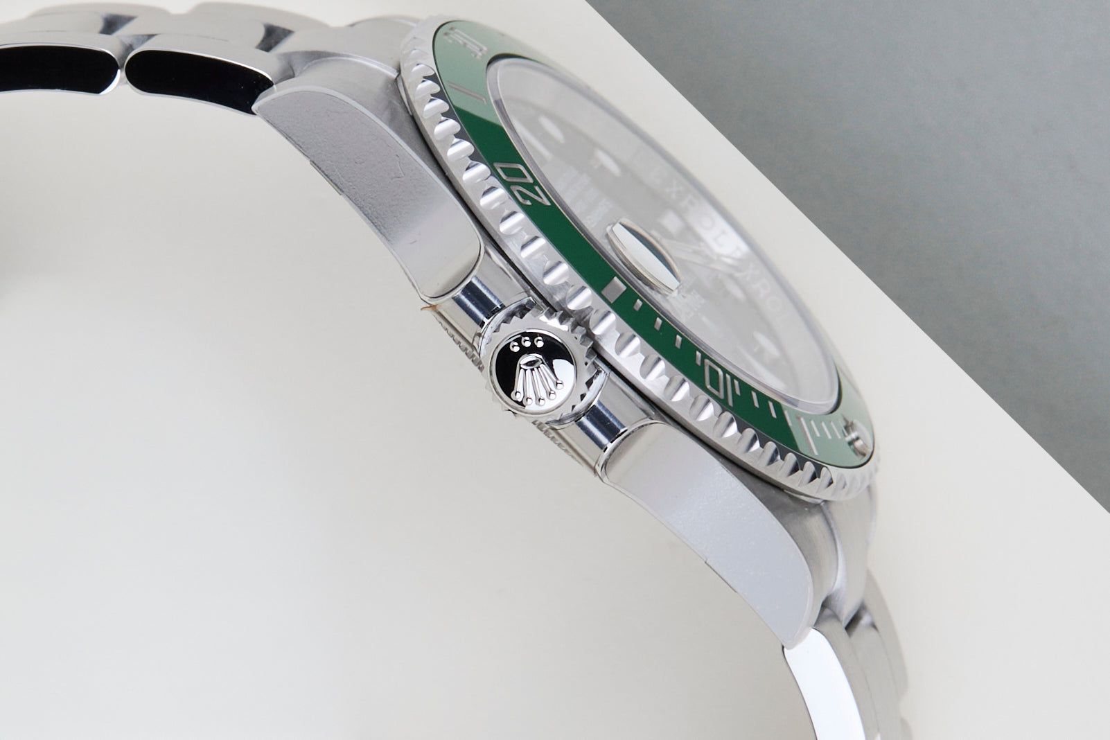 O relógio é totalmente feito de aço inoxidável. A Rolex utiliza 904L em seus relógios de aço, que é uma superliga extremamente resistente e altamente polida. Esta geração do Submariner é equipada com um mostrador Chromalight, que pode ser reconhecido pela luminescência azul. Este Submariner Date vem com um mostrador preto e um bezel verde, que pode ser derivado da referência 126610LV, Lunette Verte.