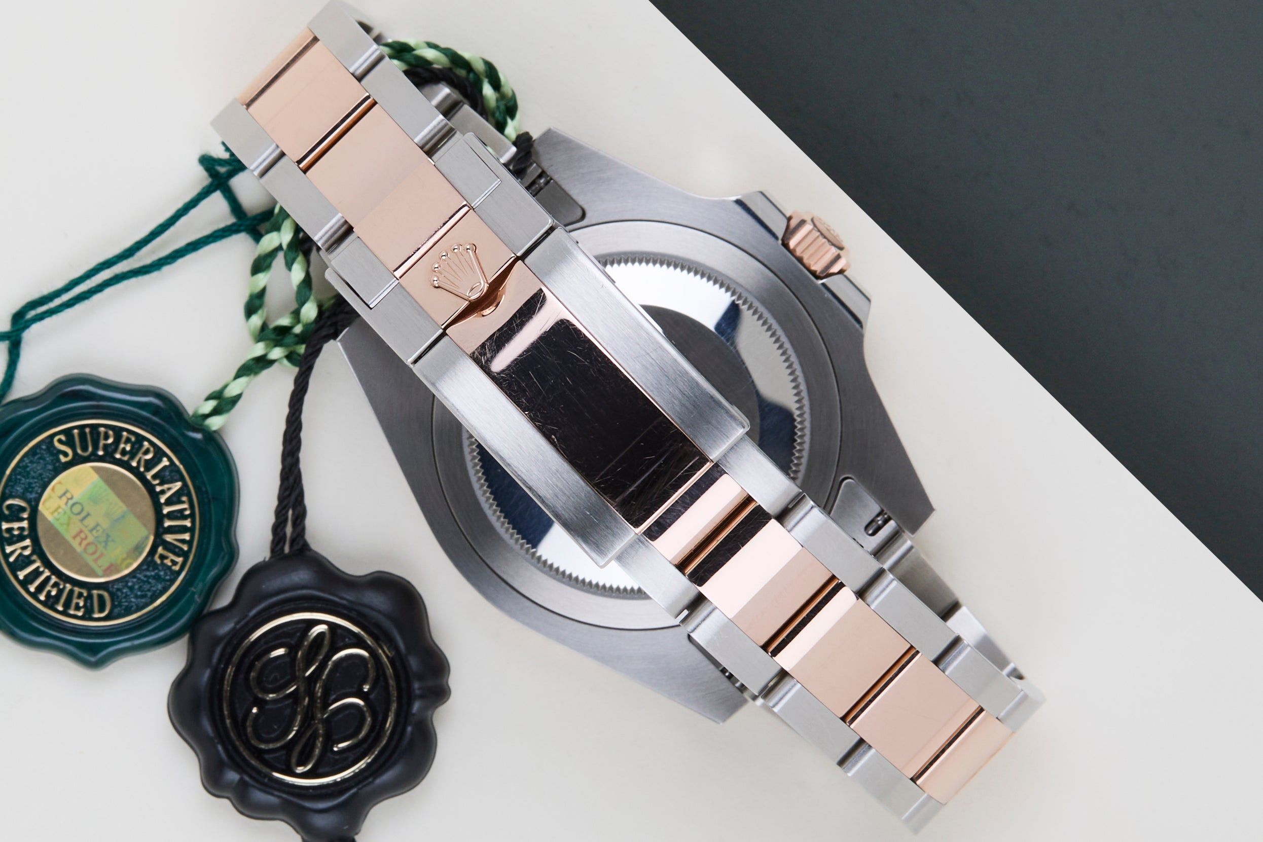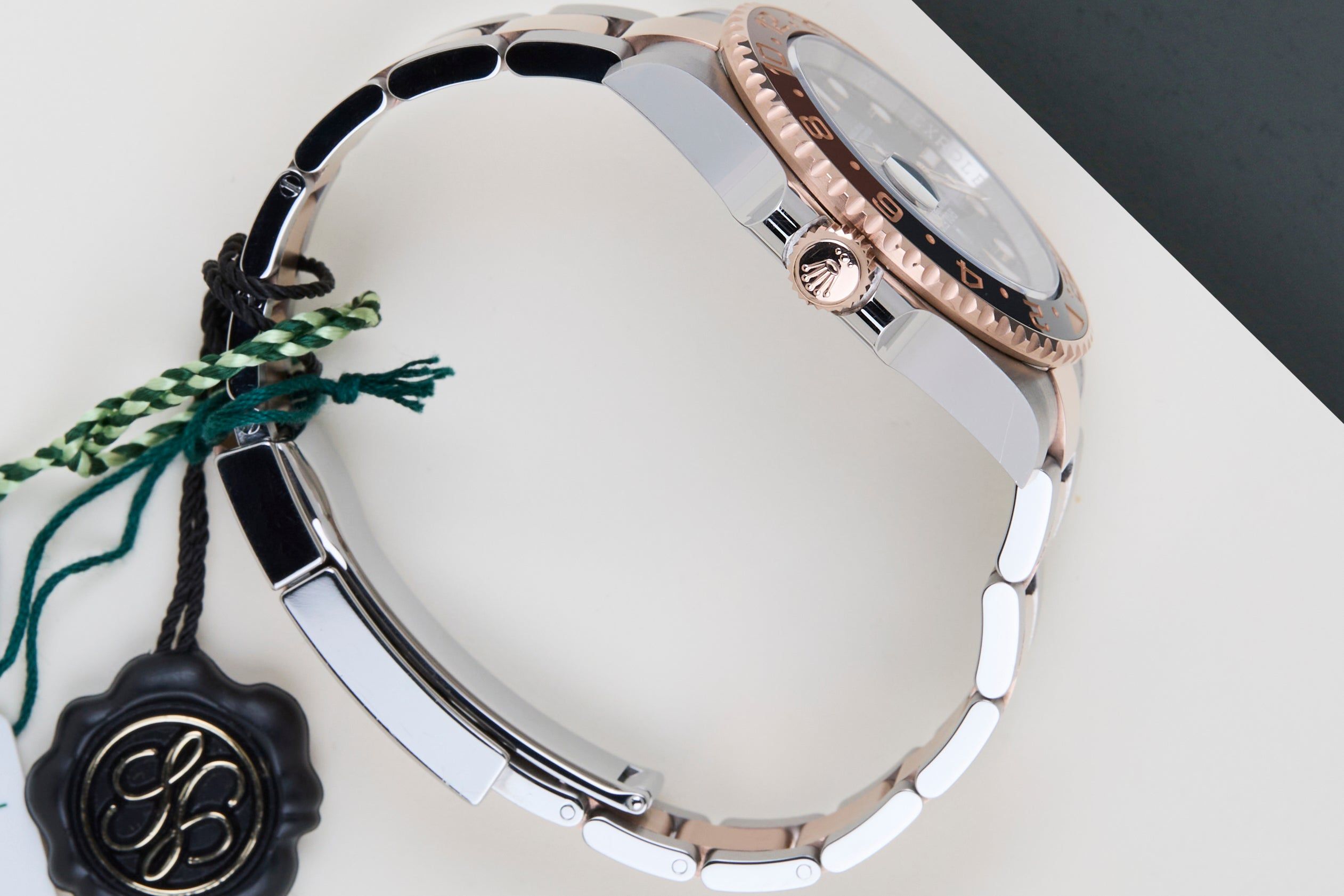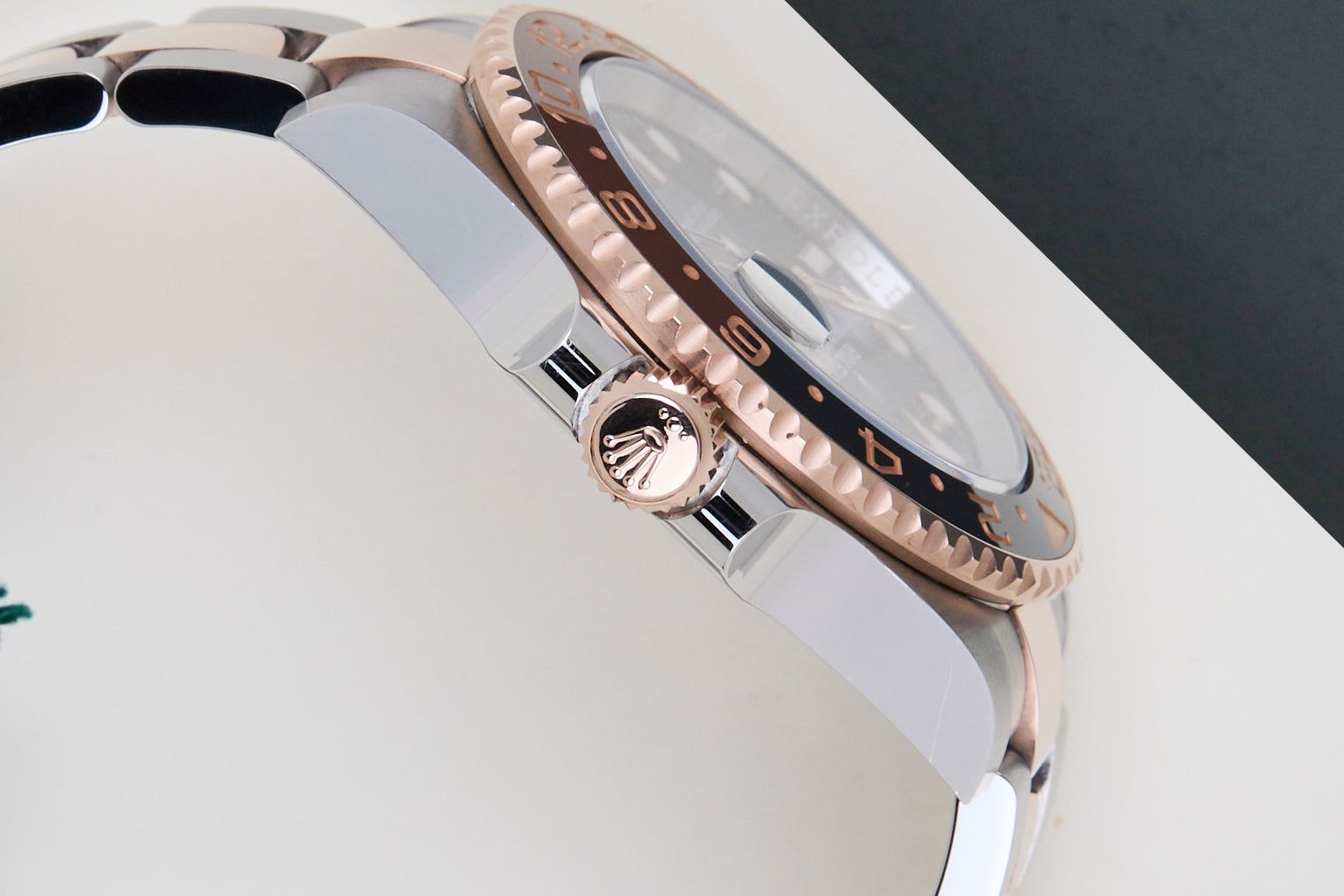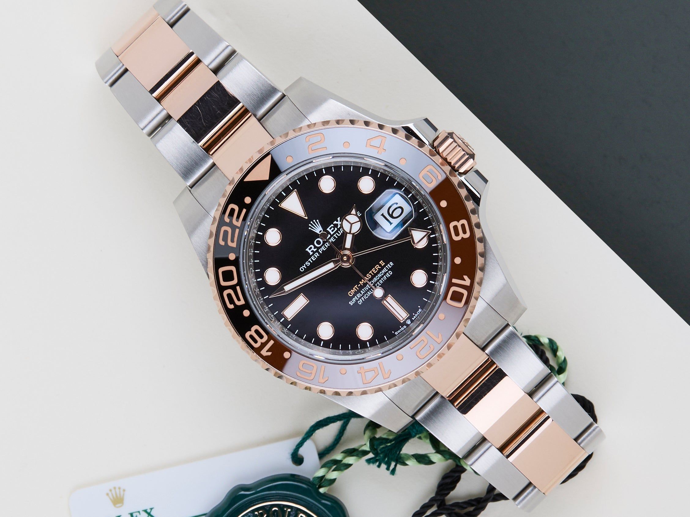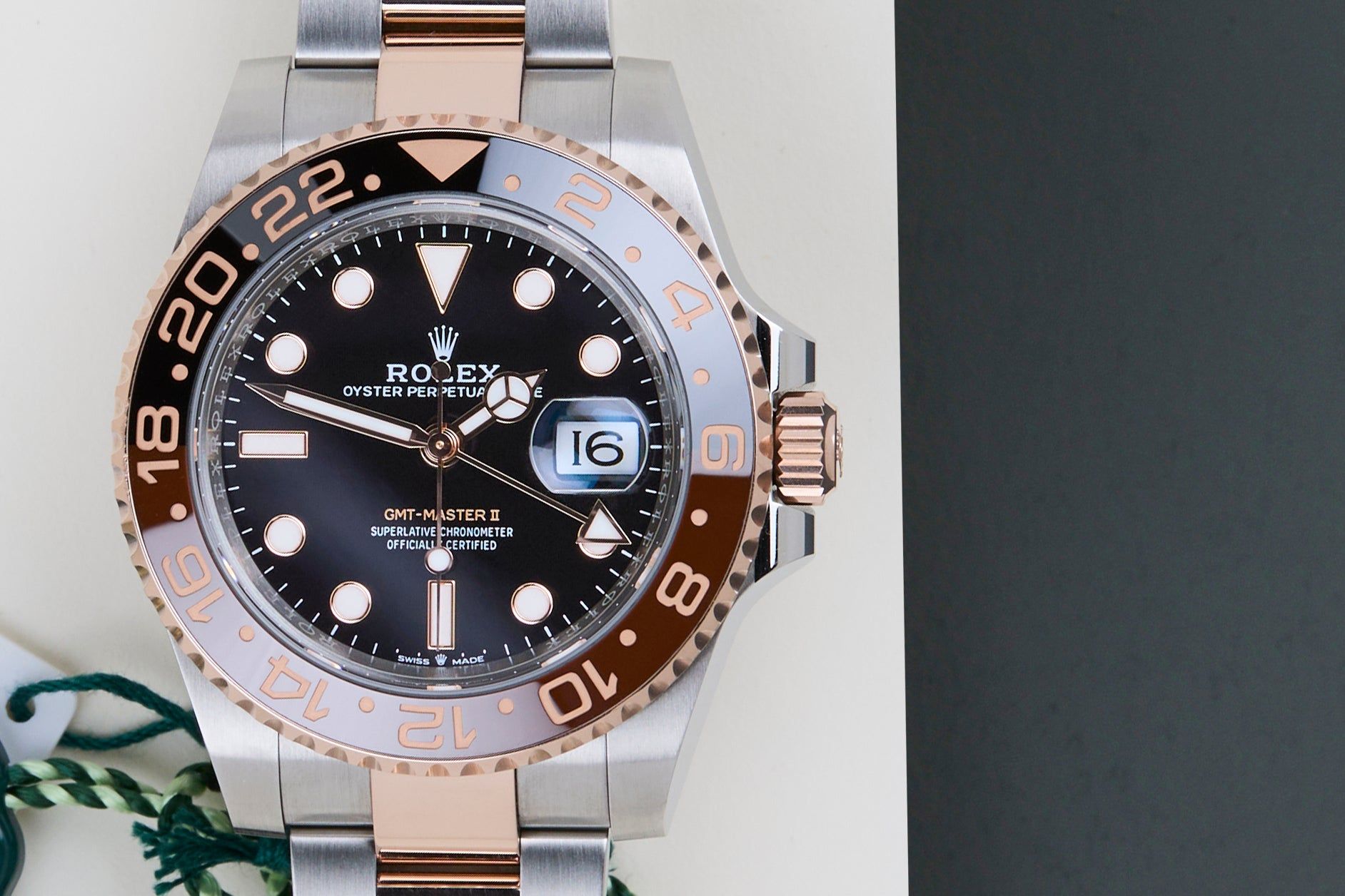 Este GMT está equipado com o Bezel Chocolate e Preto, que pode ser derivado da referência 126711CHNR, Lunette Chocolat Noire. O GMT-Master II 'Rootbeer' é feito de uma combinação de Ouro Rosa 18K e aço inoxidável e vem com uma pulseira Oyster, que é equipada com o Easylink. Esta extensão permite que o usuário amplie ou encurte a pulseira em 5 milímetros, melhorando a usabilidade e o conforto do relógio.
