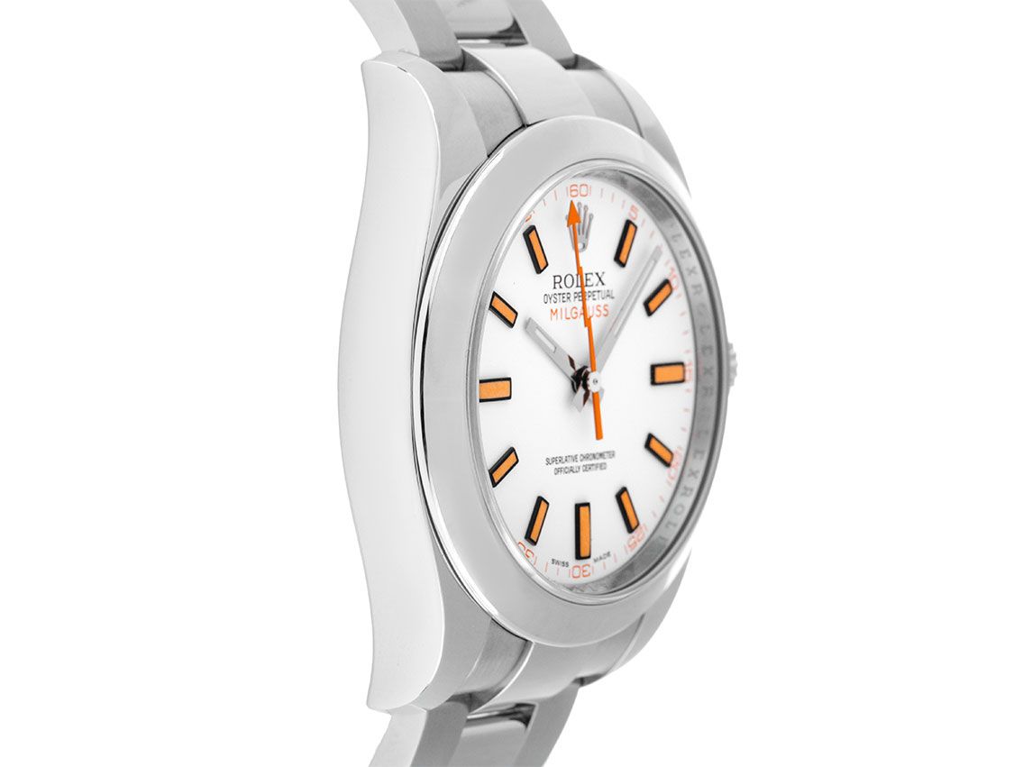 Rolex Oyster Perpetual Milgauss Stahl Automatik Armband OysterGehäuse Edelstahl poliert und satiniert, Gehäusedurchmesser ohne Krone 40mm, Gehäusehöhe 13,2mm. Lünette Edelstahl glatt und poliert. Armband Oyster Edelstahl poliert und satiniert, Faltschließe Edelstahl mit Hersteller-Logo. Zifferblatt weiß mit aufgesetzten Indexen und weißgoldenen Zeigern. Uhrwerk Automatik, Chronometer mit Zeugnis, Rolex Manufakturkaliber 3131 mit 31 Edelsteinen, Parachrom Breguetspirale, 1000 Gauss Magnetschutz Innengehäuse (Gauss ist die Maßeinheit für Magnetismus, 1000 Gauss bedeutet sehr starke Magnet Abschirmung durch das Innengehäuse). Anzeige von Stunde, Minute und orangefarbener "Blitz" Sekunde über Zeiger aus der Mitte mit Sekundenstopp zur sekundengenauen Einstellung der Uhrzeit. Saphirglas kratzfest. Krone verschraubbar mit Hersteller-Logo. Boden Edelstahl verschraubt und graviert. Gewicht der Uhr inklusive Armband 158g, Länge des Armbandes inklusive Gehäuse 190mm. Referenznummer: 116400, Gehäusenummer: V424XXX, Baujahr: 2008, ID: P2299158000126H-13100, Artikelnummer: 10000084315. Mit Gangkontrolle und kompletter äußerlicher Aufarbeitung von Januar 2026. Original Rolex Box und Garantie Papiere von August 2010, LC 100 / Germany EU sowie Beschreibung, Ledermäppchen, Rolex Chronometer-Siegel und Watchregister Auszug von Januar 2026, The Watch Register Zertifikat / ohne Eintrag (Internationale Datenbank für verlorene oder gestohlene Uhren), Full Set. Superschnäppchen, Kapitalanlage mit Wertsteigerungspotential, aus erster Hand, fast nicht getragen, extrem seltenes ausverkauftes Sammlerstück wird nicht mehr hergestellt. Wie Neu. Lieferzeit sofort.