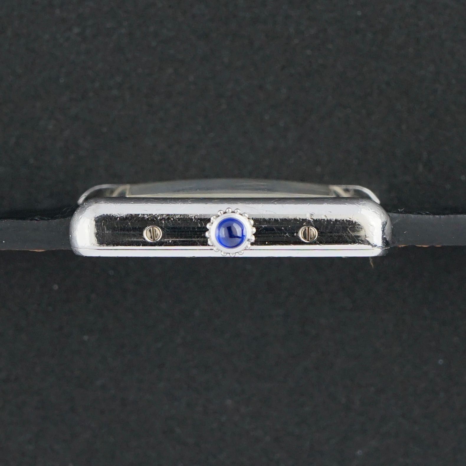 This vintage Cartier Tank Vermeil dates to 2001 and features a solid silver case that has not been gold plated, preserving its elegant silver tone in good overall condition. The white dial is detailed with blue Roman numerals, blue Cartier hands, a blue railroad minute track, and a blue Cartier logo, all complemented by a blue cabochon ruby crown.Inside is a quartz movement that was overhauled in January 2026 and currently runs and functions excellently. The watch comes fitted with a brand new black calf leather strap with a crocodile motif, and also includes the original Bordeaux red Cartier crocodile leather strap with a Cartier folding clasp. More uncommon than the gold-plated version, this piece makes an excellent vintage dress watch for a lady’s wrist.