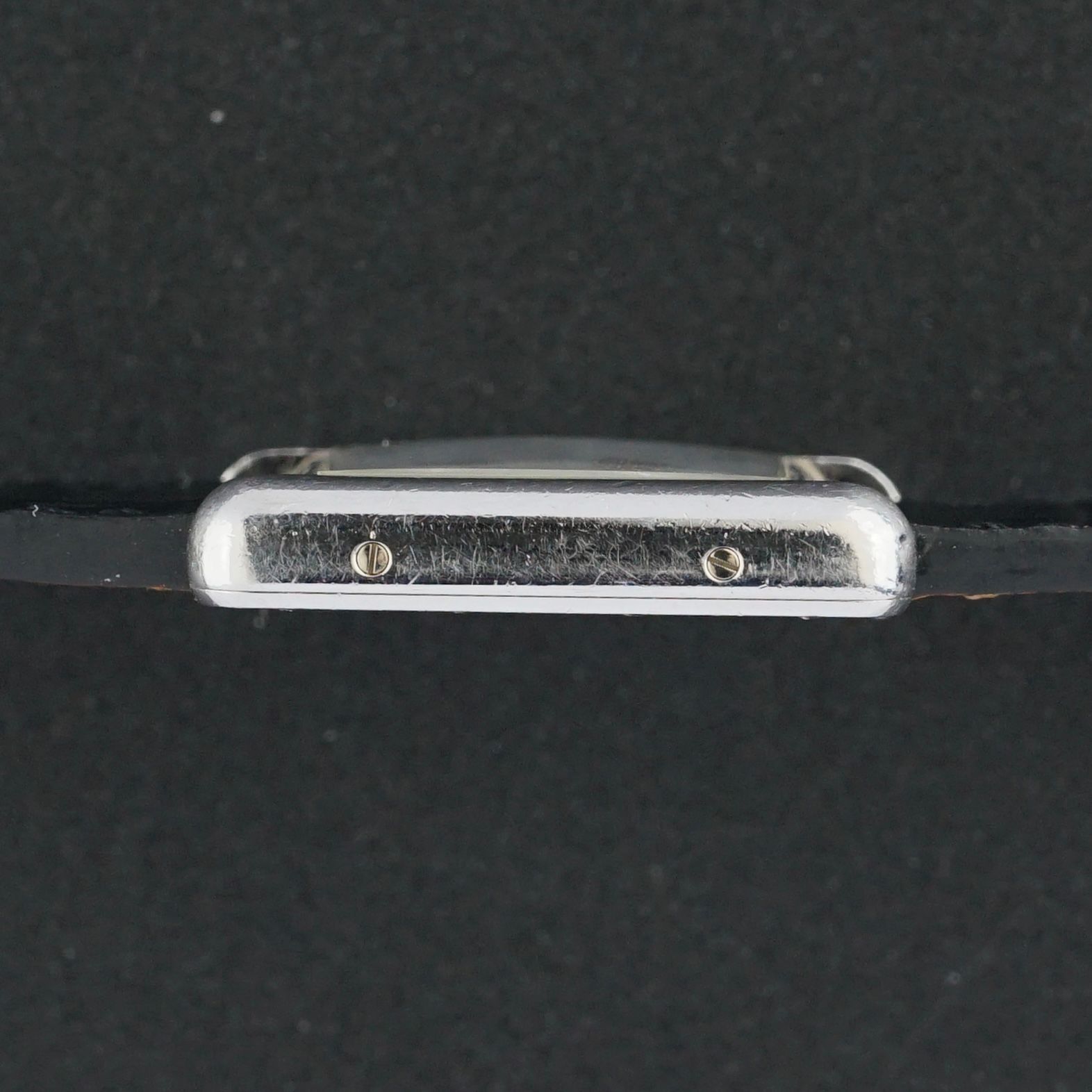 Dentro, há um movimento de quartzo que foi revisado em janeiro de 2026 e atualmente funciona e opera de forma excelente. O relógio vem equipado com uma nova pulseira de couro de bezerro preta com um motivo de crocodilo e também inclui a pulseira original de couro de crocodilo bordeaux da Cartier com fecho dobrável Cartier. Mais incomum do que a versão banhada a ouro, esta peça é um excelente relógio vintage de vestir para o pulso de uma dama.