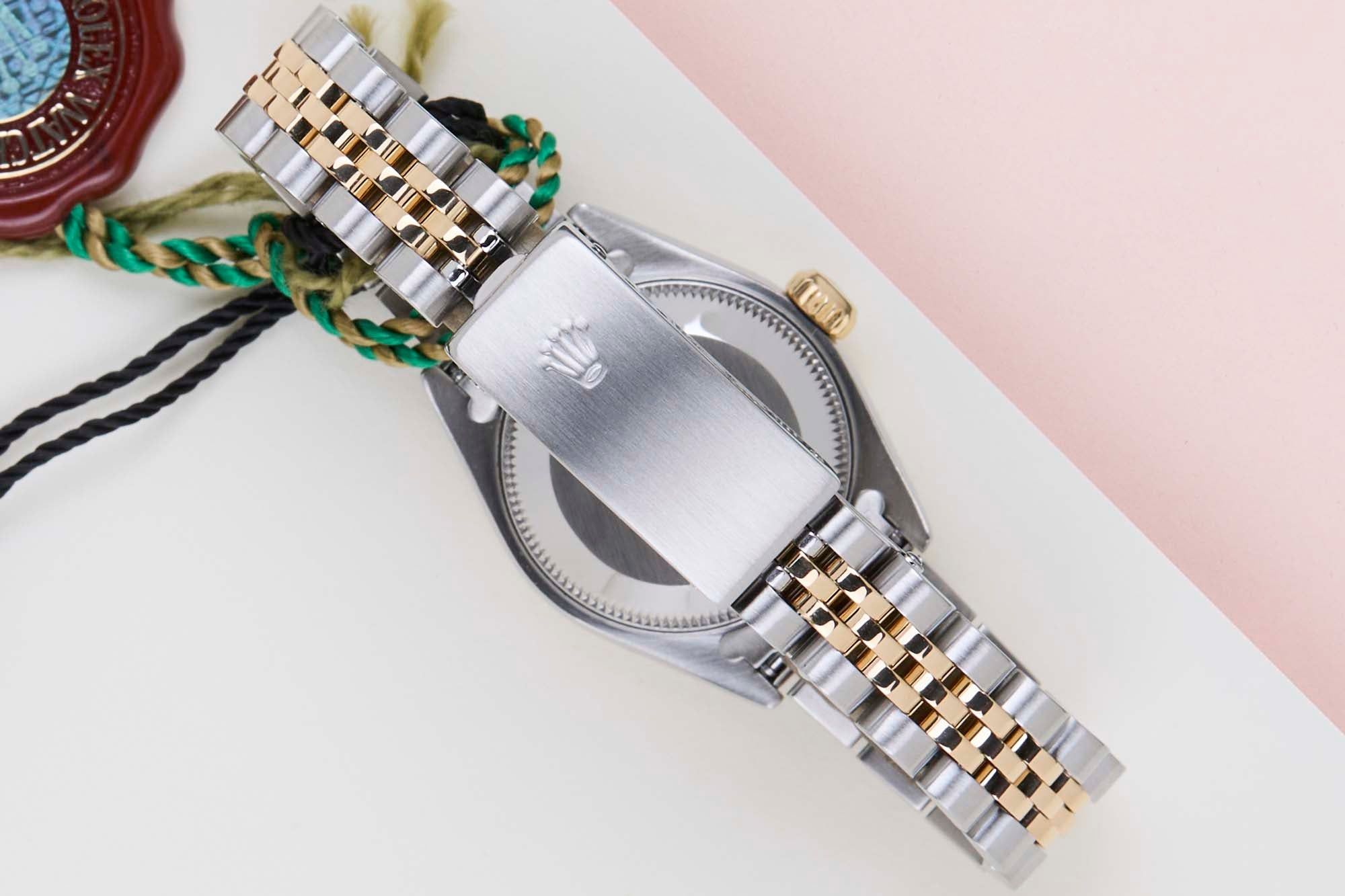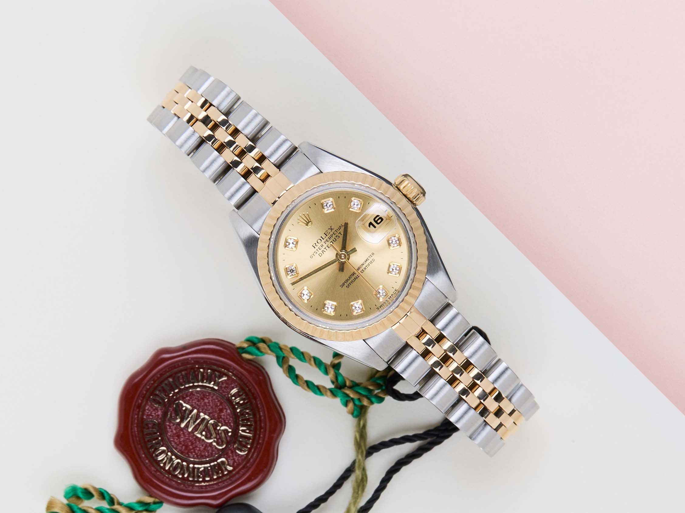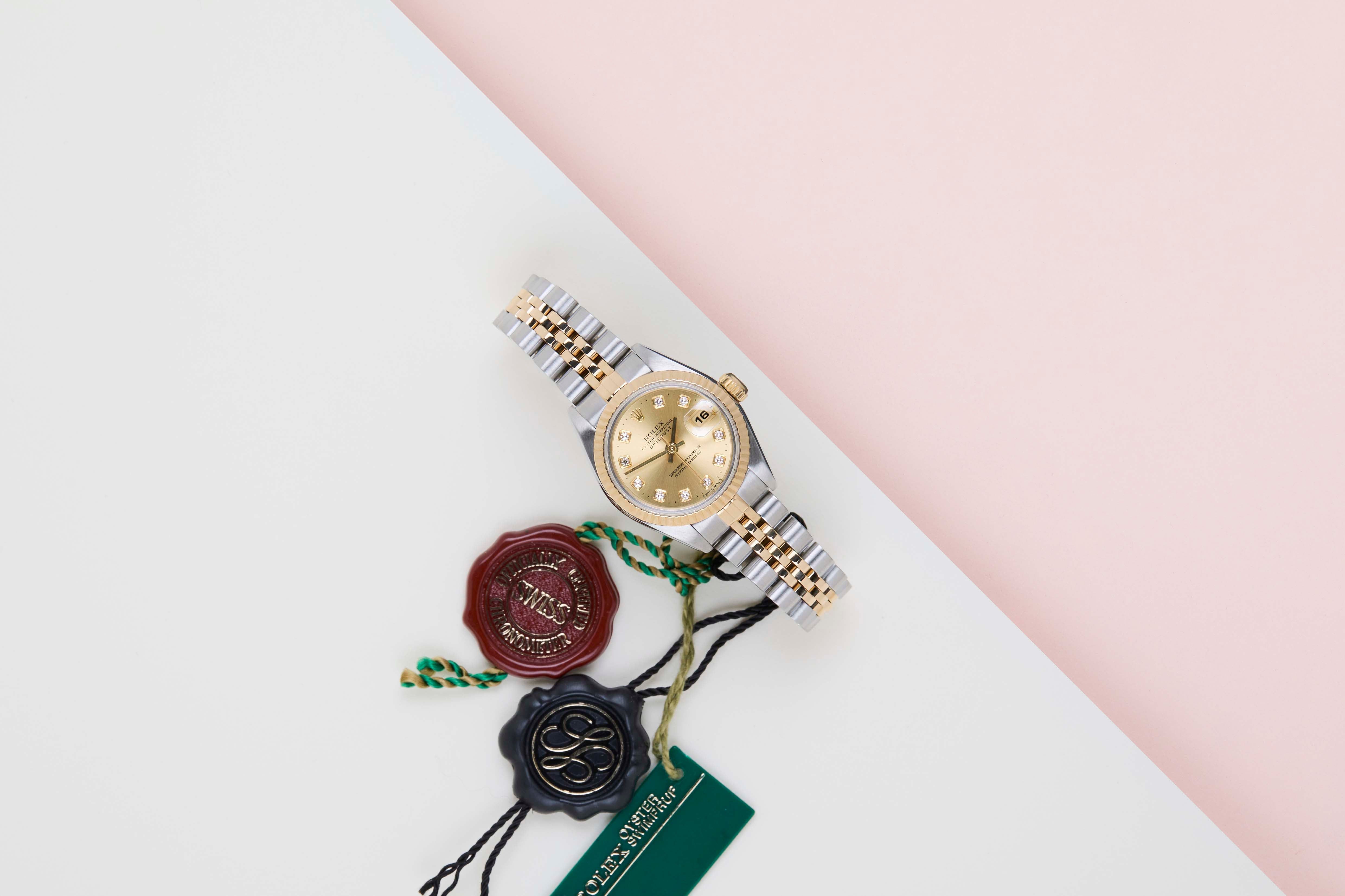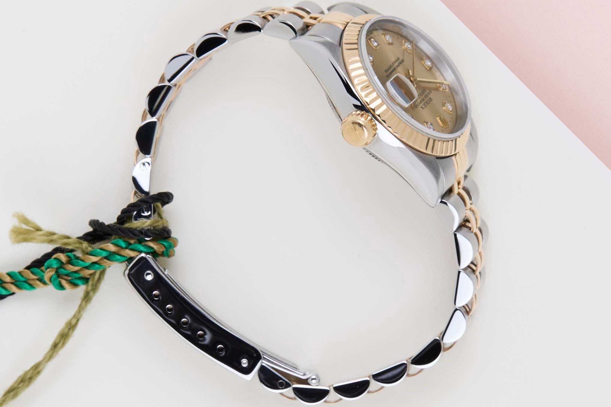 Full-Set | Original Rolex Champagne Diamond Dial | Including Rolex Green Tag Rolex introduced the original Datejust in 1945 to celebrate the company's 40th anniversary. Due to the enormous success, Rolex released the first Lady-Datejust in 1957.This Rolex Datejust 26 'Champagne Diamond Dial - Jubilee' dates back to November 1999.This Datejust is made of a combination of 18k Yellow Gold and stainless steel and is fitted with a Jubilee bracelet.This Rolex Datejust 26 is in Mint condition and comes with the original Rolex Warranty Card and box. Furthermore the watch comes with one year of Steiner warranty.