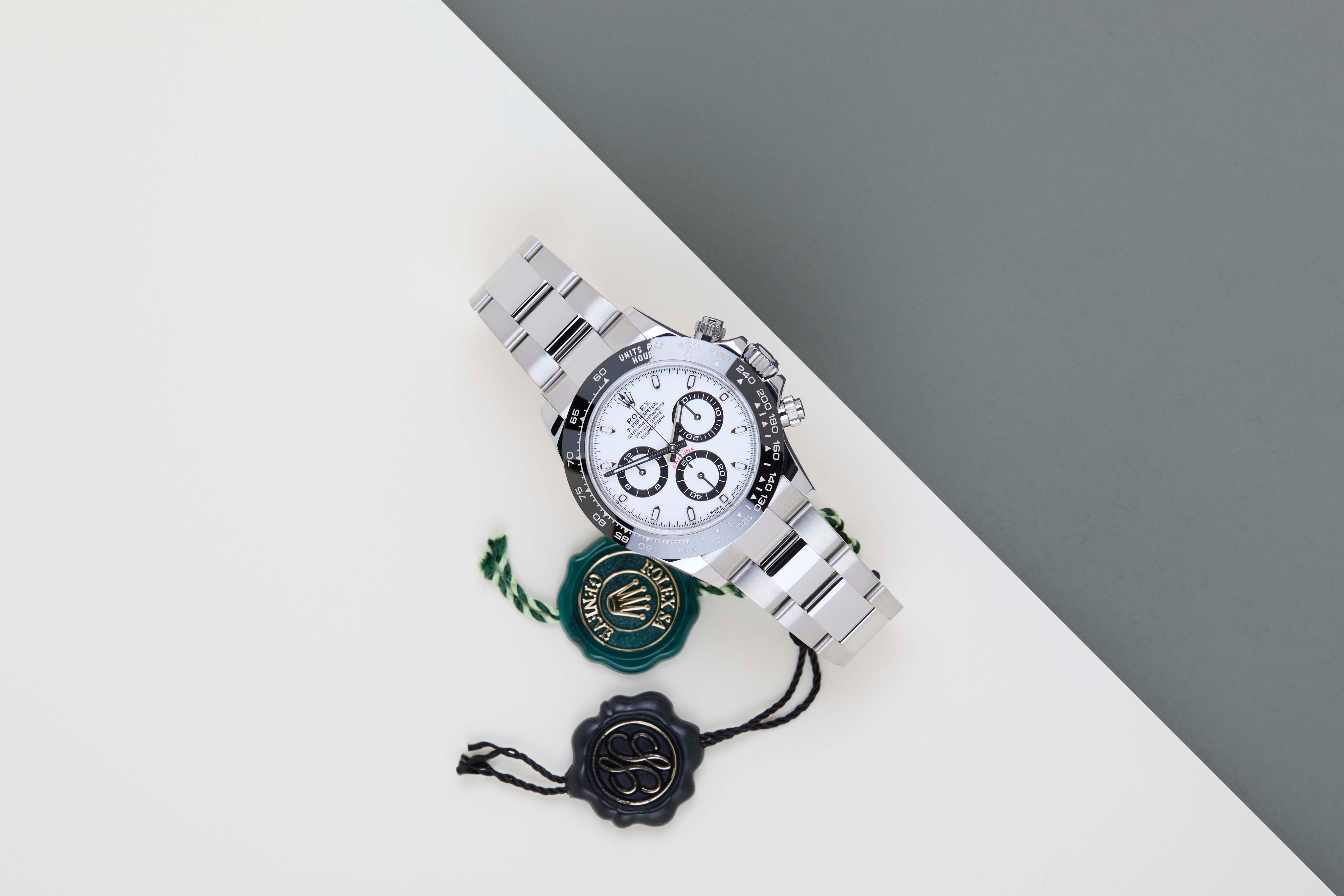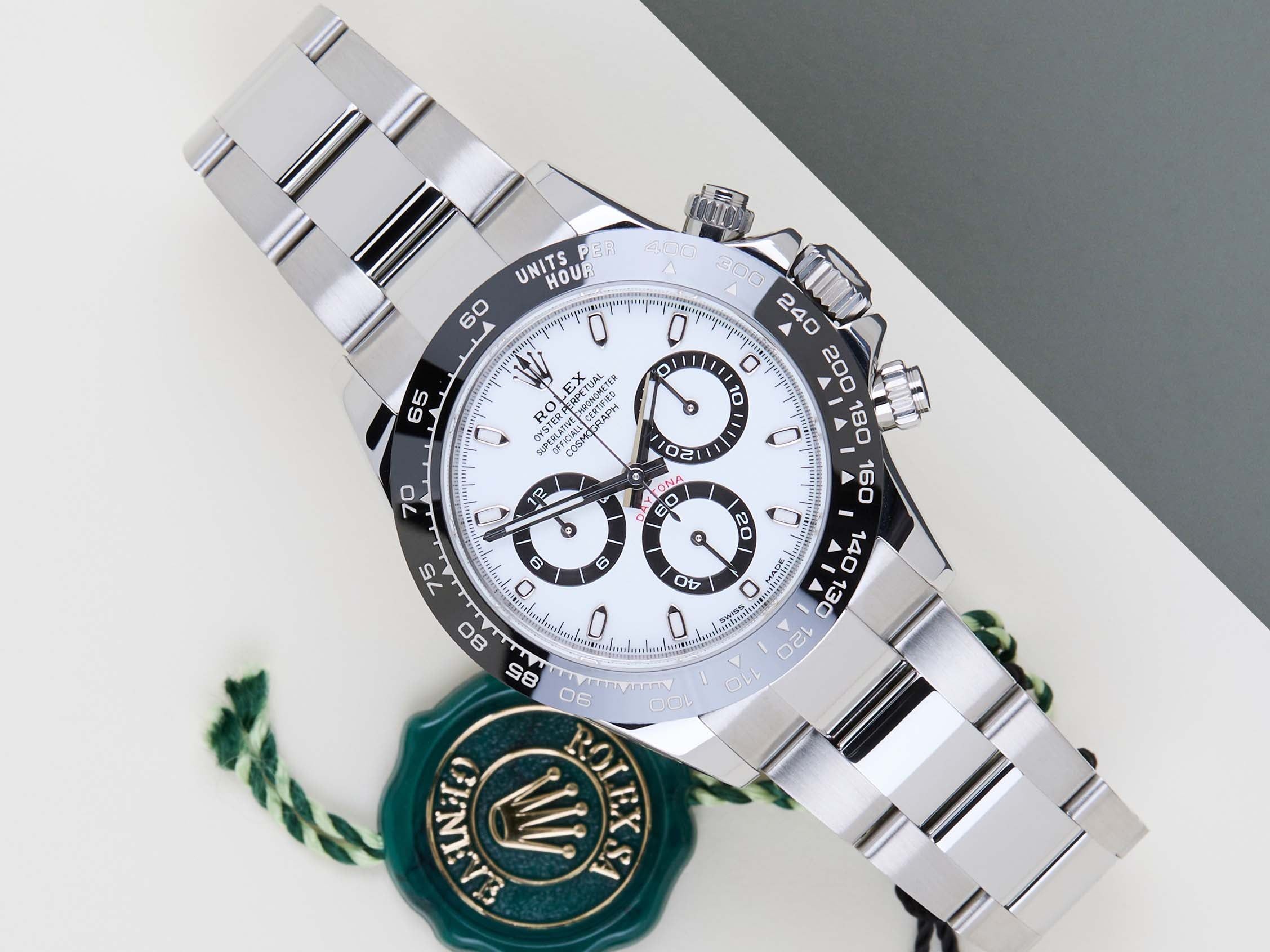 The Rolex Cosmograph Daytona is considered one of the most popular models in the world. The reasons for this vary from the watch's history in timekeeping, racing and the love it evoked amongst timepiece enthusiasts, to the huge demand for both the current and the vintage references.This Stunning Rolex Daytona 'White Dial - Panda' was sold for the first time in June 2020.This Rolex Daytona is in Mint Condition and comes as a full-set with the original Rolex Warranty Card and Original Rolex box. Furthermore, the watch has been checked by our watchmaker, and therefore it comes with one year of Steiner warranty.