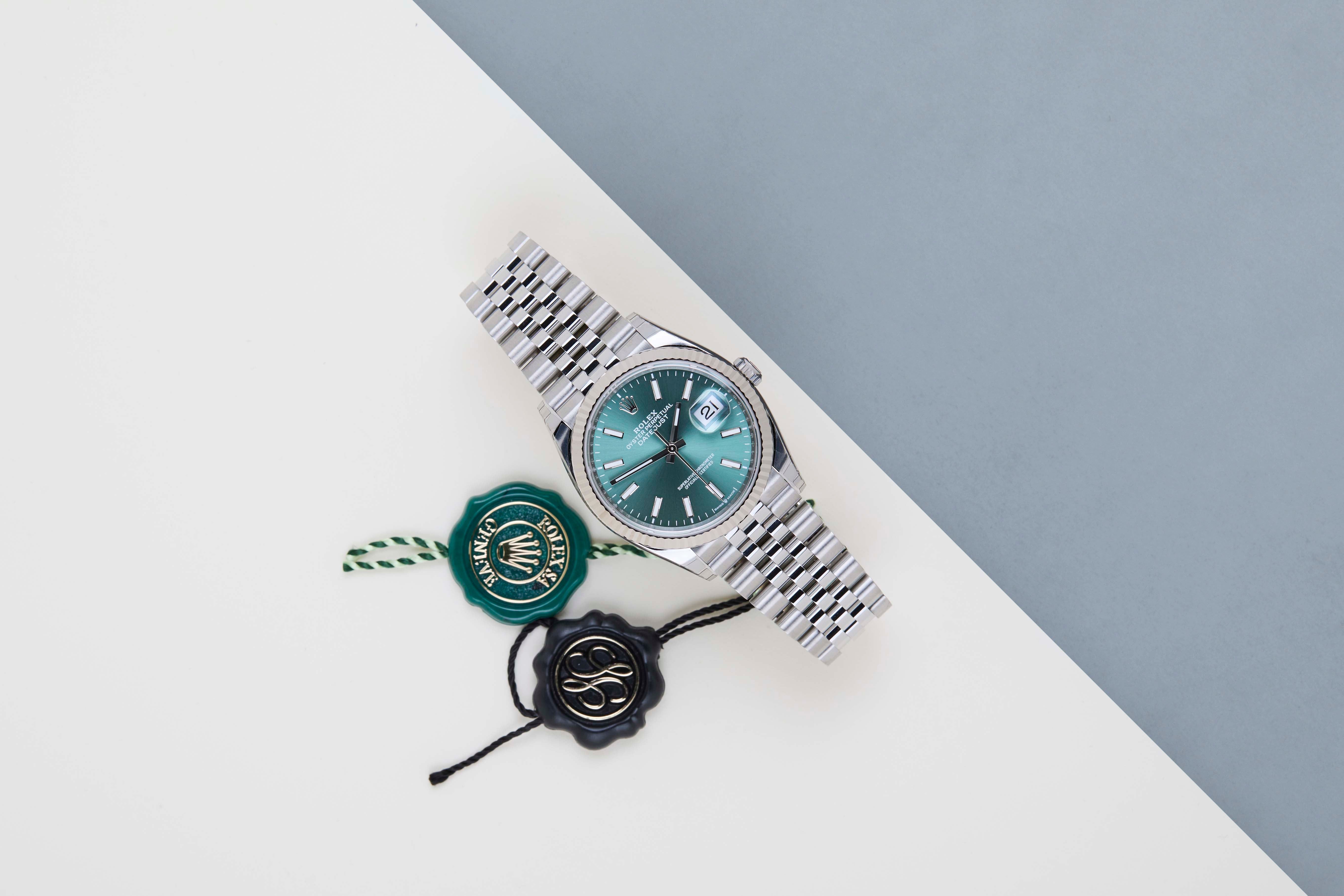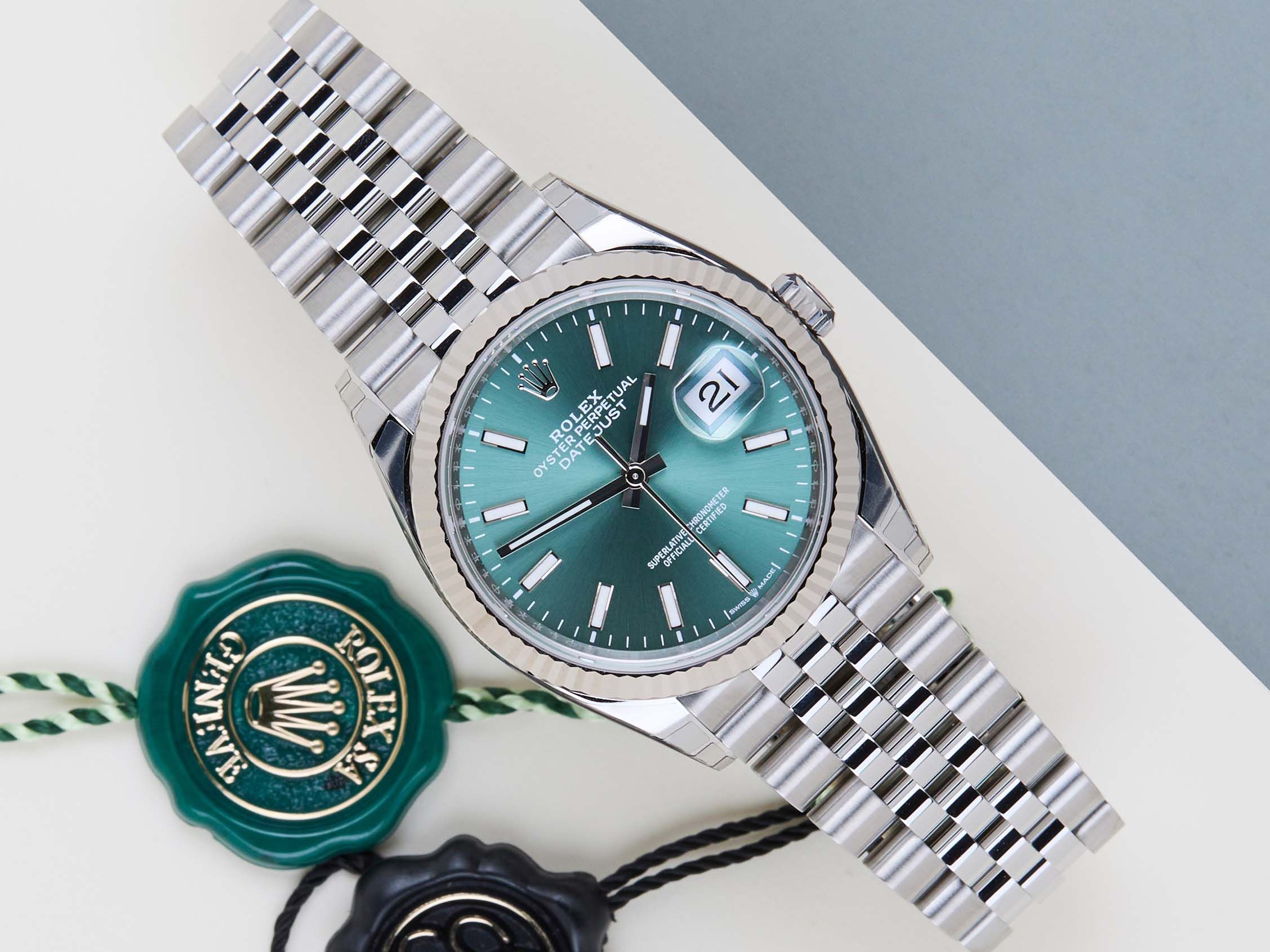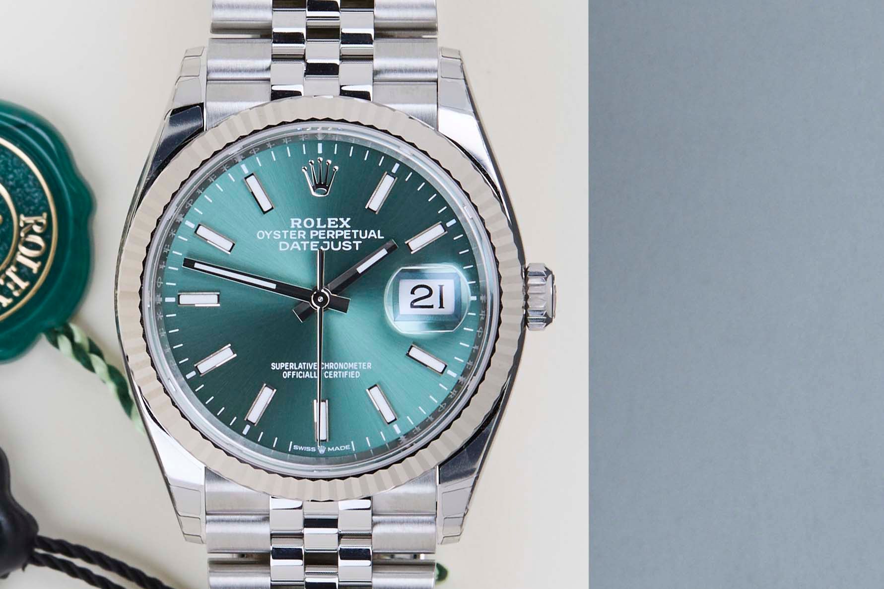 New & Unworn | Full Set | International Rolex Warranty Until December 2030Rolex introduced the original Datejust in 1945 to celebrate the company's 40th anniversary. Due to the various case sizes and materials, the Datejust has been ingrained in Rolex's history and remains incredibly popular for nearly 80 years.This Rolex Datejust 'Mint Green Dial - Jubilee' was sold for the first time in December 2025.This Datejust is made of a combination of 18k White Gold and stainless steel and is fitted with an Jubilee bracelet which is equipped with the Easylink. This extension, allows the wearer to either extend or shorten the bracelet by 5 millimeters, improving the wearability and usability of the watch.This Rolex Datejust 36 is in New & Unworn condition and comes with the original Rolex Warranty Card and box. Furthermore, the watch still has International Rolex Warranty until December 2030.