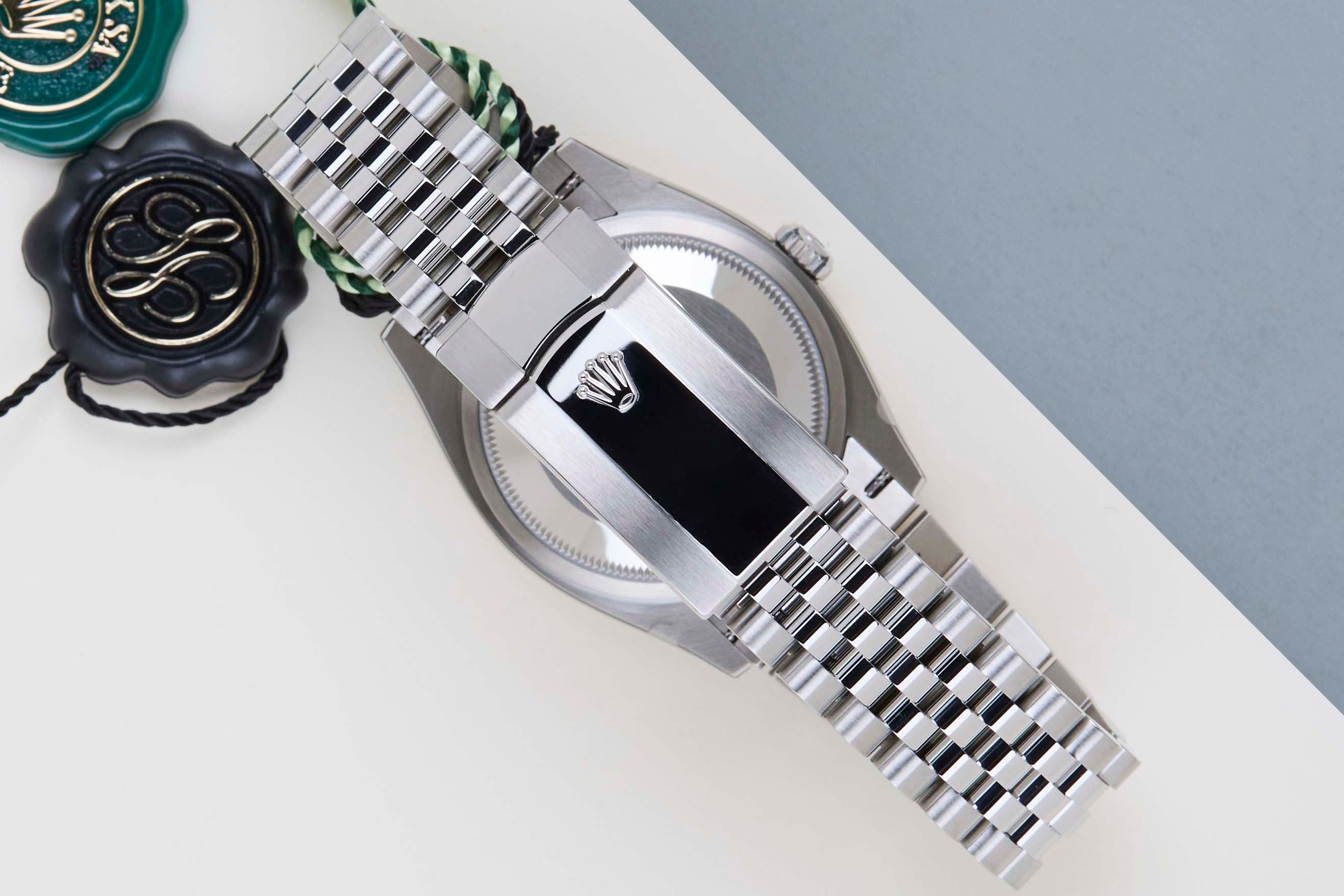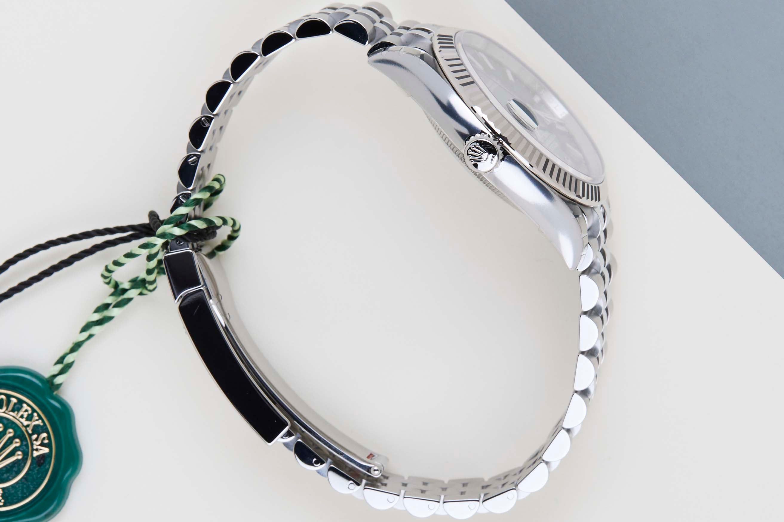 Este Rolex Datejust 'Mostarda Verde - Jubilee' foi vendido pela primeira vez em Dezembro de 2025. Este Datejust é feito de uma combinação de Ouro Branco 18k e aço inoxidável e vem com uma pulseira Jubilee que possui o Easylink. Esta extensão permite ao usuário aumentar ou diminuir a pulseira em 5 milímetros, melhorando o conforto e a usabilidade do relógio.