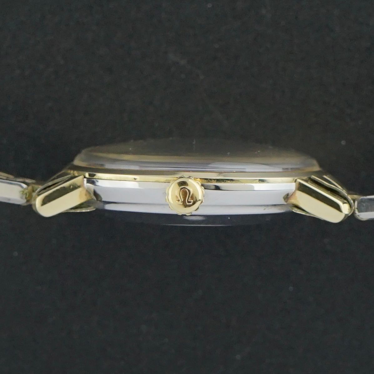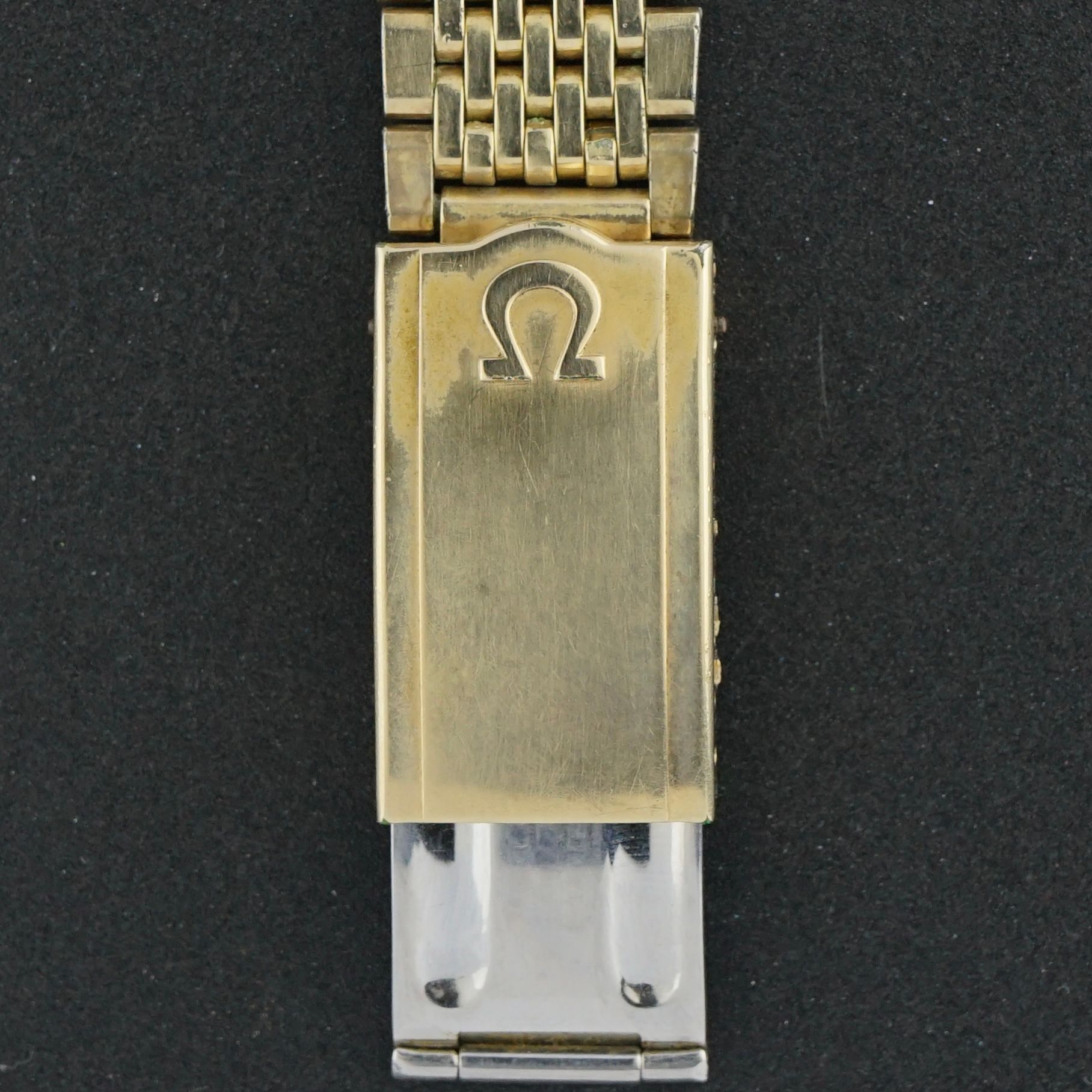 Este Vintage Omega Seamaster De Ville de 1963, co-assinado pelo joalheiro “Meister”, foi originalmente feito pela Omega para varejistas selecionados. O mostrador branco apresenta um efeito de sol e permanece em perfeito estado. Os detalhes em dourado incluem o logotipo da Omega, os ponteiros, os marcadores de horas e a janela da data. A caixa de aço inoxidável é banhada a ouro e está em muito bom estado. Está equipada com a pulseira original Omega "Beads of Rice" banhada a ouro, totalmente intacta, sem desbotamento do ouro.