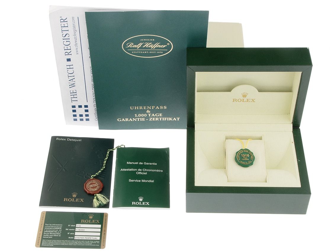 Inklusive certified pre owned Siegel / Uhrenpass mit einem Farbbild, der genauen Beschreibung sowie dem Wiederbeschaffungswert der Uhr über 12950,-€ und 1000 Tage Garantie ab Kaufdatum.