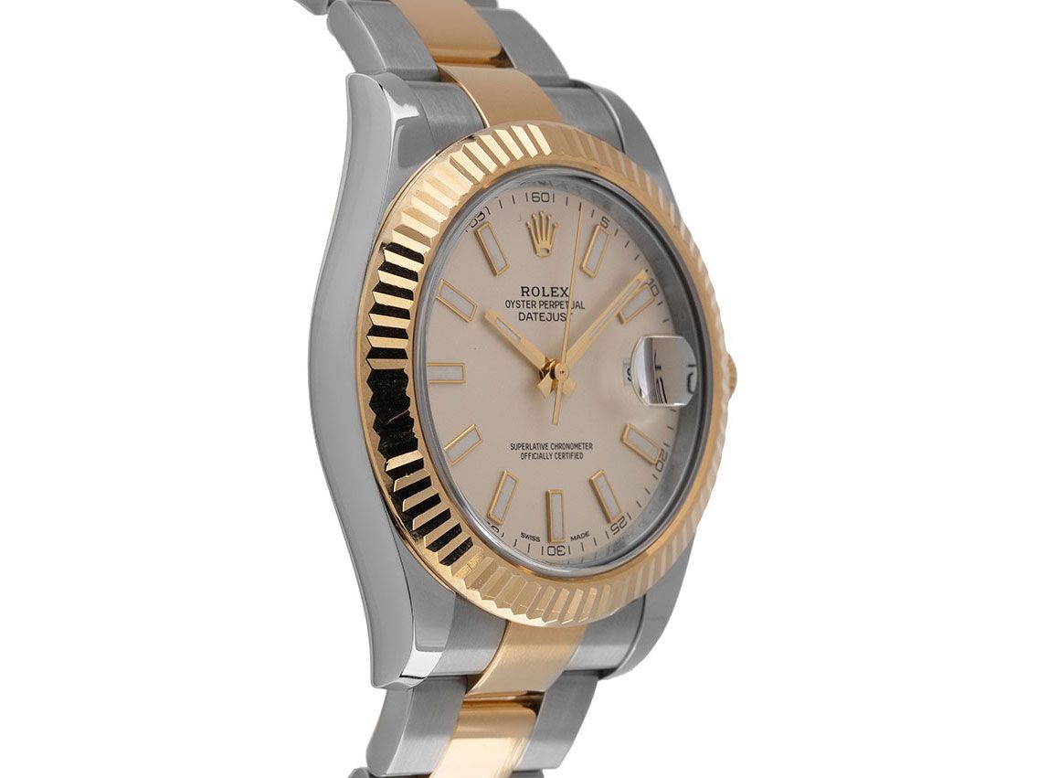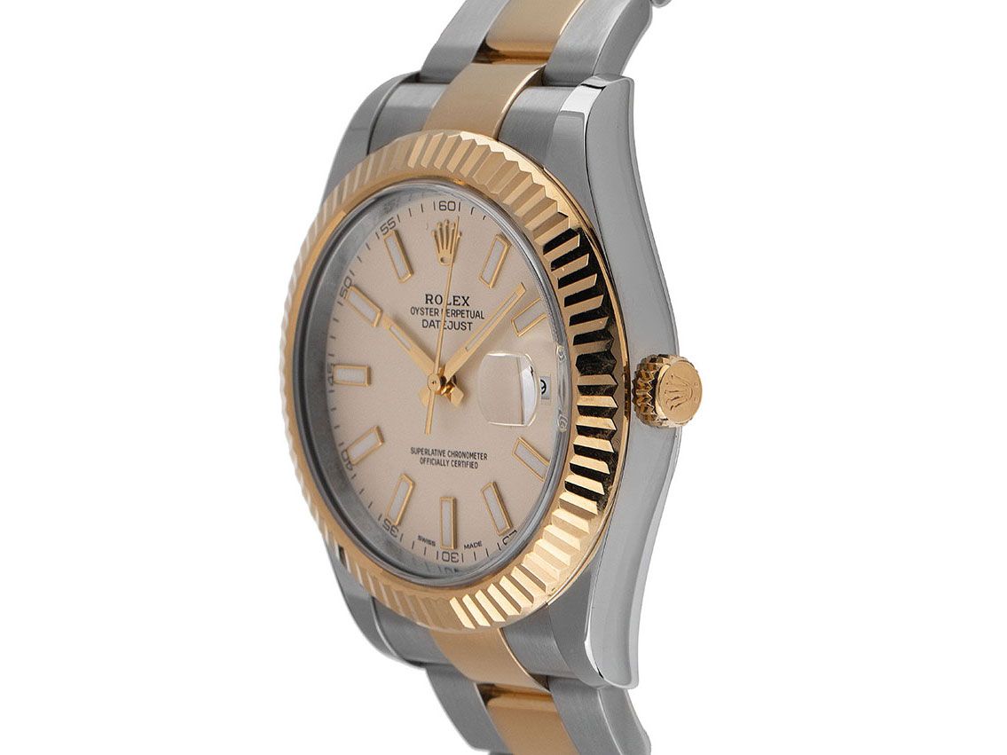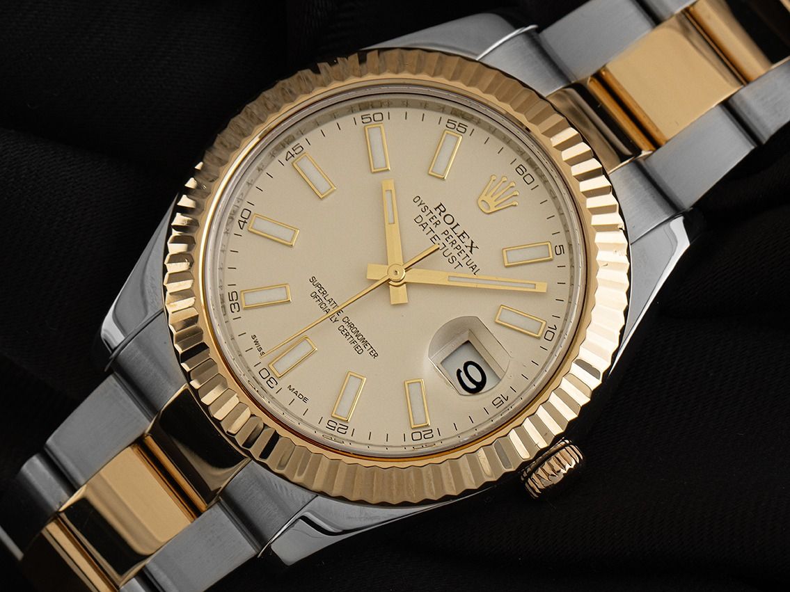 Rolex Datejust II Stahl 18kt Gelbgold Automatik Armband Oyster Stahl 18kt GelbgoldGehäuse Edelstahl poliert und satiniert, Gehäusedurchmesser ohne Krone 41mm, Gehäusehöhe 12,1mm. Lünette 18kt Gelbgold geriffelt und poliert. Armband Oyster Edelstahl / 18kt Gelbgold poliert und satiniert, Faltschließe Edelstahl / 18kt Gelbgold mit Hersteller-Logo. Zifferblatt cremefarben mit aufgesetzten gelbgoldenen Indexen und gelbgoldenen Zeigern. Uhrwerk Automatik, Chronometer mit Zeugnis, Rolex Manufakturkaliber 3135 mit 31 Edelsteinen. Anzeige von Stunde, Minute und Sekunde über Zeiger aus der Mitte mit Sekundenstopp zur sekundengenauen Einstellung der Uhrzeit, Datumsanzeige mit Schnellverstellung unter Glaslupe bei 3 Uhr. Saphirglas kratzfest. Krone verschraubbar mit Hersteller-Logo. Boden Edelstahl verschraubt. Gewicht der Uhr inklusive Armband 162g, Länge des Armbandes inklusive Gehäuse 195mm. Referenznummer: 116333, Gehäusenummer: V782XXX, ID: P2356150000126H-12950, Artikelnummer: 10000084411. Mit Gangkontrolle und kompletter äußerlicher Aufarbeitung von Januar 2026. Original Rolex Box mit Umkarton und Garantie Papiere ohne Datumseintrag, LC 216 / Portugal EU sowie Beschreibung, Ledermäppchen, Rolex Chronometer-Siegel und Watchregister Auszug von Januar 2026, The Watch Register Zertifikat / ohne Eintrag (Internationale Datenbank für verlorene oder gestohlene Uhren), Full Set. Kapitalanlage mit Wertsteigerungspotential, fast nicht getragen. Wie Neu. Lieferzeit sofort.