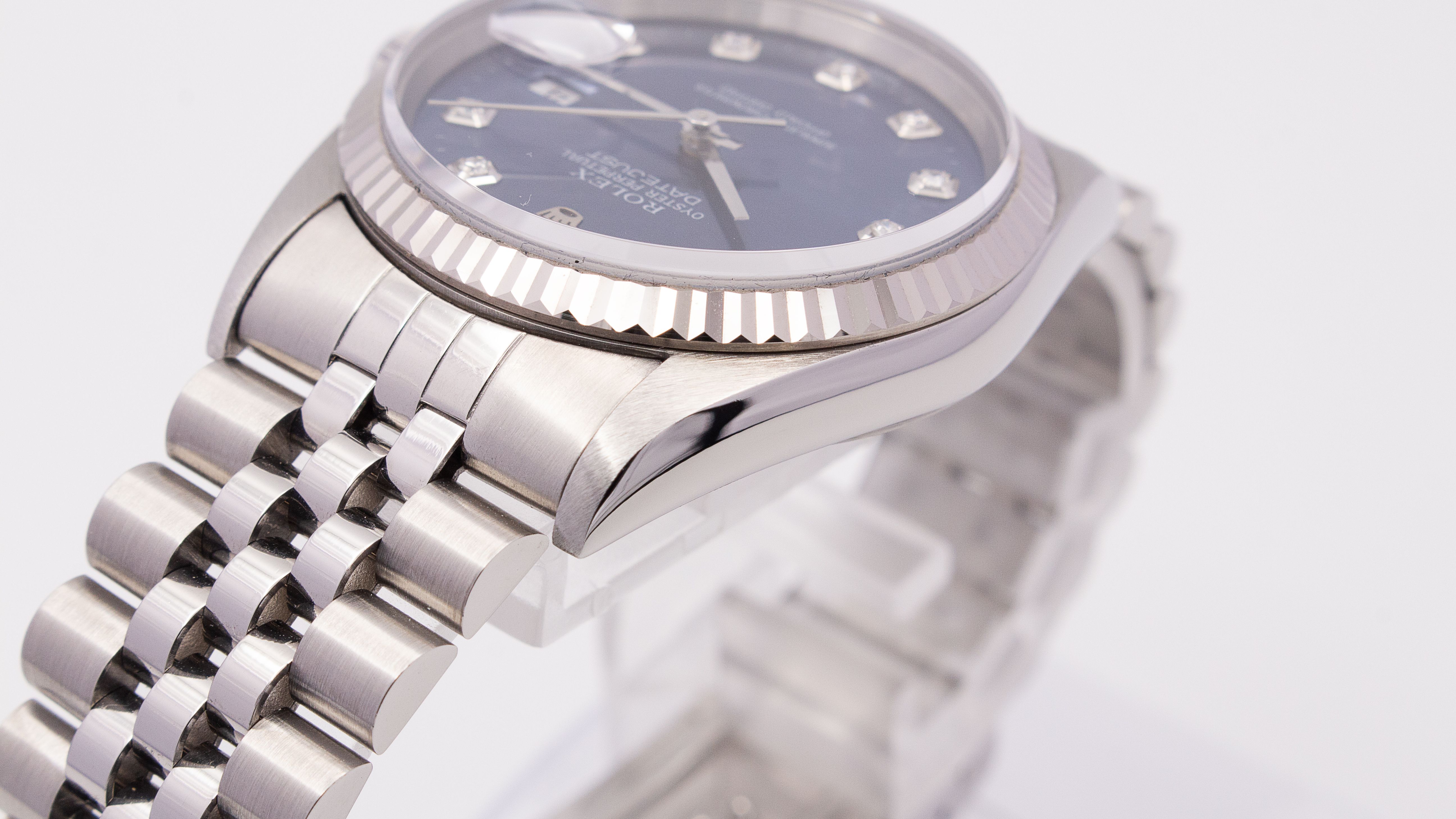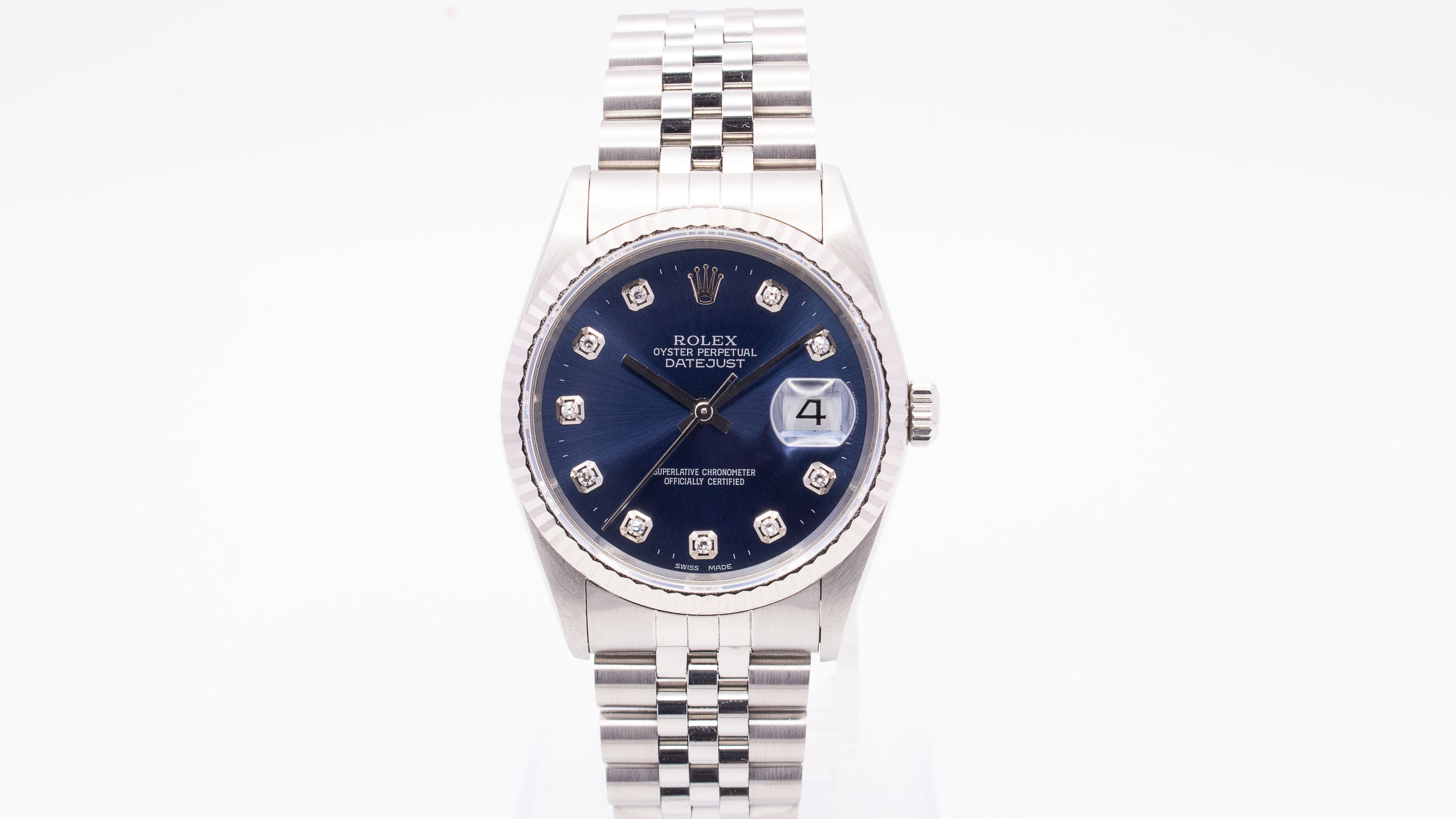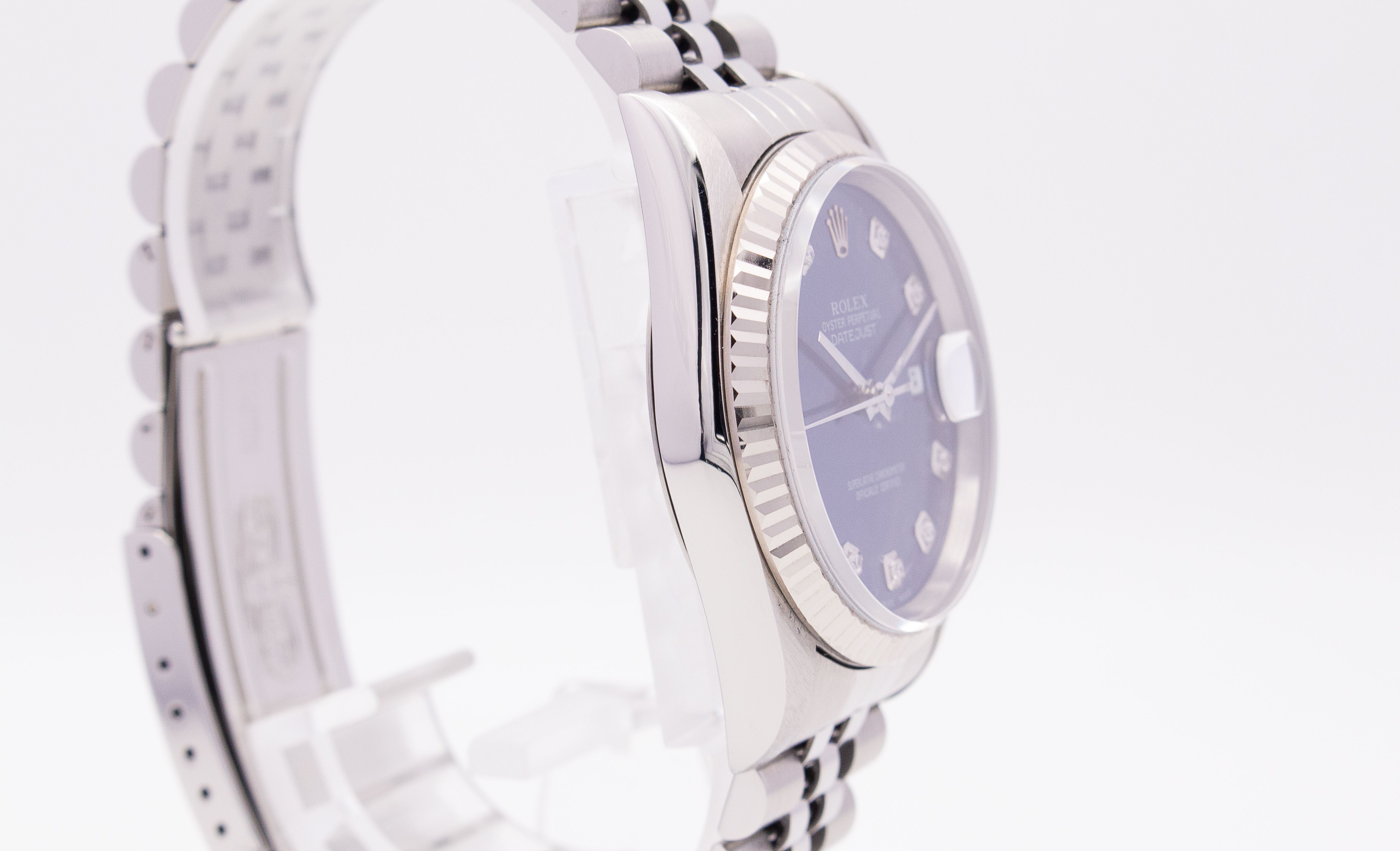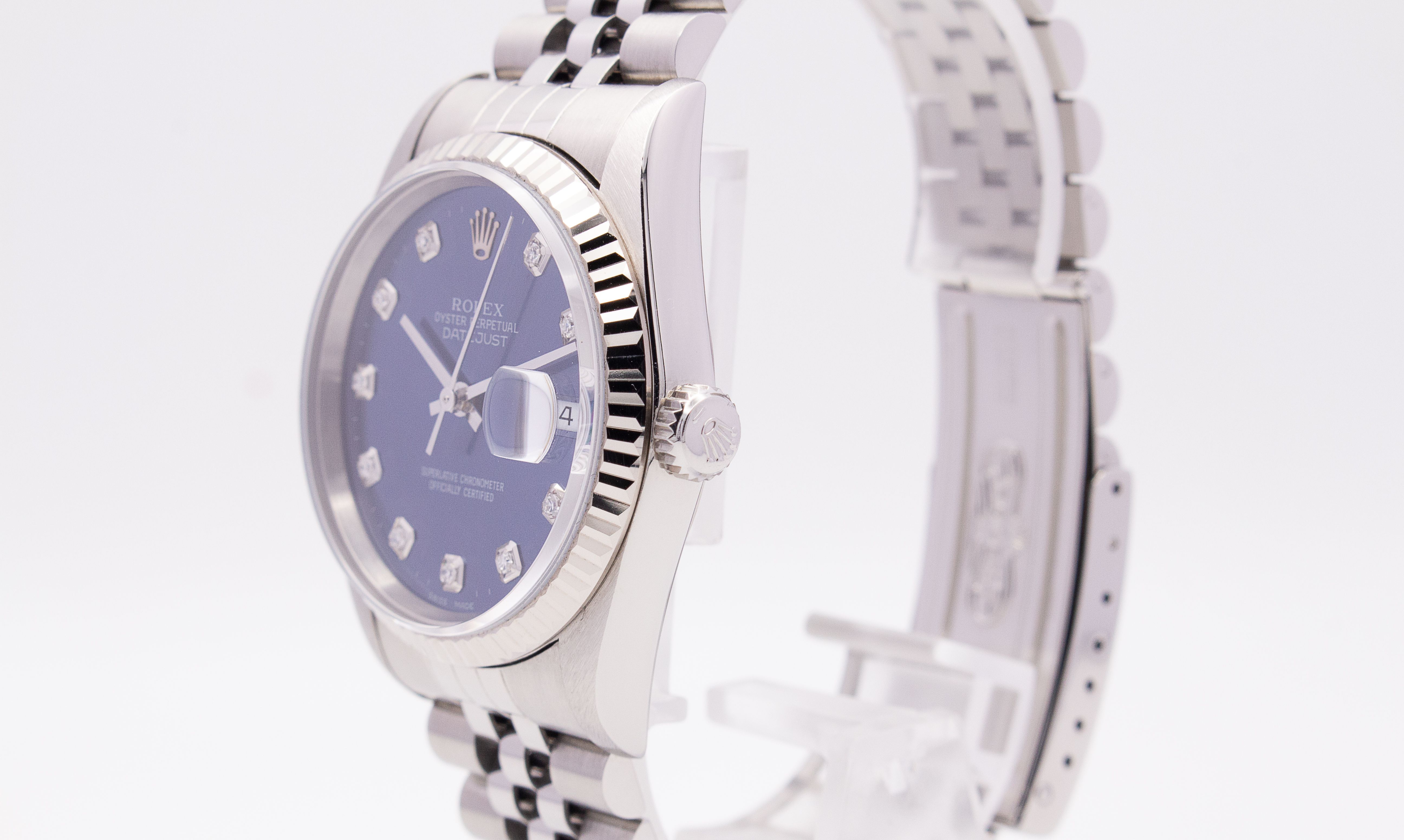 Está à venda uma extraordinariamente bela Rolex Datejust 36, Ref. 16234, com mostrador azul de diamante, em conjunto completo.