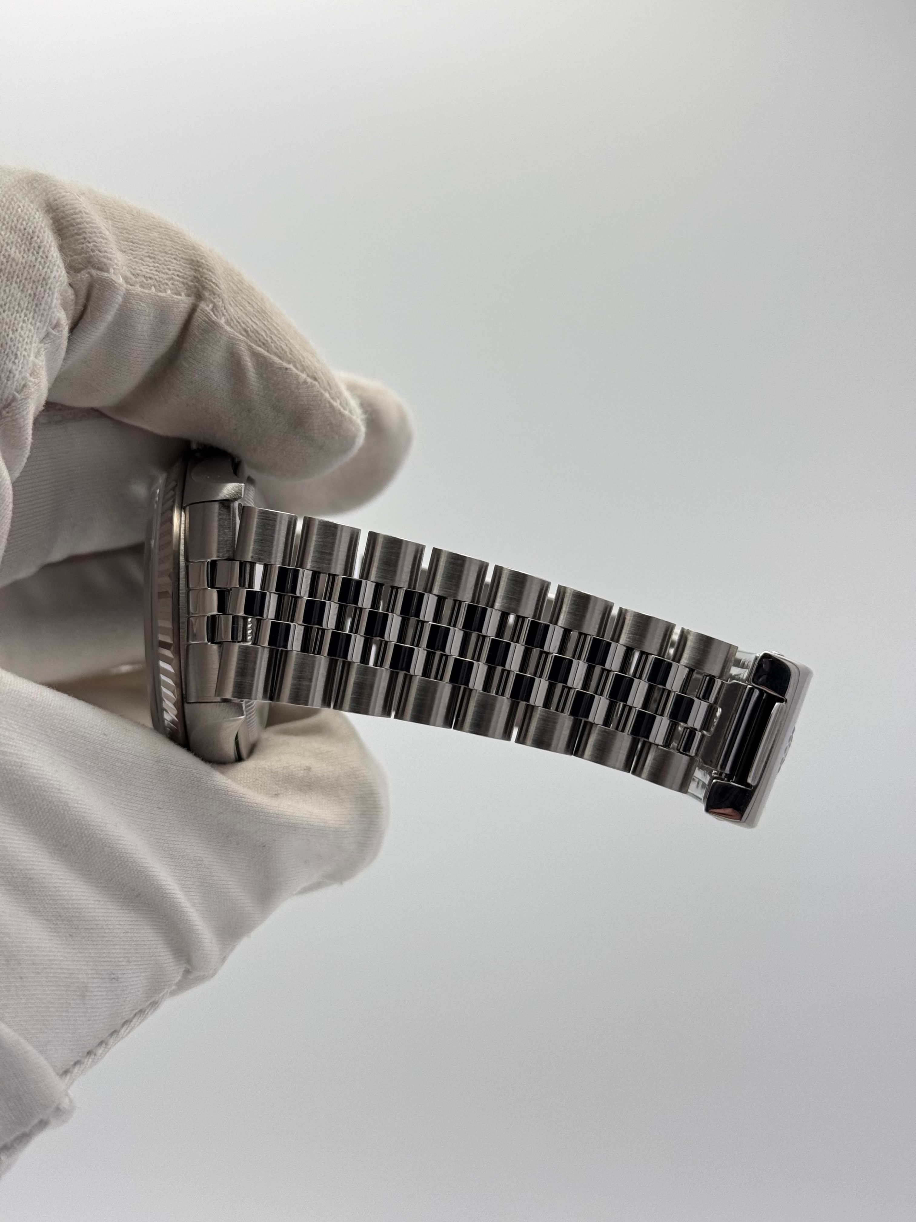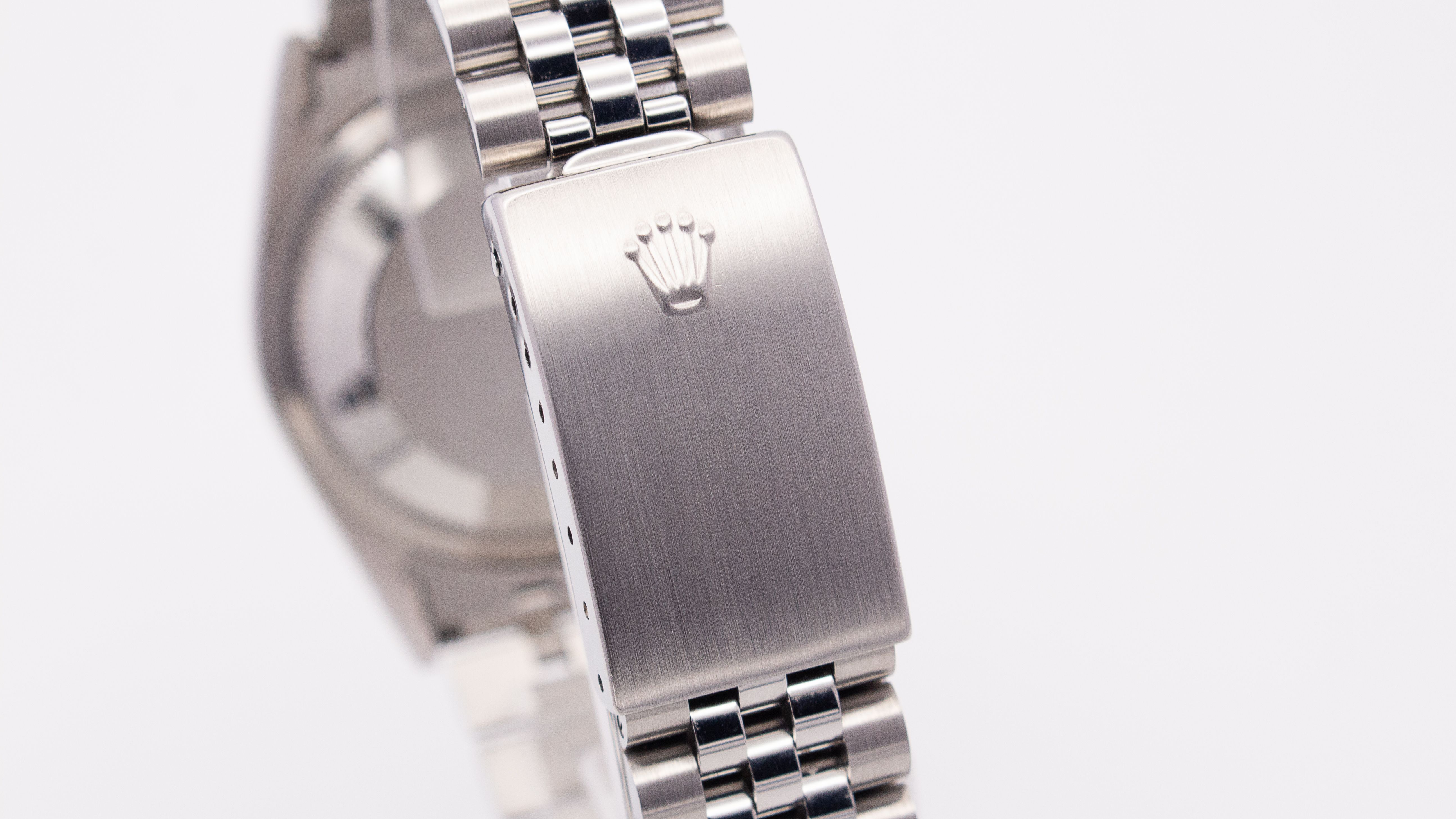 Das Jubilé-Band (Ref. 62510H) mit originalen 555B-Endlinks ist sehr gut erhalten. Die Schließe zeigt kaum Gebrauchsspuren; die gestanzte Rolex-Krone ist klar und scharf, ein deutlicher Hinweis auf geringe Politur. Alters- und bauarttypischer Stretch ist kaum vorhanden. Aktuelle Länge passend für Handgelenke bis ca. 18,5 cm; zusätzliche Glieder können ergänzt werden.