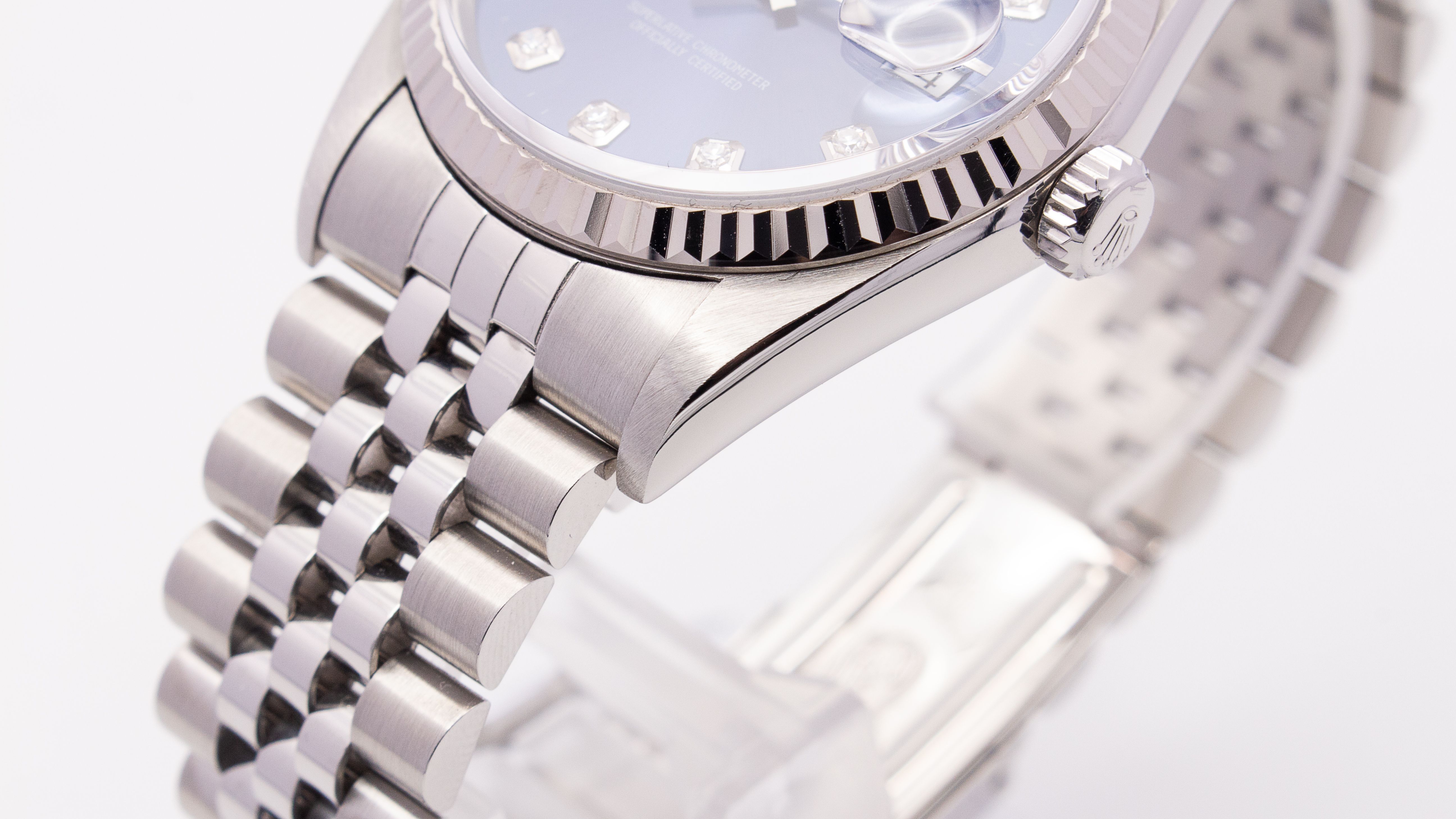 O mostrador azul com índices de diamante está em estado impecável, é facilmente legível e confere ao relógio uma aparência elegante, luxuosa e ao mesmo tempo atemporal.