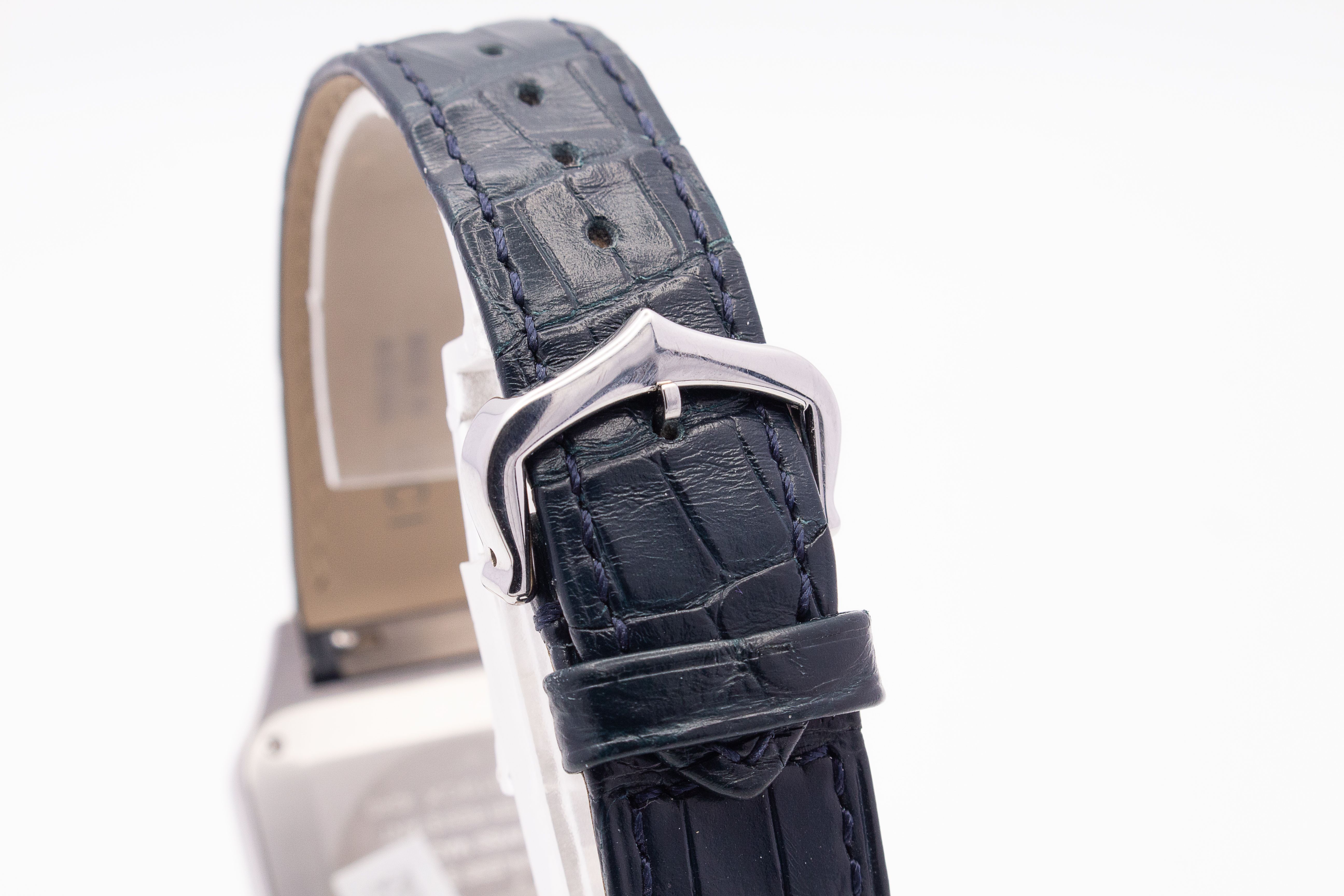 Das originale Cartier Lederarmband in Navy Blau befindet sich ebenfalls in sehr gutem Zustand mit nur leichten Tragespuren. Die Originalität ist eindeutig an den metallischen Bandanstößen auf der Rückseite erkennbar – ein wichtiges Detail, das insbesondere für anspruchsvolle Sammler relevant ist und bei vielen Uhren fehlt.