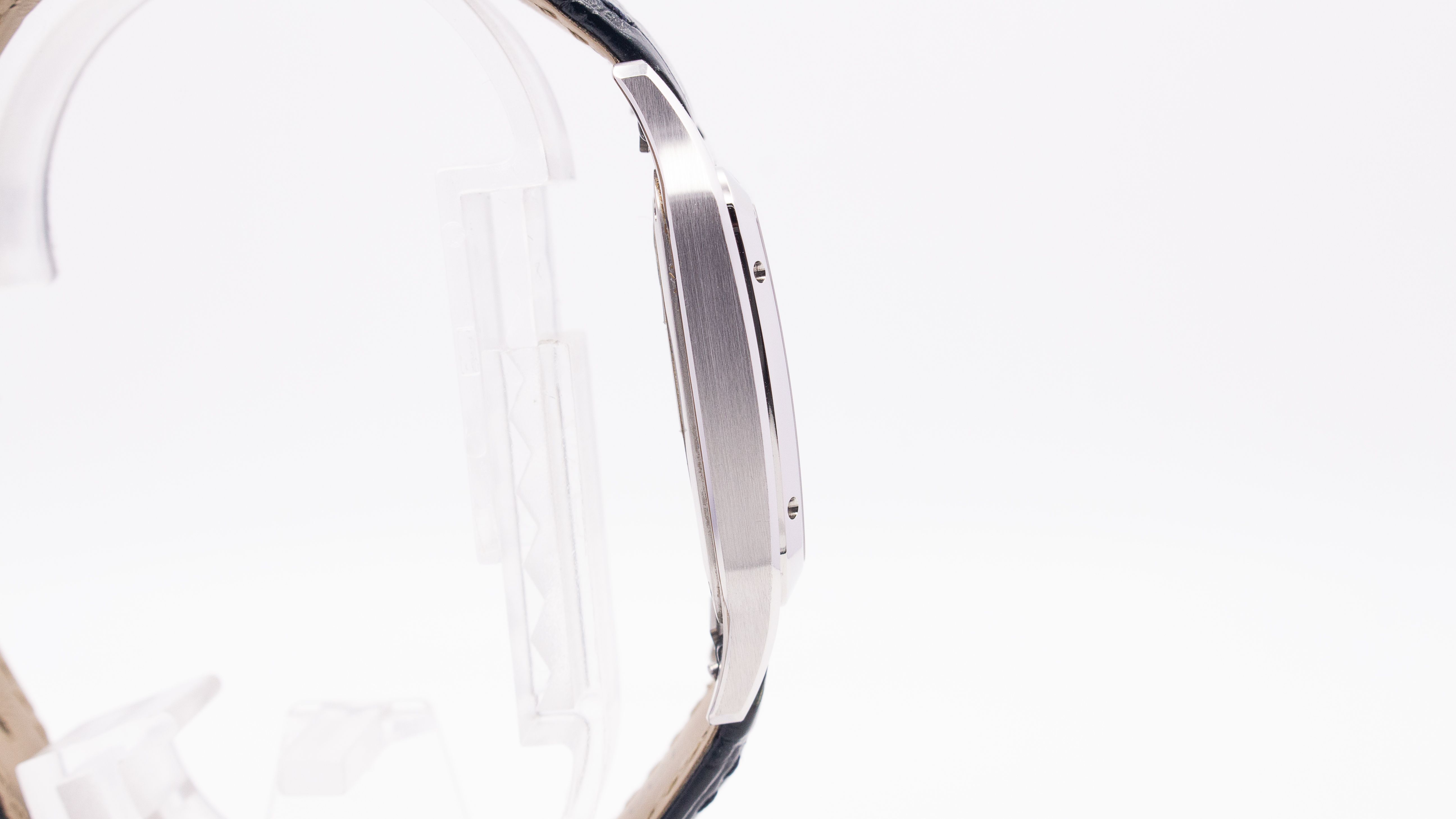 Das schlanke Edelstahlgehäuse überzeugt durch seine klaren Kanten und sauberen Flächen. Auf den polierten Bereichen sind feine Hairlines erkennbar, die bei normalem Tragen nicht ausbleiben und keinerlei Wertminderung darstellen. Keine tiefen Kratzer, keine Beschädigungen – insgesamt ein sehr gepflegter Eindruck.
