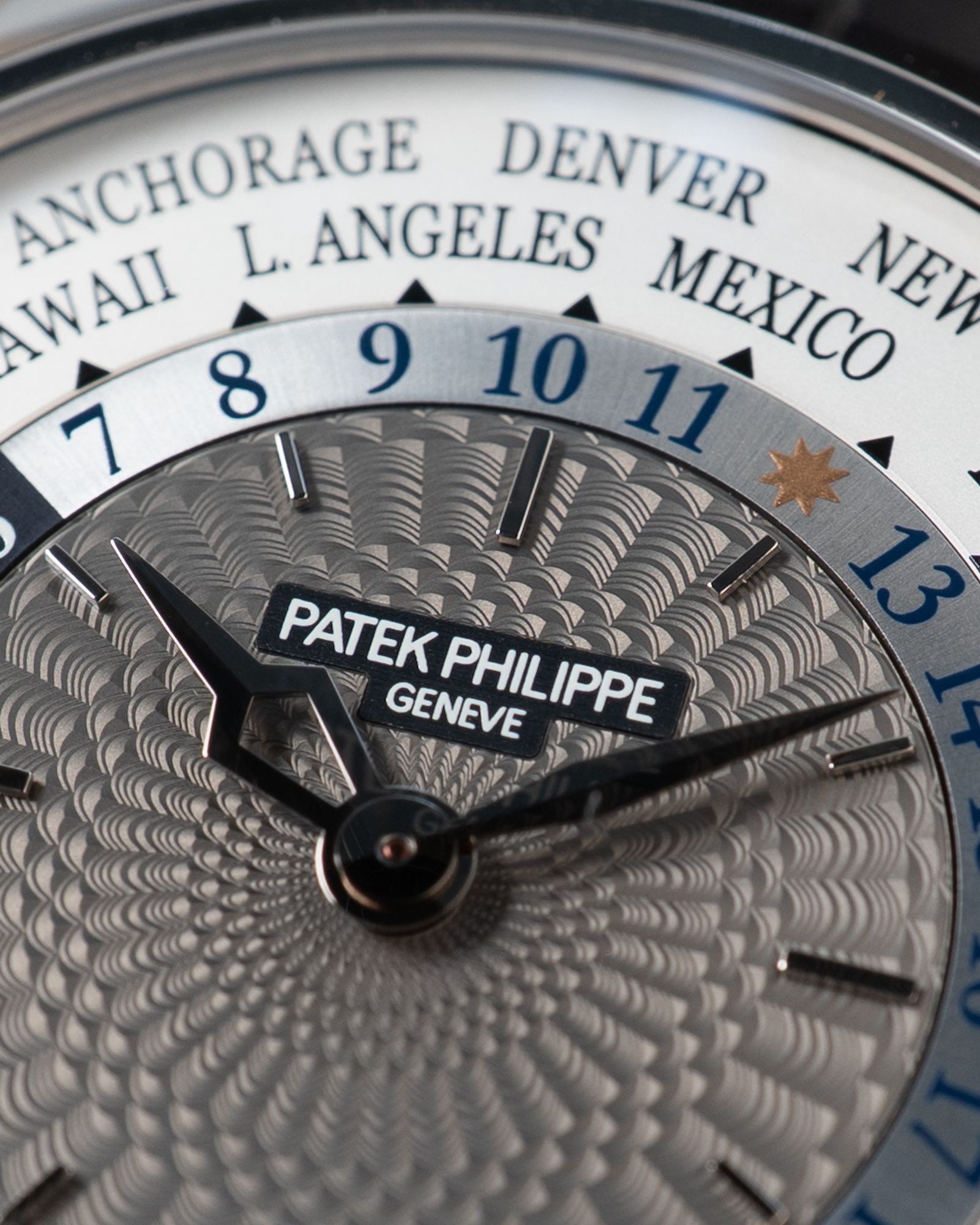 O 5230G é uma aula de elegância discreta. Seu mostrador com guilhoché feito à mão, gravado em uma tradicional máquina de roseira, exibe um jogo hipnotizante de luz e textura que apenas a Patek Philippe consegue alcançar. A complicação de horário mundial permite a leitura simultânea de todos os 24 fusos horários, ajustados de forma fácil através do discreto botão às 10 horas — um triunfo técnico e estético enraizado no legado lendário da maison.