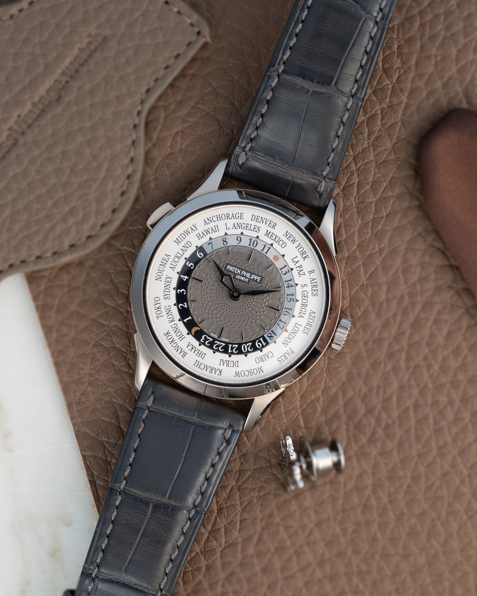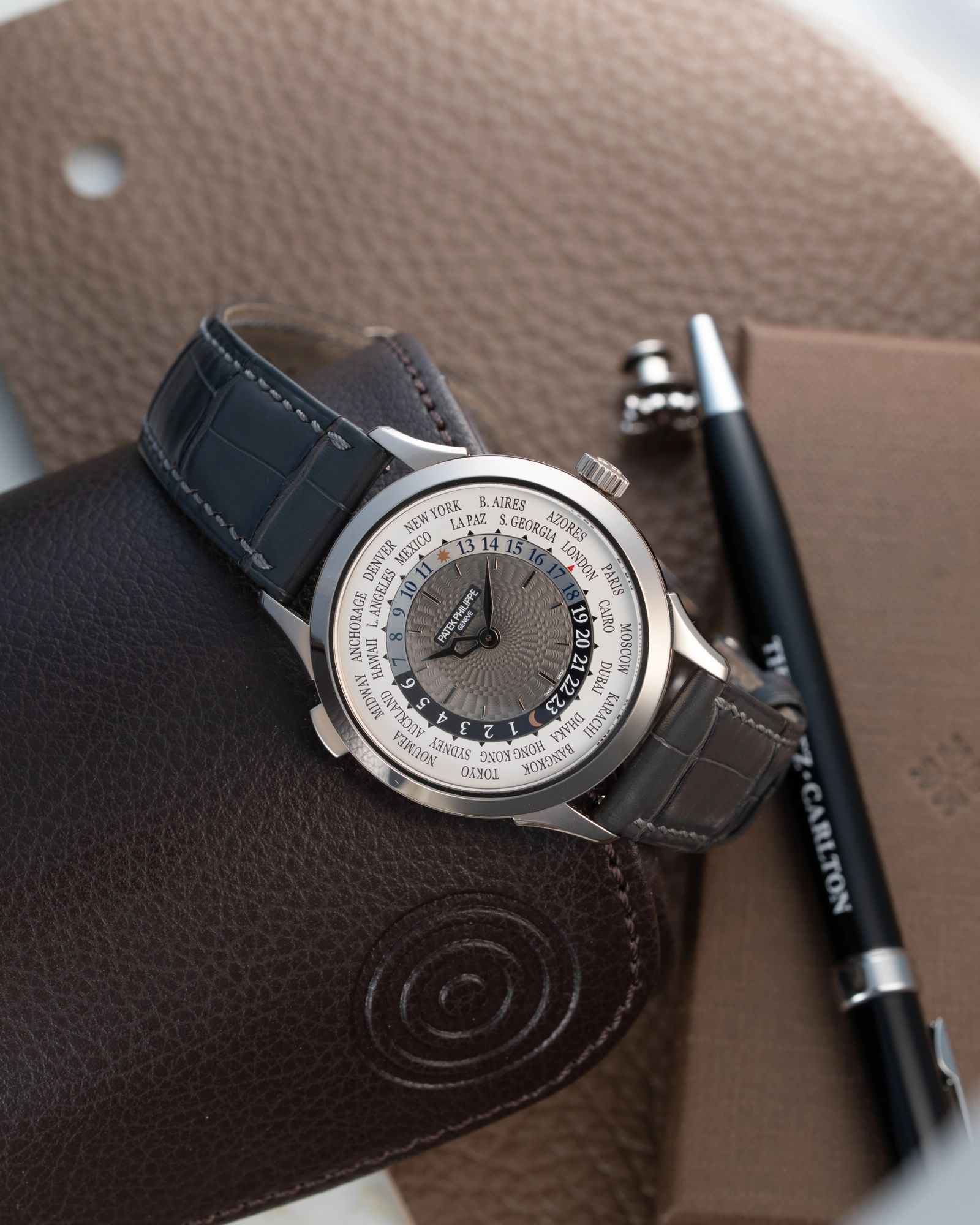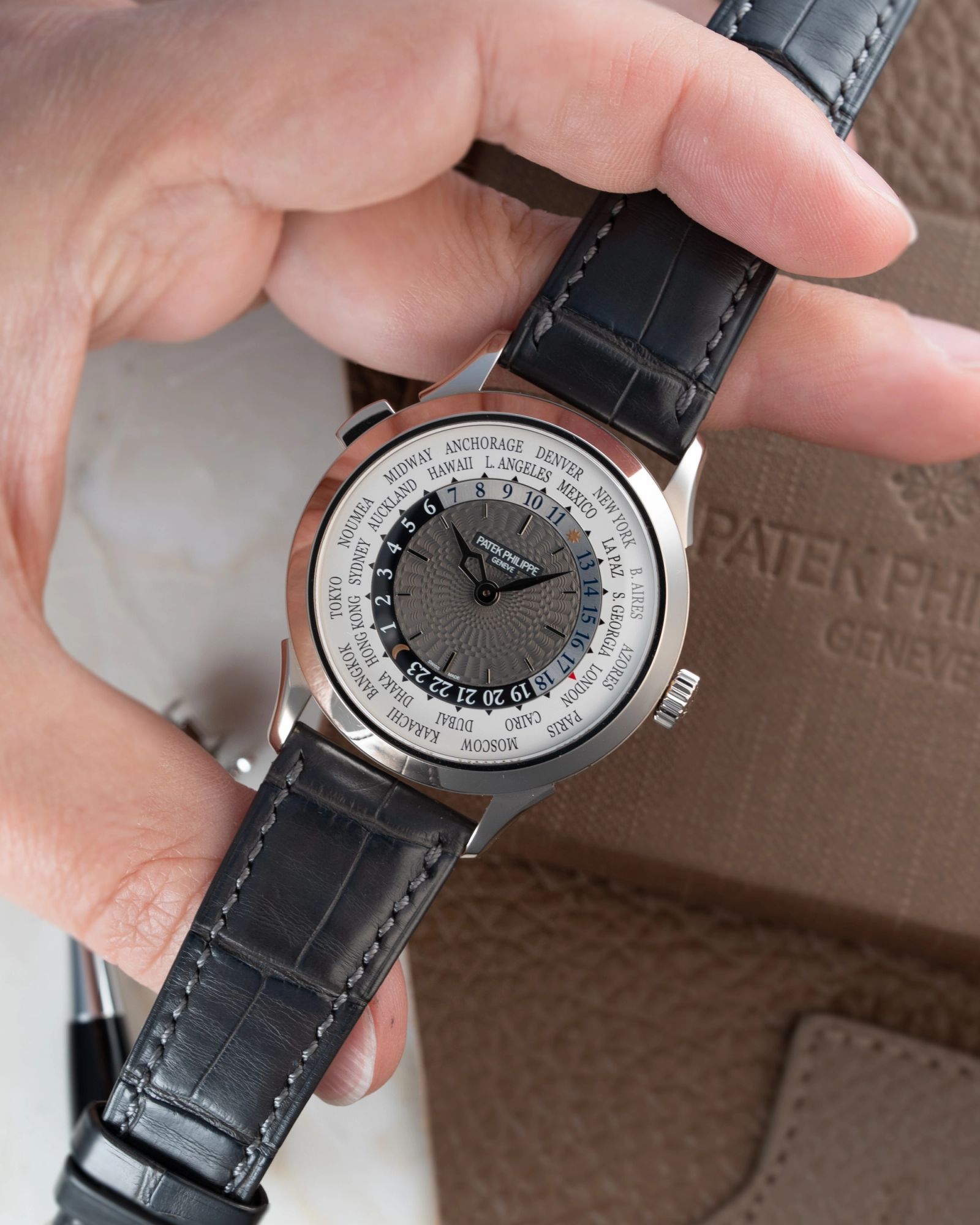 Presenting the Patek Philippe World Time Ref. 5230G, offered here in mint condition and accompanied by its original box and papers, originally sold in 2016.Crafted in 18K white gold, the 38,5mm case wears incredibly comfortable. Fitted to the case is a grey leather strap by Patek Philippe, which is in excellent condition, featuring the beautiful white gold clasp with calatrava symbol.