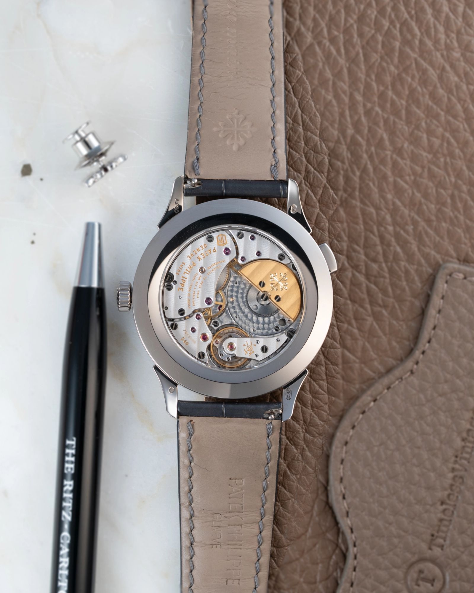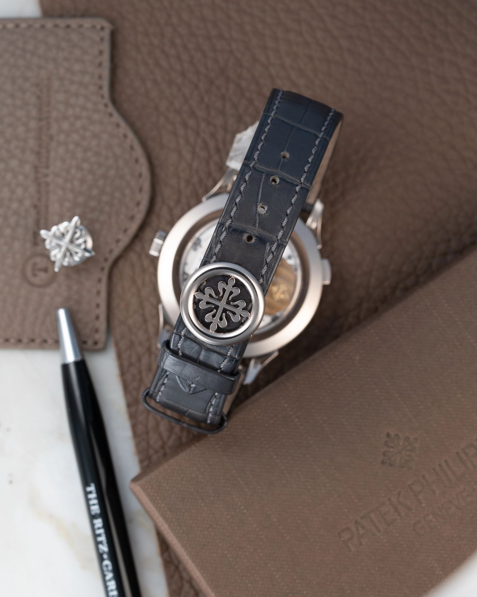 Feito em ouro branco 18K, o estojo de 38,5mm é incrivelmente confortável. Preso ao estojo está um bracelete de couro cinza da Patek Philippe, que está em excelente estado, apresentando o belo fecho em ouro branco com o símbolo Calatrava.