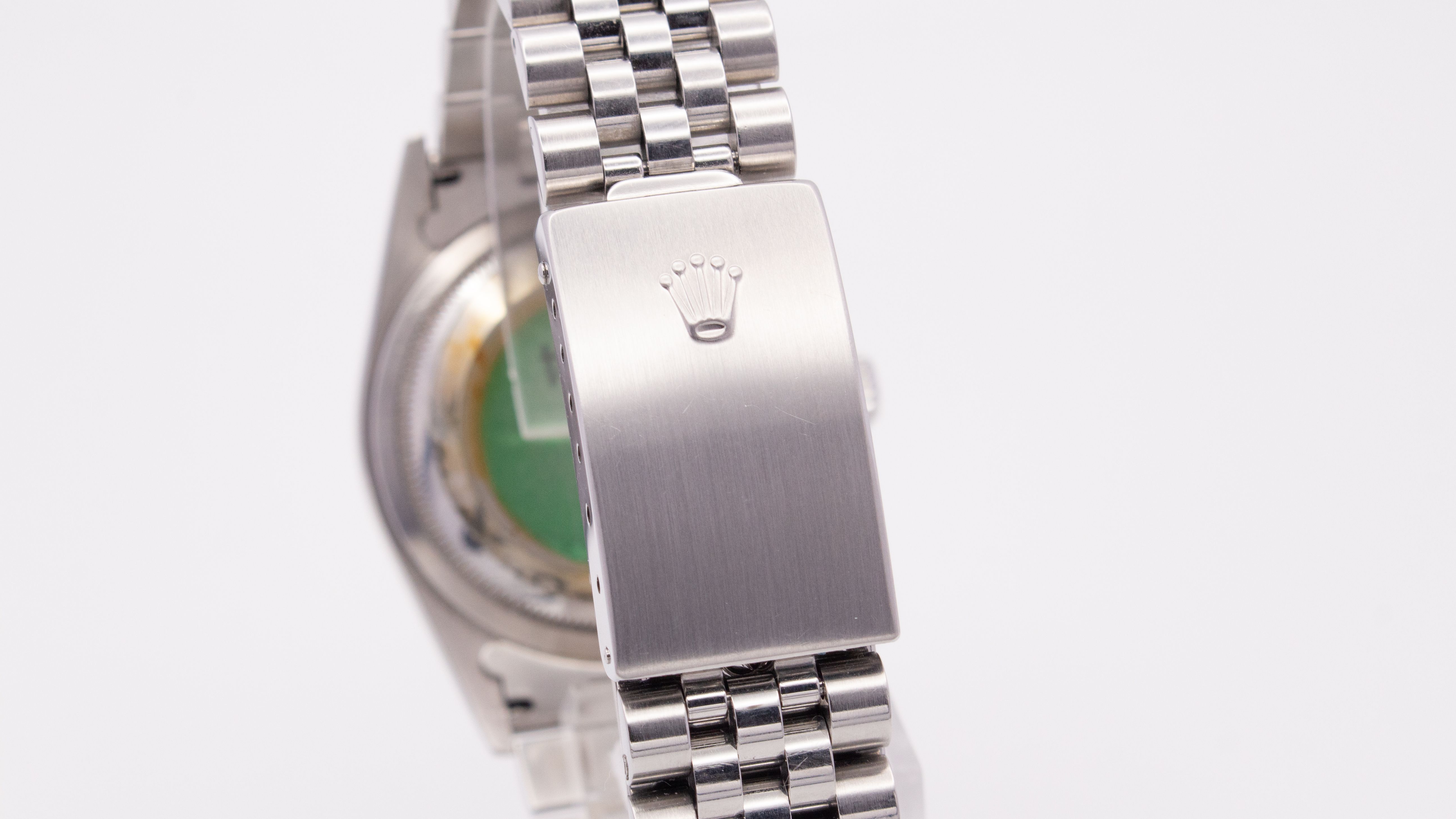 Das originale Jubilee-Armband (Ref. 62510H) mit passenden 555B-Endgliedern sowie die Schließe befinden sich ebenfalls in sehr gutem, unpoliertem Zustand. Altersbedingte Tragespuren an Band und Schließe sind vorhanden. Die gestanzte Rolex-Krone auf der Schließe ist außergewöhnlich klar und scharf ausgeprägt – ein weiteres starkes Indiz für den unpolierten Zustand. Der bauart- und altersübliche Stretch ist vorhanden, bewegt sich jedoch noch absolut im Rahmen.