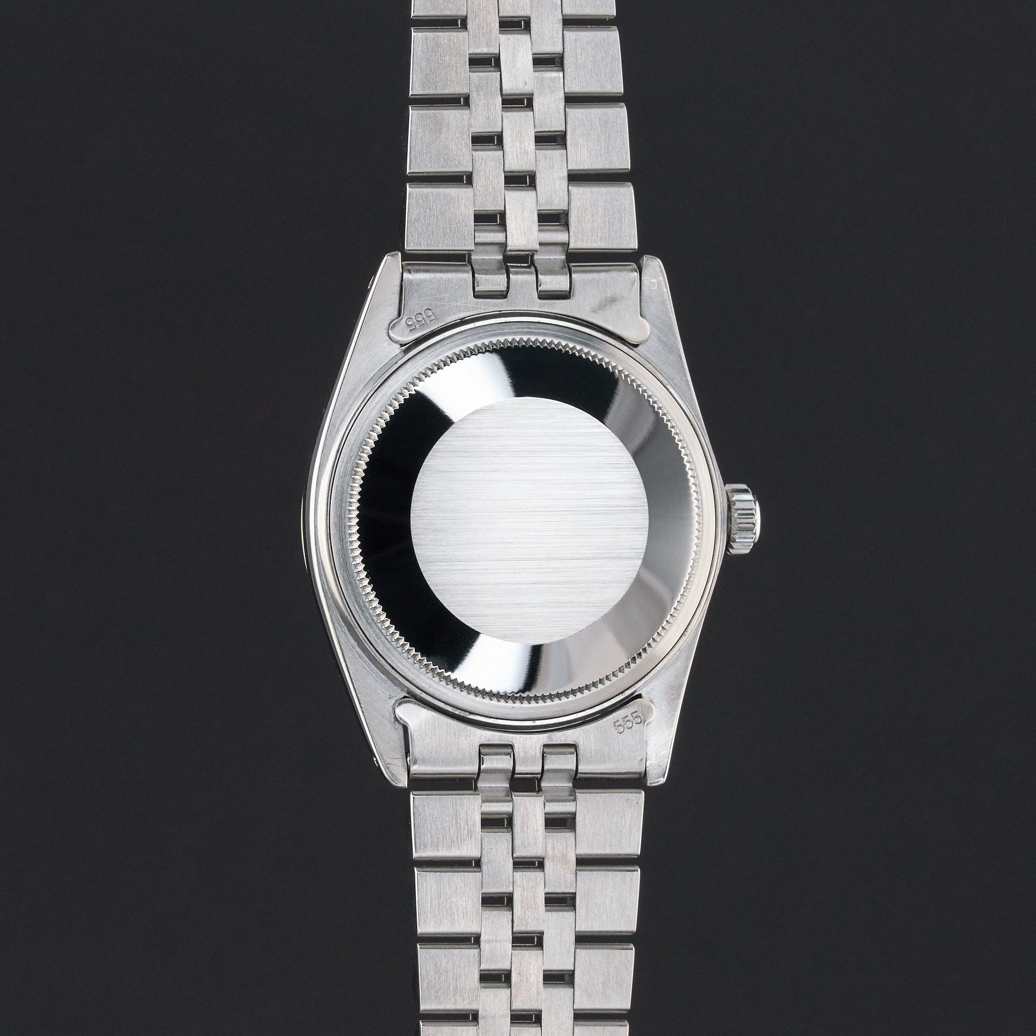 Este Rolex Datejust 16014 apresenta um mostrador cinza e é feito de aço inoxidável, com ano de produção de 1985.