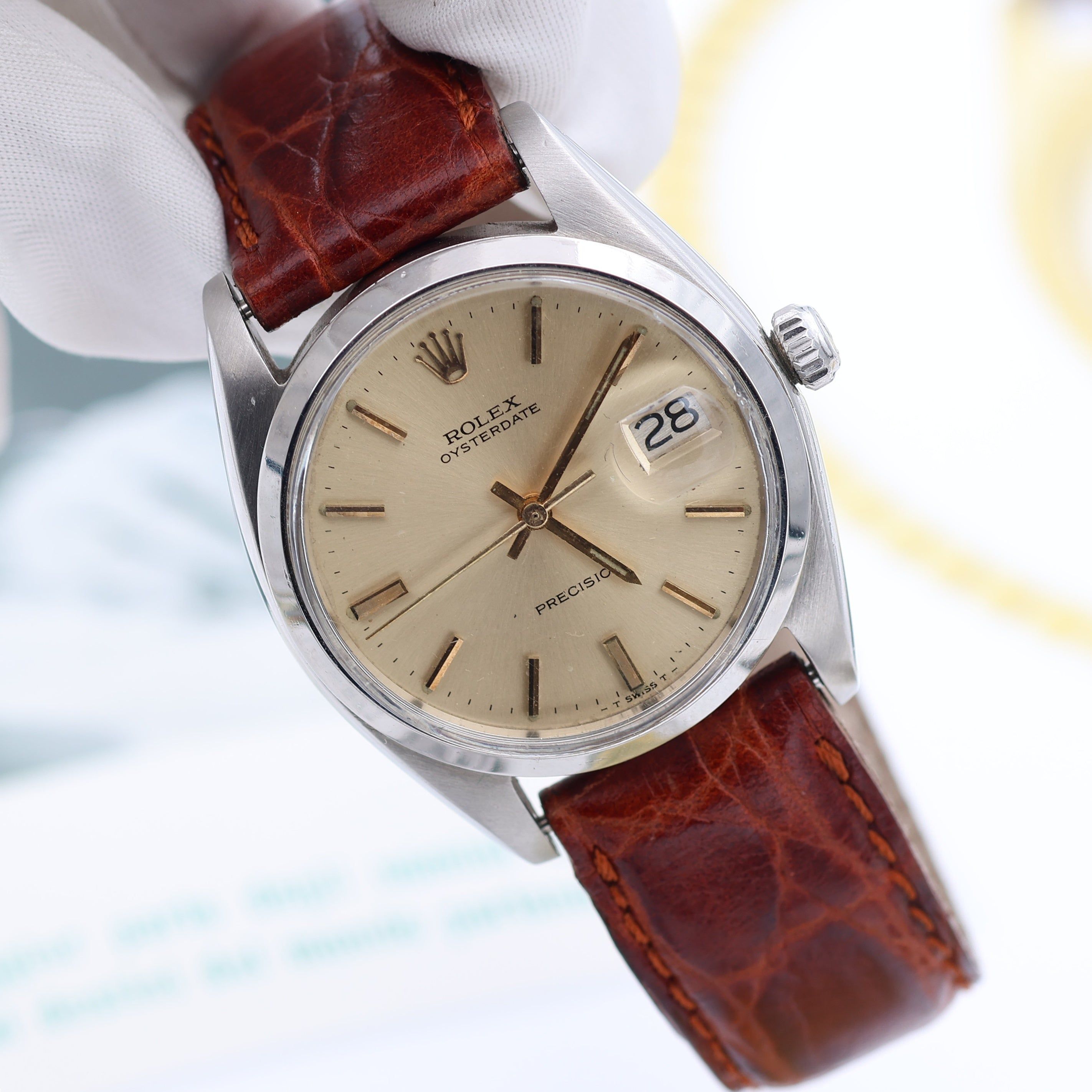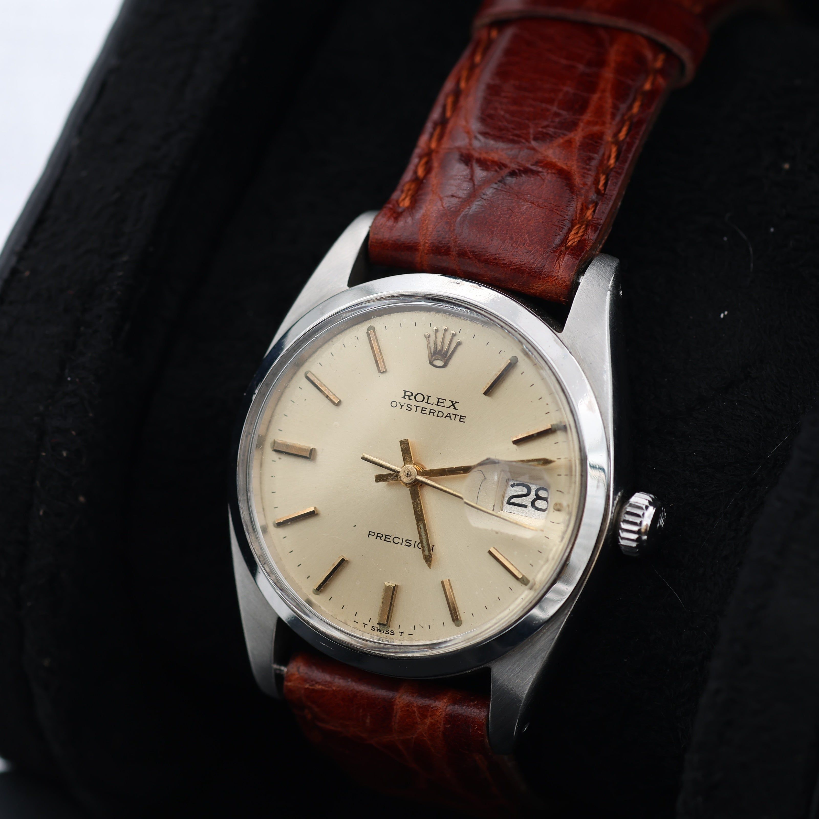 For sale at Debonar Watches: pre-owned Rolex Precision Date ref. 6694 from the '70s, with a fantastic silver dial with golden indexes, on a generic leather strap. This ROLEX can be an extremely classic fit for both him and her. The Precision model has always represented the ROLEX entry level range, sporting a 34mm case, the usual Oyster case with a thick plexiglass that stands out of the bezel, the instantly recognizable cyclope glass placed at three o'clock and a manual wind calibre. A bit of its story:The Precision reference 6694 began in the early 1960s and ran on with great success until it was discontinued at the end of the 1980s, earning it the distinction of being Rolex’s last manual-wind watch.Throughout that period, the Rolex Oysterdate Precision 6694 was one of the brand’s most popular models, occupying a budget-friendly option that still offered Rolex’s signature date display at 3 o’clock. Easily confused with the Oyster Perpetual and Oyster Perpetual Date, the Oysterdate is actually missing the “Perpetual” label in its name, to point out that it was one of the rare examples from Rolex that was not self-winding. BRAND ROLEX MODEL PRECISION DATE REFERENCE 6694 CASE MATERIAL STEEL MOVEMENT MANUAL WINDING DIMENSION 34 MM DIAL SILVER W/ GOLDEN INDEXES BEZEL STEEL CRYSTAL PLEXIGLASS BRACELET TYPE STRAP (GENERIC) BRACELET MATERIAL LEATHER BRACELET LENGHT 16-18 CM ORIGINAL BOX NO ORIGINAL PAPERS NO YEAR AROUND '70s CONDITION VERY GOOD
