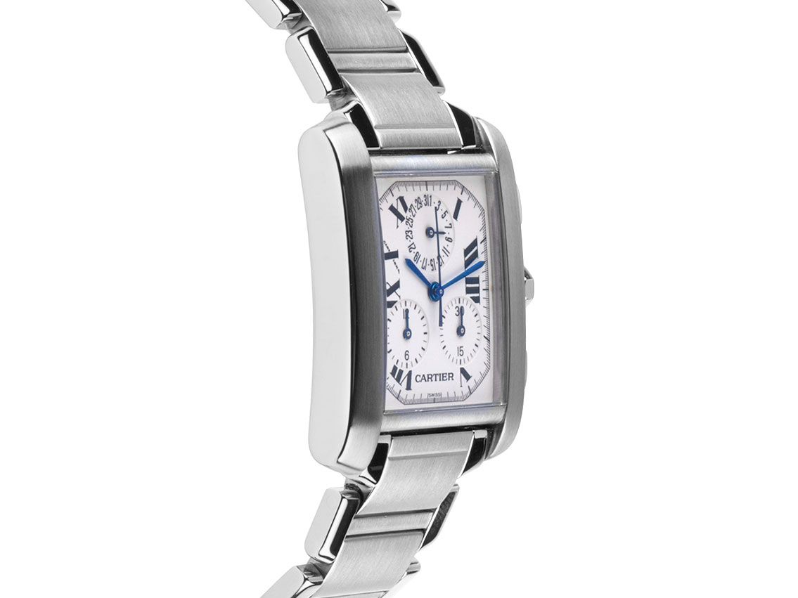 Cartier Tank Francaise GM Großes Modell Stahl Quarz Chronograph Armband StahlGehäuse Edelstahl poliert und satiniert, Gehäusemaße ohne Krone (L x B x H) 36 x 28 x 6,7mm. Armband Edelstahl poliert und satiniert, verdeckte Doppelfaltschließe Edelstahl. Zifferblatt cremeweiß mit schwarzen römischen und arabischen Ziffern und gebläuten Zeigern. Uhrwerk quarzgesteuert, Chronograph, Kaliber Cartier 212P mit 25 Edelsteinen. Anzeige von Stunde und Minute über Zeiger aus der Mitte, Datumsanzeige über Zeiger bei 12 Uhr. Saphirglas kratzfest. Krone mit blauem Spinell Cabochon. Boden Edelstahl 4-fach verschraubt und graviert. Gewicht der Uhr inklusive Armband 90g, Länge des Armbandes inklusive Gehäuse 155mm. Referenznummer: 2303, Gehäusenummer: BB22XXX, Baujahr: 2004, ID: P243651980126RE-6200, Artikelnummer: 10000084593. Mit Gangkontrolle und kompletter äußerlicher Aufarbeitung von Januar 2026. Original Cartier Box mit Umkarton sowie Beschreibung und Watchregister Auszug von Januar 2026, The Watch Register Zertifikat / ohne Eintrag (Internationale Datenbank für verlorene oder gestohlene Uhren). Superschnäppchen. Sehr guter Zustand. Lieferzeit sofort.